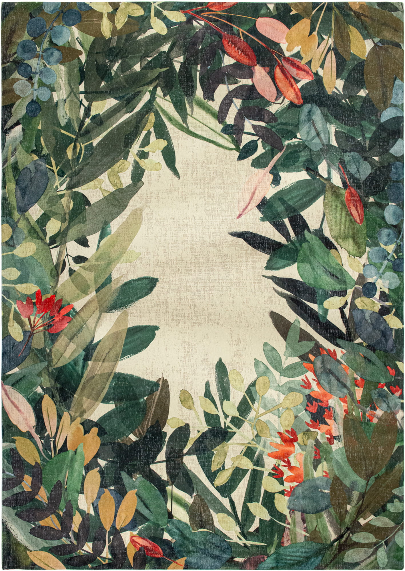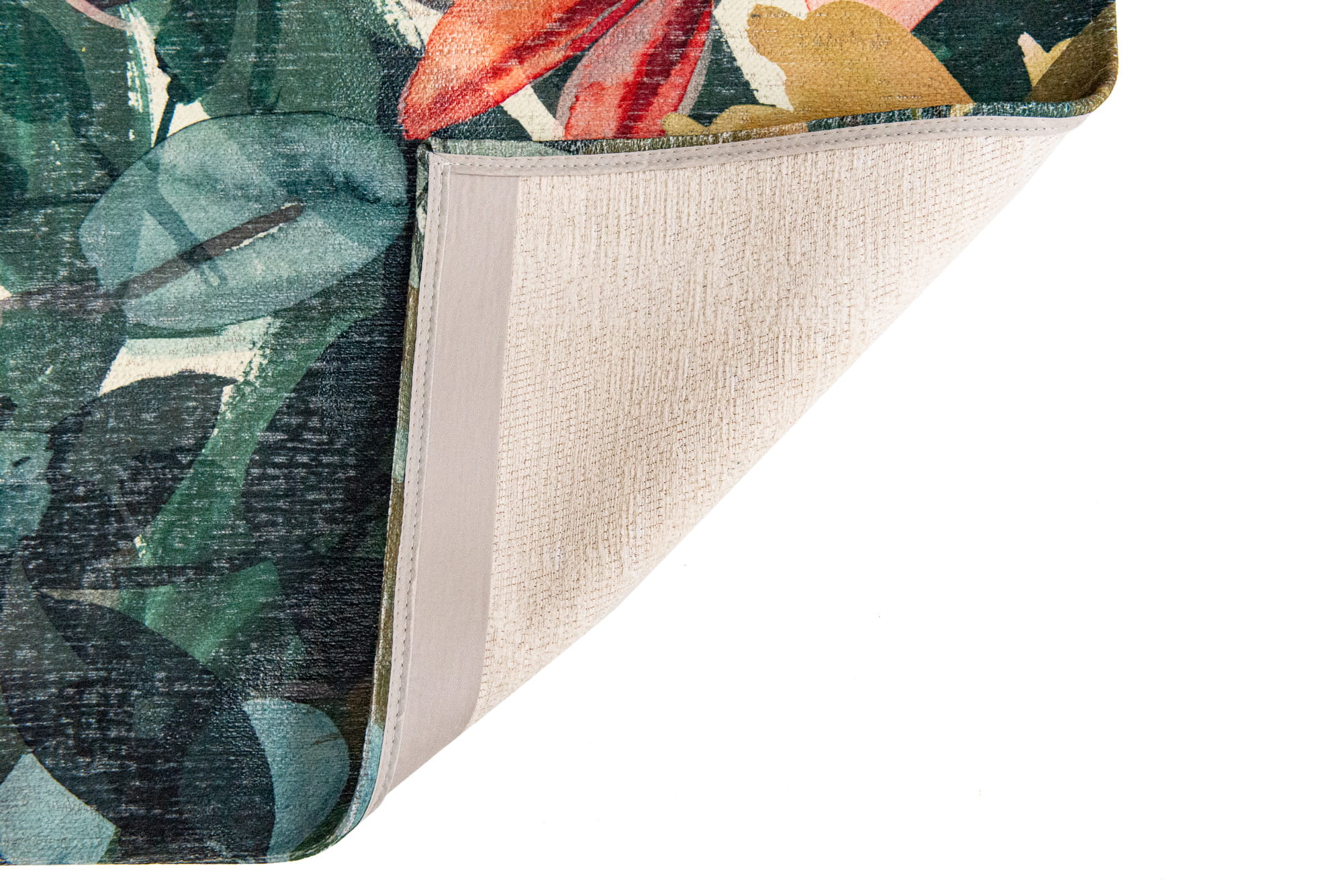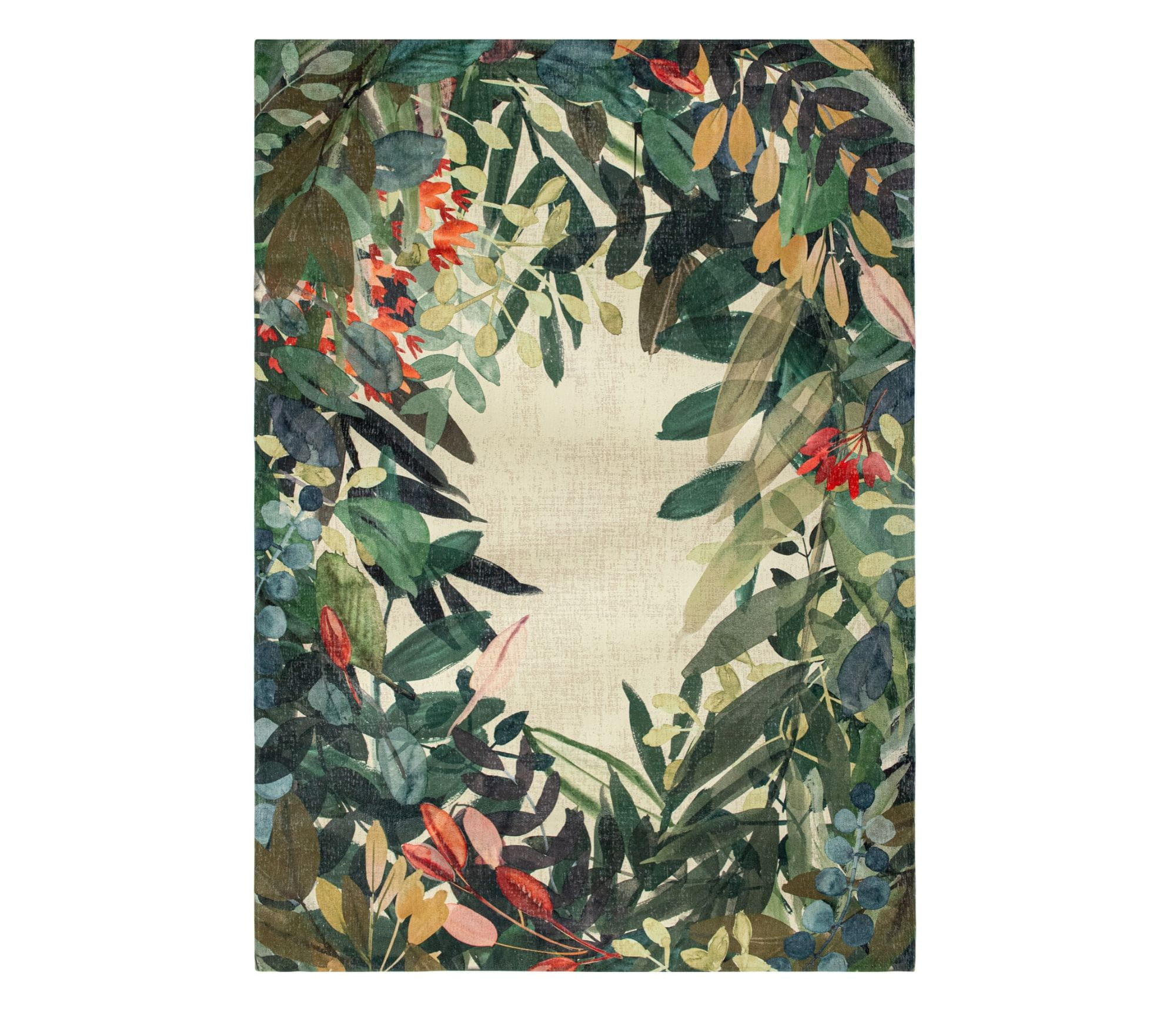Dywan w kwiaty ukazuje nowe oblicze meksykańskiej kultury i sztuki. To połączenie żakardowo plecionego podłoża z nadrukiem transferowym, co pozwala uzyskać bardzo detaliczny wzór, zapewniając doskonałą wytrzymałość oraz większą niż w grubych dywanach odporność na odkształcenia pod ciężarem mebli. Ręcznie malowane liście i kwiaty nakładają się na patynowe tło ukazując delikatne przebłyski koloru elementów znajdujących się pod spodem.