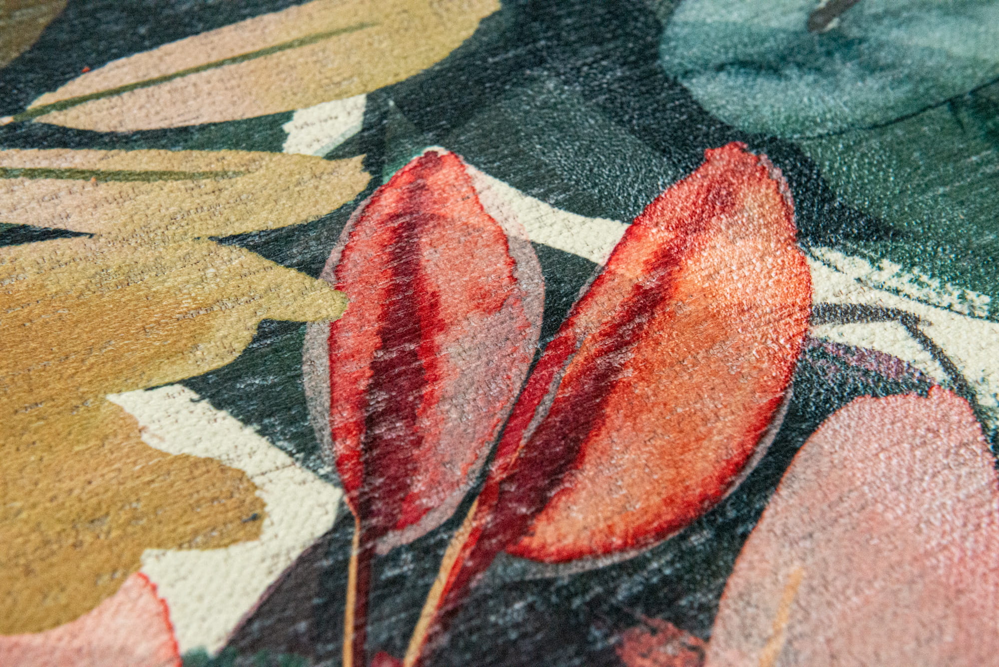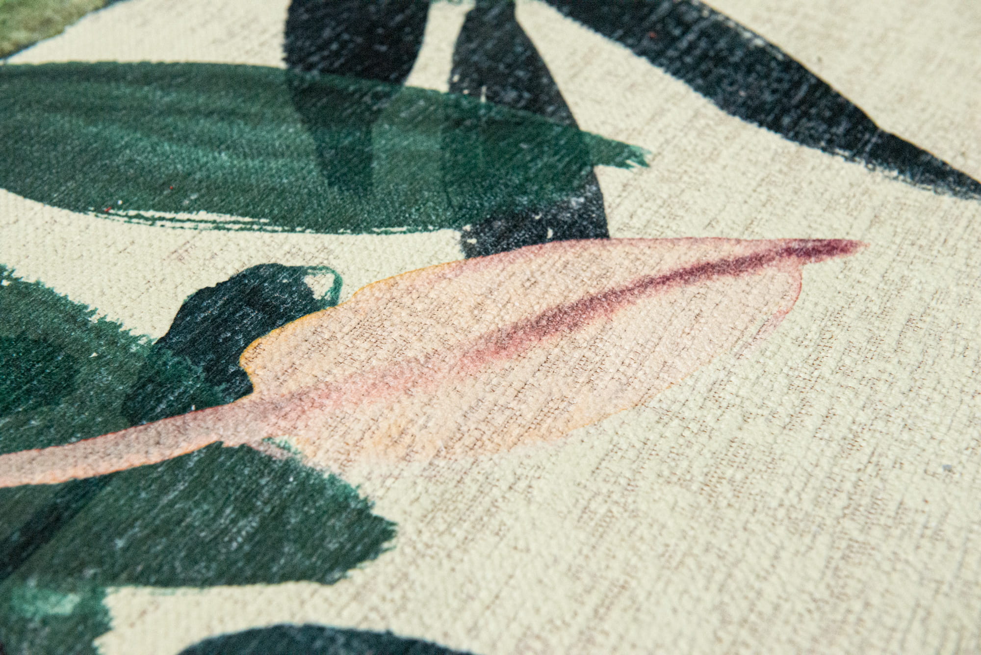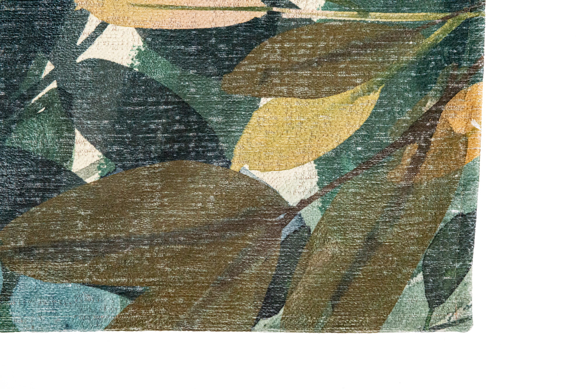 Dywan w kwiaty ukazuje nowe oblicze meksykańskiej kultury i sztuki. To połączenie żakardowo plecionego podłoża z nadrukiem transferowym, co pozwala uzyskać bardzo detaliczny wzór, zapewniając doskonałą wytrzymałość oraz większą niż w grubych dywanach odporność na odkształcenia pod ciężarem mebli. Ręcznie malowane liście i kwiaty nakładają się na patynowe tło ukazując delikatne przebłyski koloru elementów znajdujących się pod spodem.