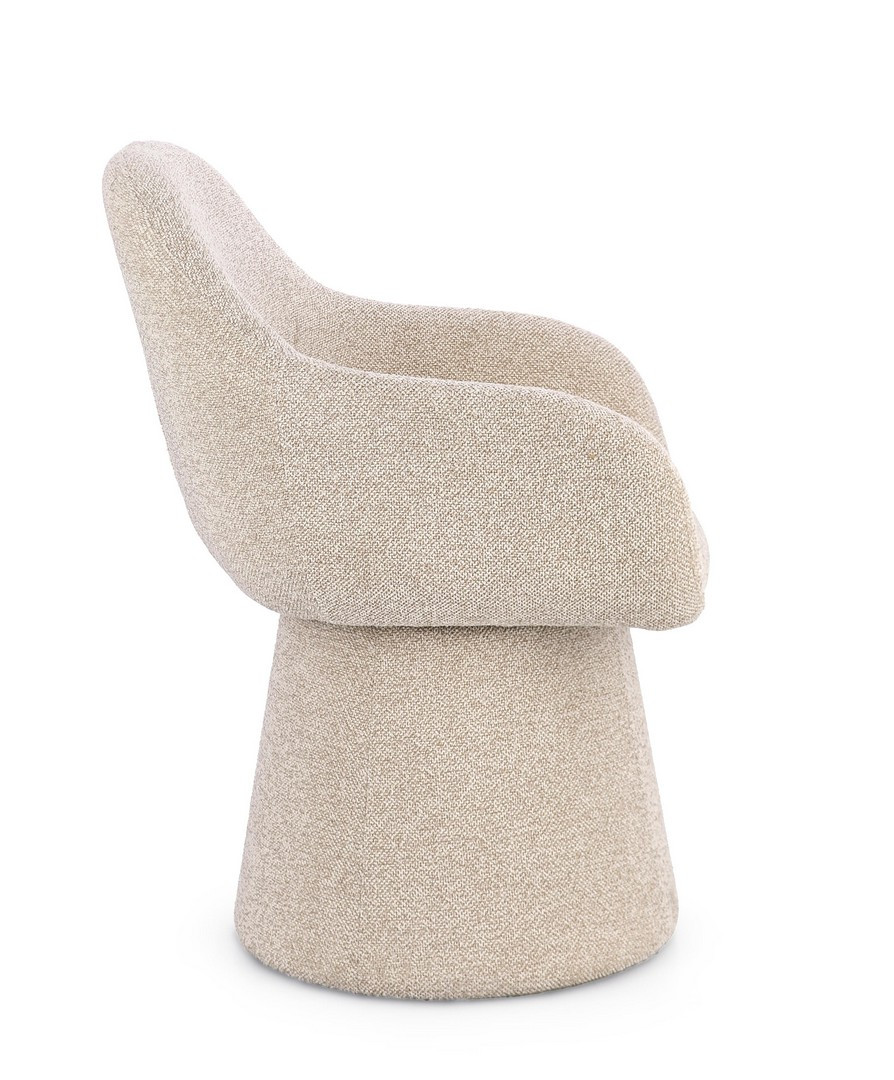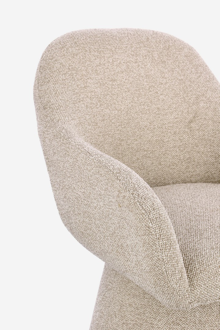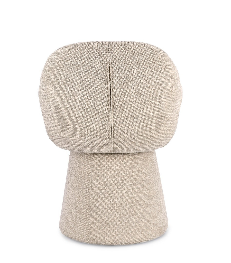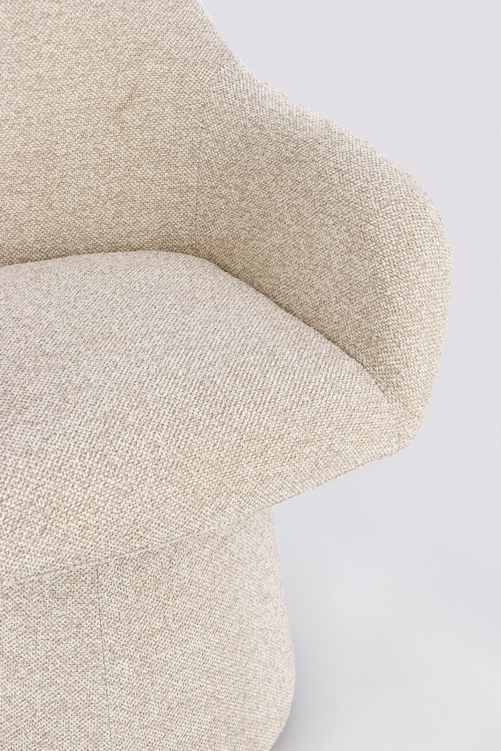 Fotel Antara to designerski mebel, który łączy opływową formę z maksymalnym komfortem. Jego kubełkowe, zaokrąglone siedzisko z delikatnie wygiętym oparciem spoczywa na masywnej, stożkowej podstawie, tworząc elegancką, monolityczną sylwetkę. Tapicerowany jest modną tkaniną bouclé w neutralnym, beżowym odcieniu, która dodaje wnętrzu przytulnej tekstury i wizualnego ciepła. Konstrukcja oparta na stali i sklejce oraz wypełnienie z pianki o wysokiej gęstości (28 kg/m³ na siedzisku) zapewniają trwałość formy i niezrównany komfort użytkowania.