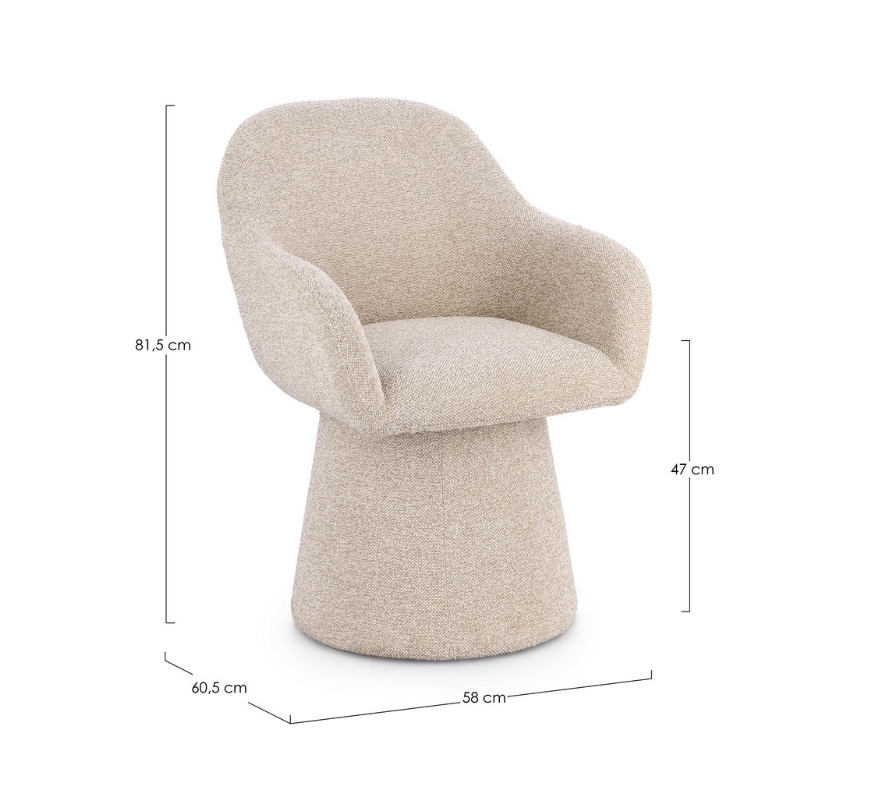 Obrotowa podstawa 360° jest praktycznym atutem, czyniącym fotel Antara idealnym do dynamicznych przestrzeni – biura, jadalni czy salonu. Kompaktowe wymiary (szerokość 58 cm) sprawiają, że doskonale nadaje się do mniejszych mieszkań, nie tracąc przy tym na efektowności. Neutralny beż doskonale wpisuje się w estetykę japandi, skandynawską i modern, łącząc włoską estetykę Bizzotto z funkcjonalnym i ergonomicznym wzornictwem. Jest to wytrzymały i stylowy fotel na lata.