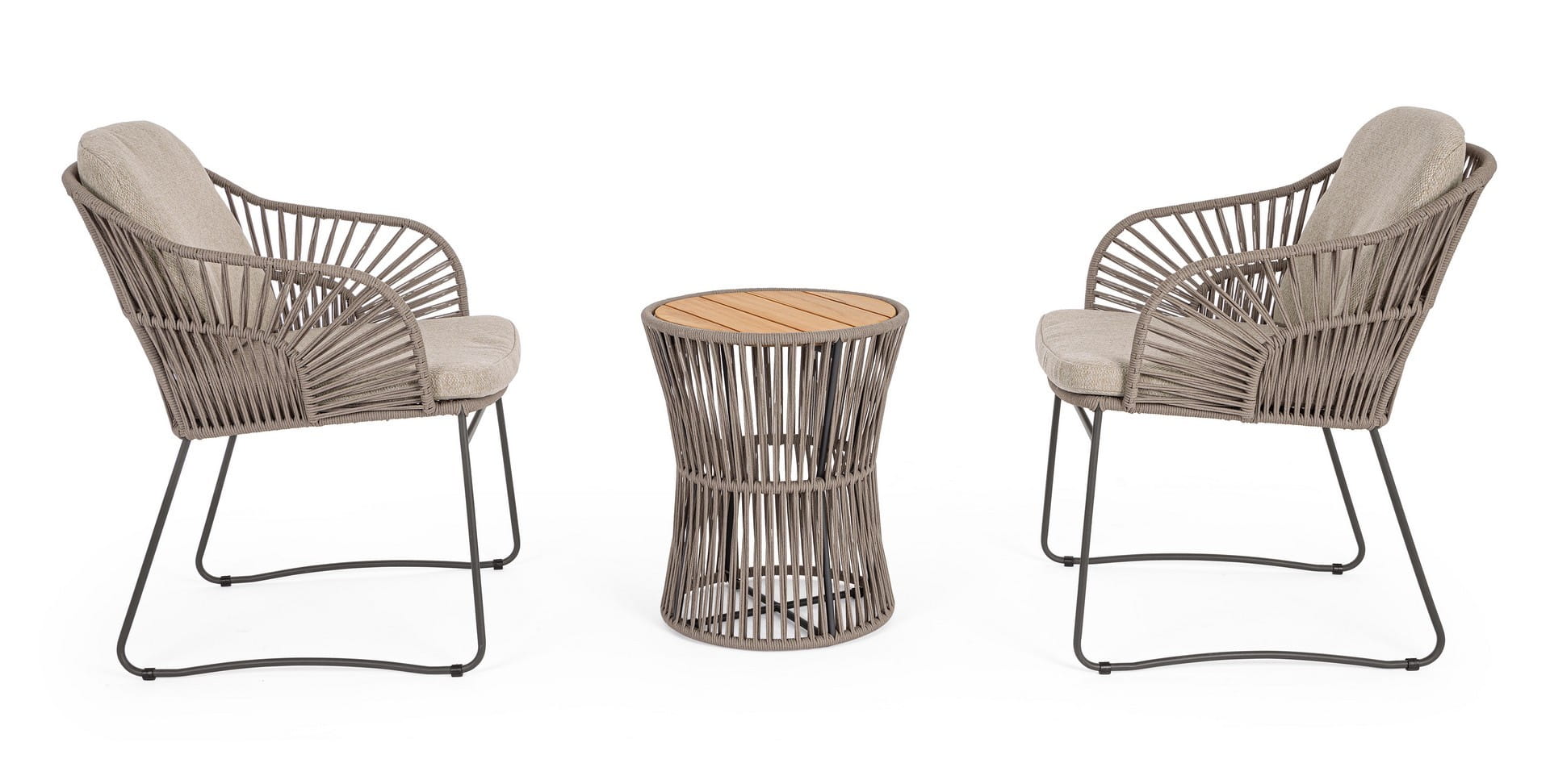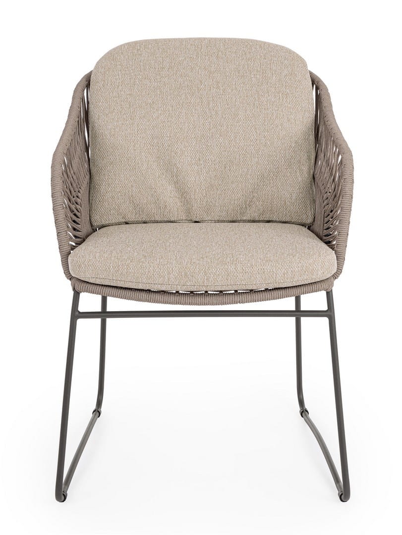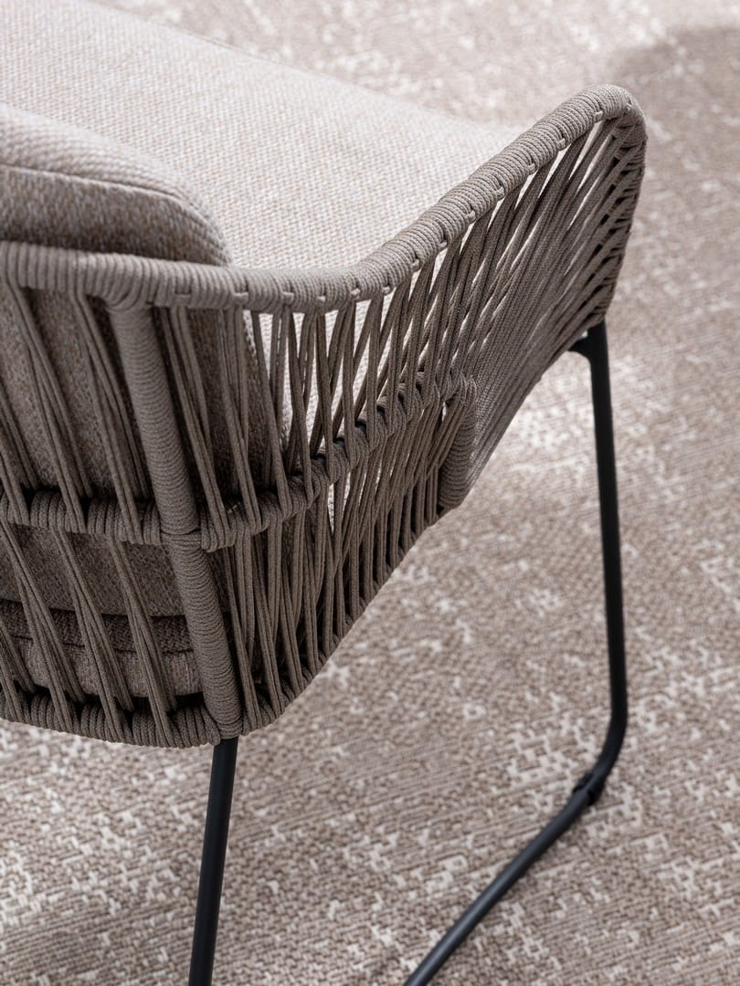 Konstrukcja wykonana ze stali nierdzewnej nadaje meblowi lekkości, a jednocześnie zapewnia trwałość i stabilność. Oparcie oraz boki siedziska oplata dekoracyjna plecionka z polipropylenowej liny, która tworzy efektowną strukturę i jednocześnie dopasowuje się do ciała, zapewniając komfort użytkowania.