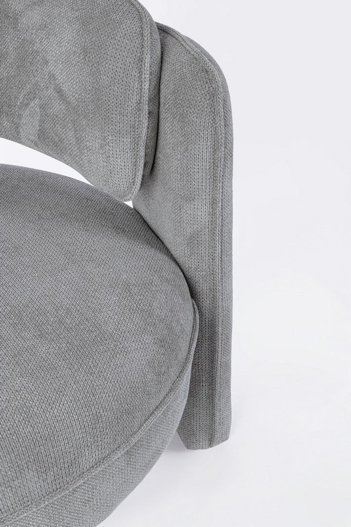 Fotel Aisha to rzeźbiarski element designu, który łączy komfortową, zaokrągloną bryłę z wyrazistymi, geometrycznymi detalami. Charakteryzuje się masywnym, kubełkowym siedziskiem oraz oryginalnymi podłokietnikami, które stanowią mocny akcent wizualny. Mebel tapicerowany jest wytrzymałą tkaniną poliestrową o subtelnym splocie w ponadczasowym, szarym odcieniu. Ta dynamiczna forma i neutralna kolorystyka czynią fotel Aisha idealnym uzupełnieniem nowoczesnych i eklektycznych wnętrz.