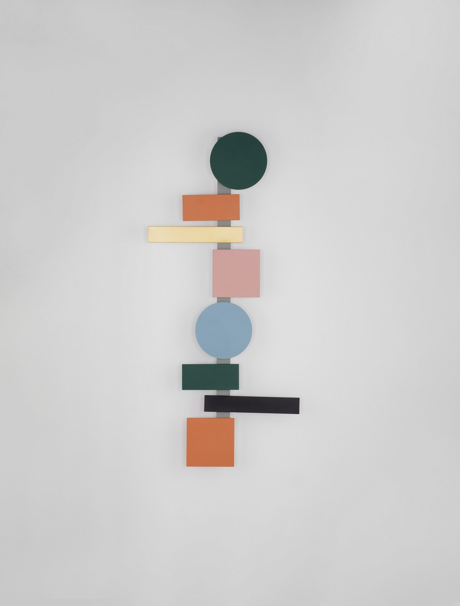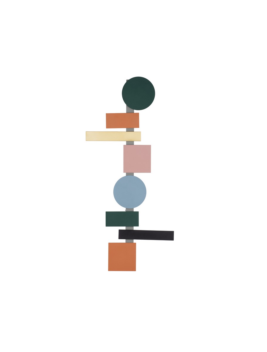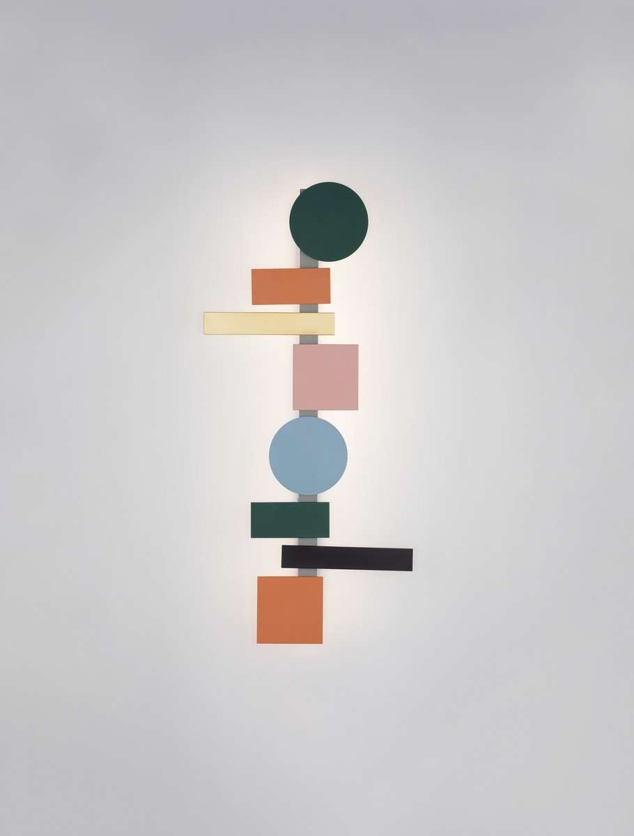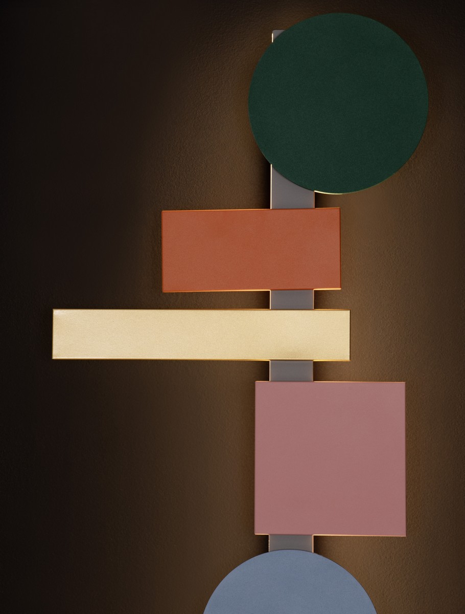 Kinkiet Gorzano to odważna, designerska propozycja, która łączy w sobie funkcję oświetlenia i dekoracyjnej instalacji ściennej. Jego kompozycja zbudowana jest z zestawienia prostych figur – okręgów, prostokątów i kwadratów – ułożonych w pionowy, harmonijny rytm. Każdy element ma inny kolor, a całość tworzy efekt przywodzący na myśl współczesne abstrakcyjne obrazy lub mobilne rzeźby inspirowane stylem Bauhausu.