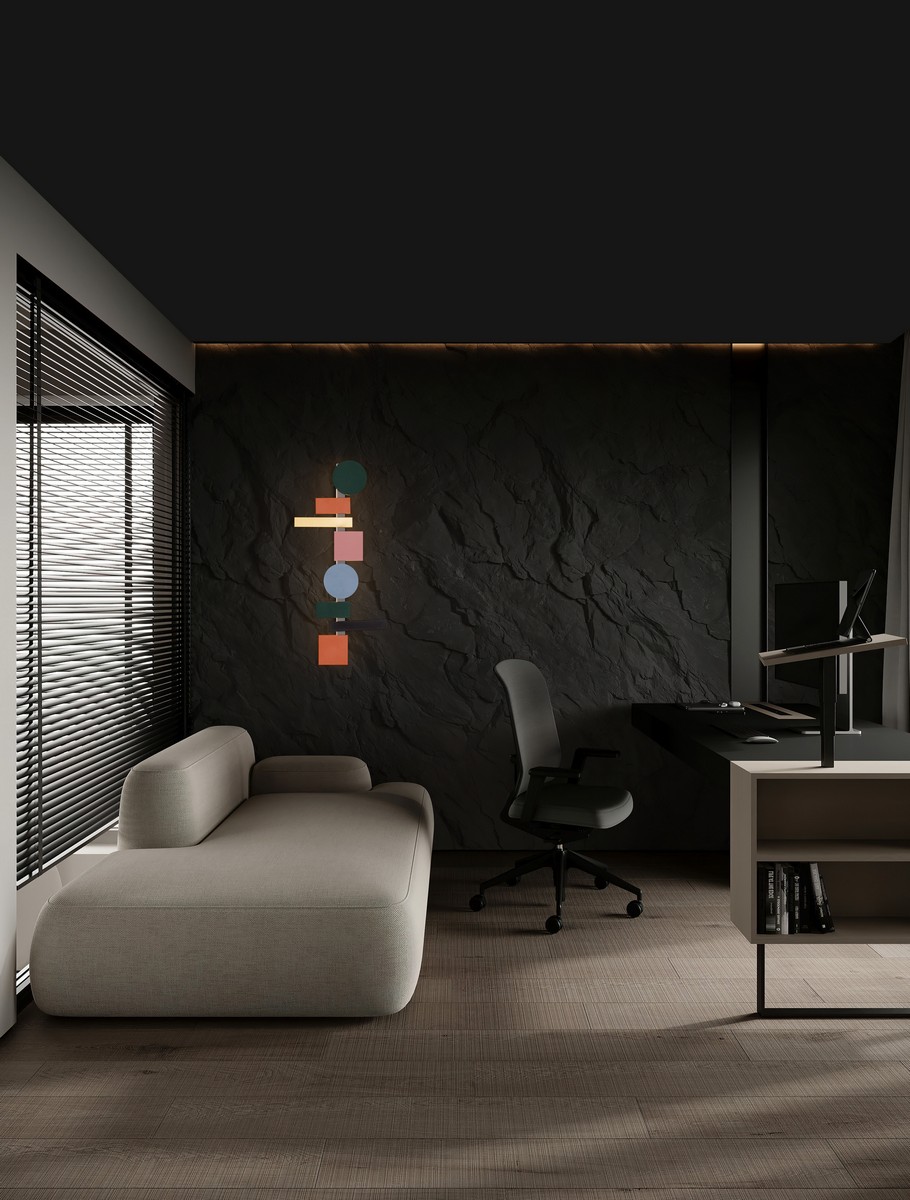 Matowe powierzchnie wykonane z aluminium i akrylu podkreślają czystość linii oraz wysoką jakość wykończenia. Po zapaleniu światła kinkiet odsłania subtelną poświatę, która miękko wypływa spod geometrycznych płaszczyzn, tworząc wyjątkowy nastrój i podkreślając reliefową formę kompozycji.