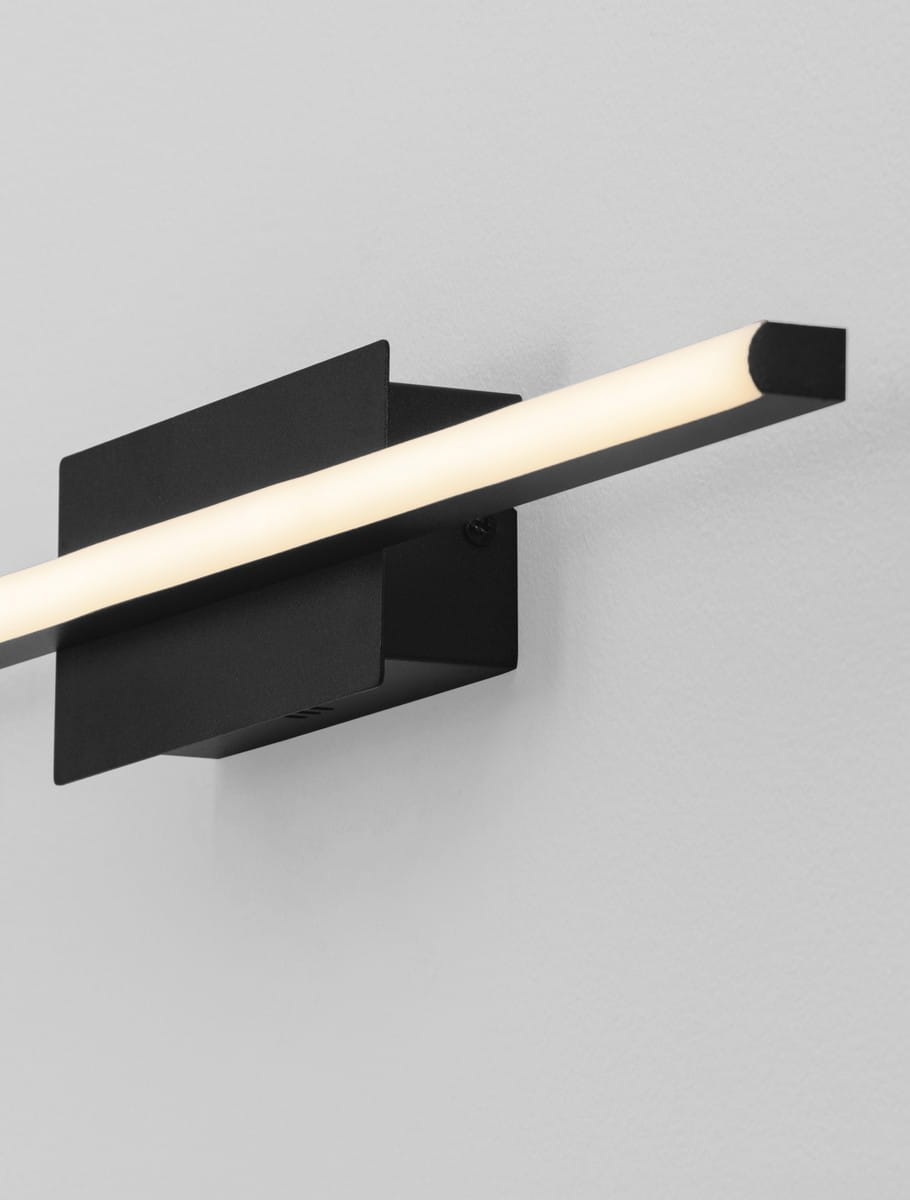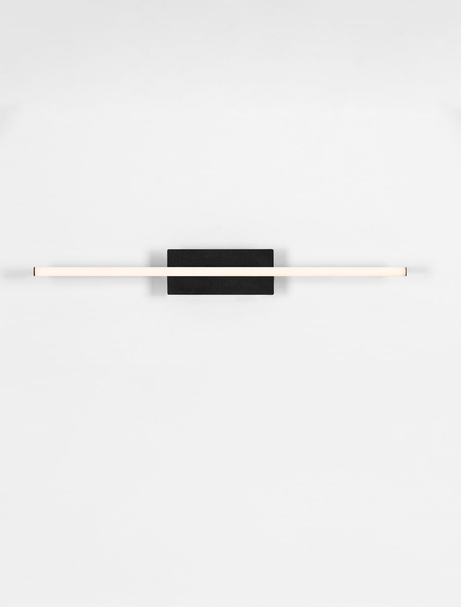 Kinkiet Zalencio to nowoczesne i minimalistyczne oświetlenie ścienne, które zachwyca prostotą formy i eleganckim wykończeniem. Jego konstrukcja opiera się na centralnej, prostokątnej podstawie w matowej czerni, z której symetrycznie wychodzą dwa smukłe, podłużne ramiona LED, tworząc efektowną, liniową kompozycję.