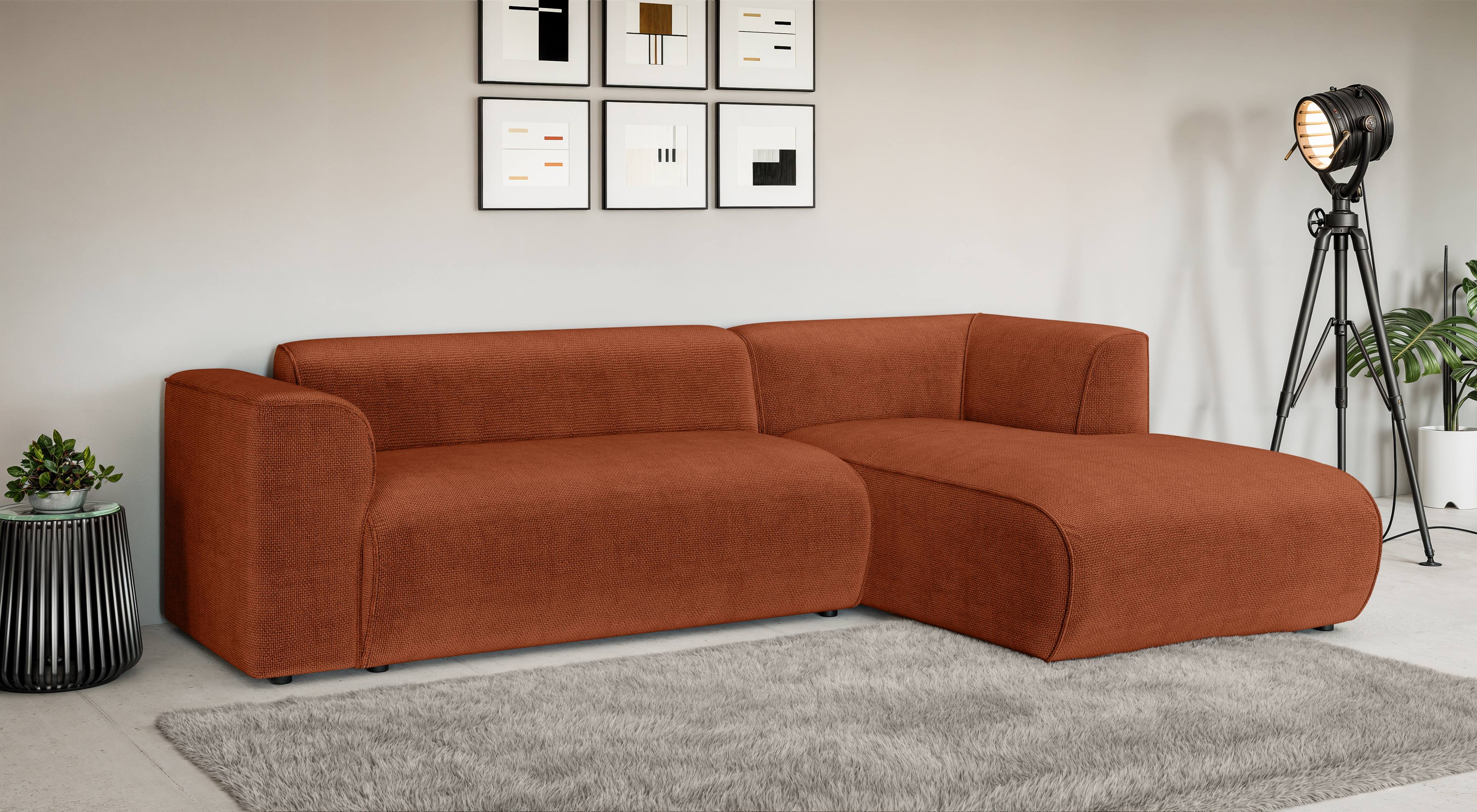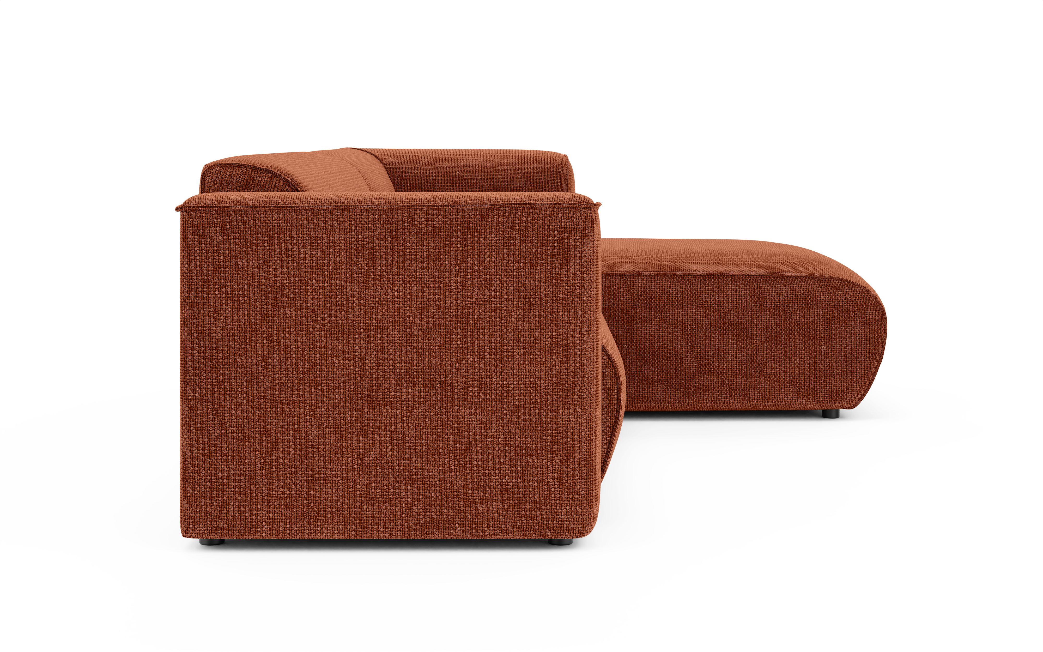 Narożnik Solar to wyjątkowo komfortowy mebel, który łączy w sobie nowoczesny design z modułową formą. Charakteryzuje się niskim profilem, szerokimi podłokietnikami i miękką, zaokrągloną sylwetką. Tapicerowany jest tkaniną Flow 9 – gęstą, strukturalną plecionką o wyraźnym splocie, w wyrazistym, ceglastym odcieniu.