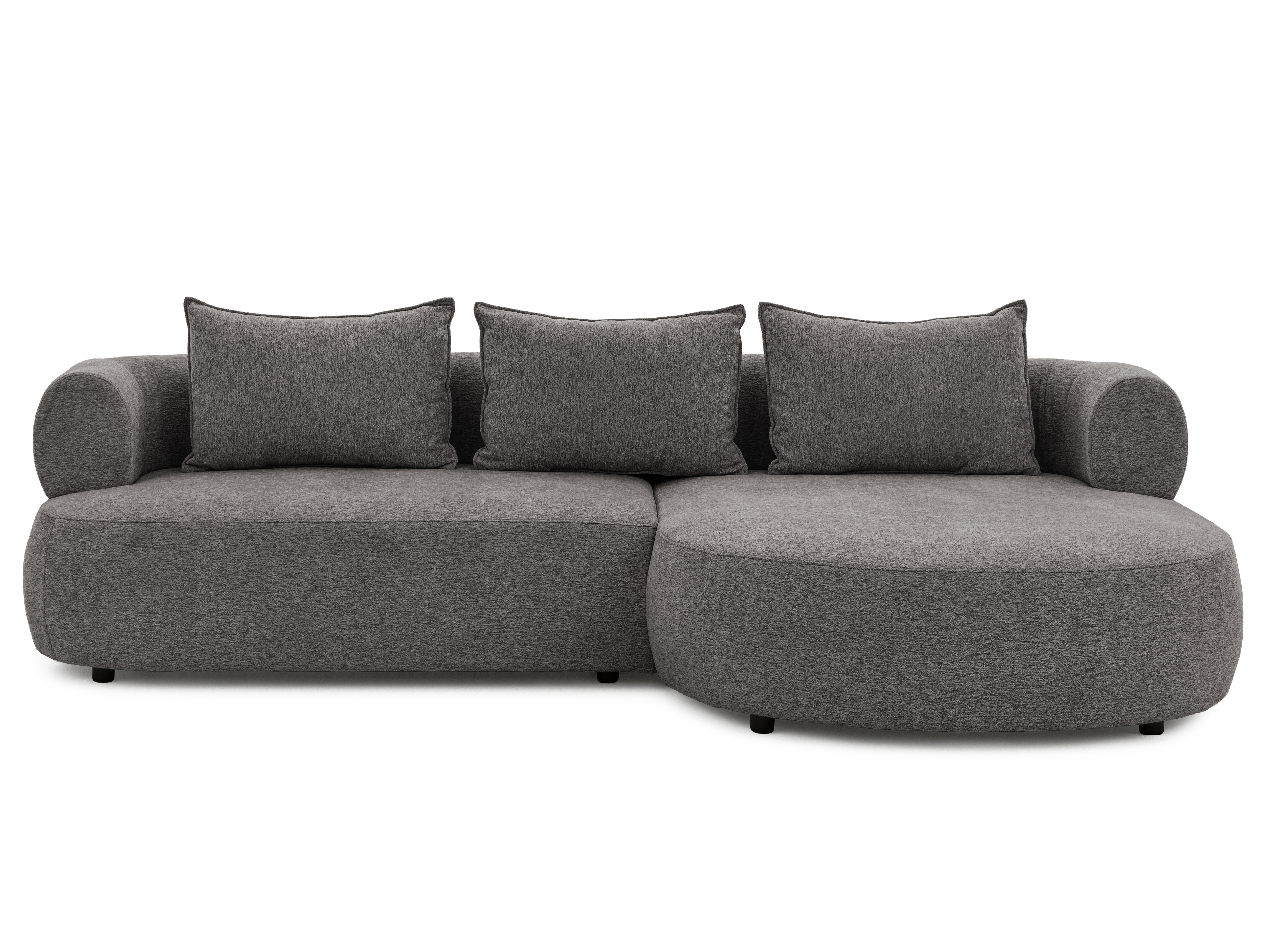 Zaokrąglone podłokietniki pełnią tu kluczową rolę – ich masywna, cylindryczna forma stabilizuje całą sylwetkę mebla i podkreśla jego rzeźbiarską tożsamość. Duże, miękkie poduszki oparciowe wspierają naturalną linię pleców i pozwalają na swobodę aranżacji: można je ustawiać klasycznie, grupować lub rozsuwać, dostosowując narożnik do własnych potrzeb. Szerokie siedzisko zapewnia przestrzeń do wypoczynku zarówno w ciągu dnia, jak i wieczorem – to mebel zaprojektowany z myślą o rytmie codzienności i celebracji domowego komfortu.