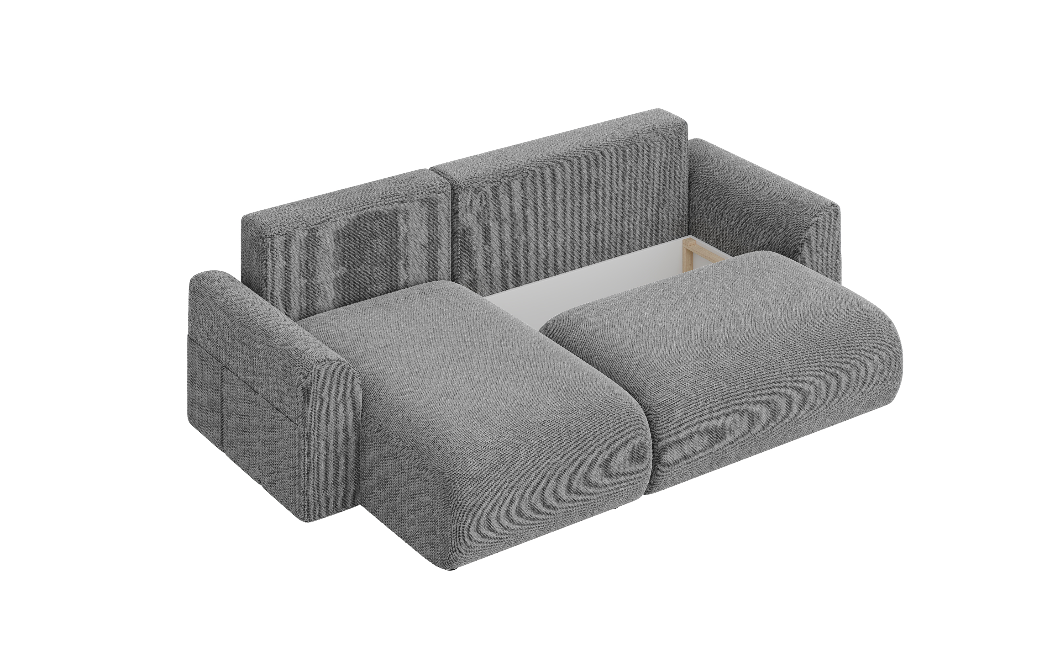Sofa łączy estetykę z funkcjonalnością. Ukryta funkcja spania pozwala w szybki sposób zamienić narożnik w wygodne, pełnowymiarowe miejsce do nocnego odpoczynku, co czyni go świetnym wyborem również do mieszkań, w których każdy metr ma znaczenie. Dodatkowym atutem jest praktyczna kieszonka umieszczona w boku mebla – idealna na piloty, gazety czy drobne akcesoria, które zawsze warto mieć pod ręką. Dzięki temu Pocket nie tylko porządkuje przestrzeń, lecz także podnosi komfort codziennego użytkowania.