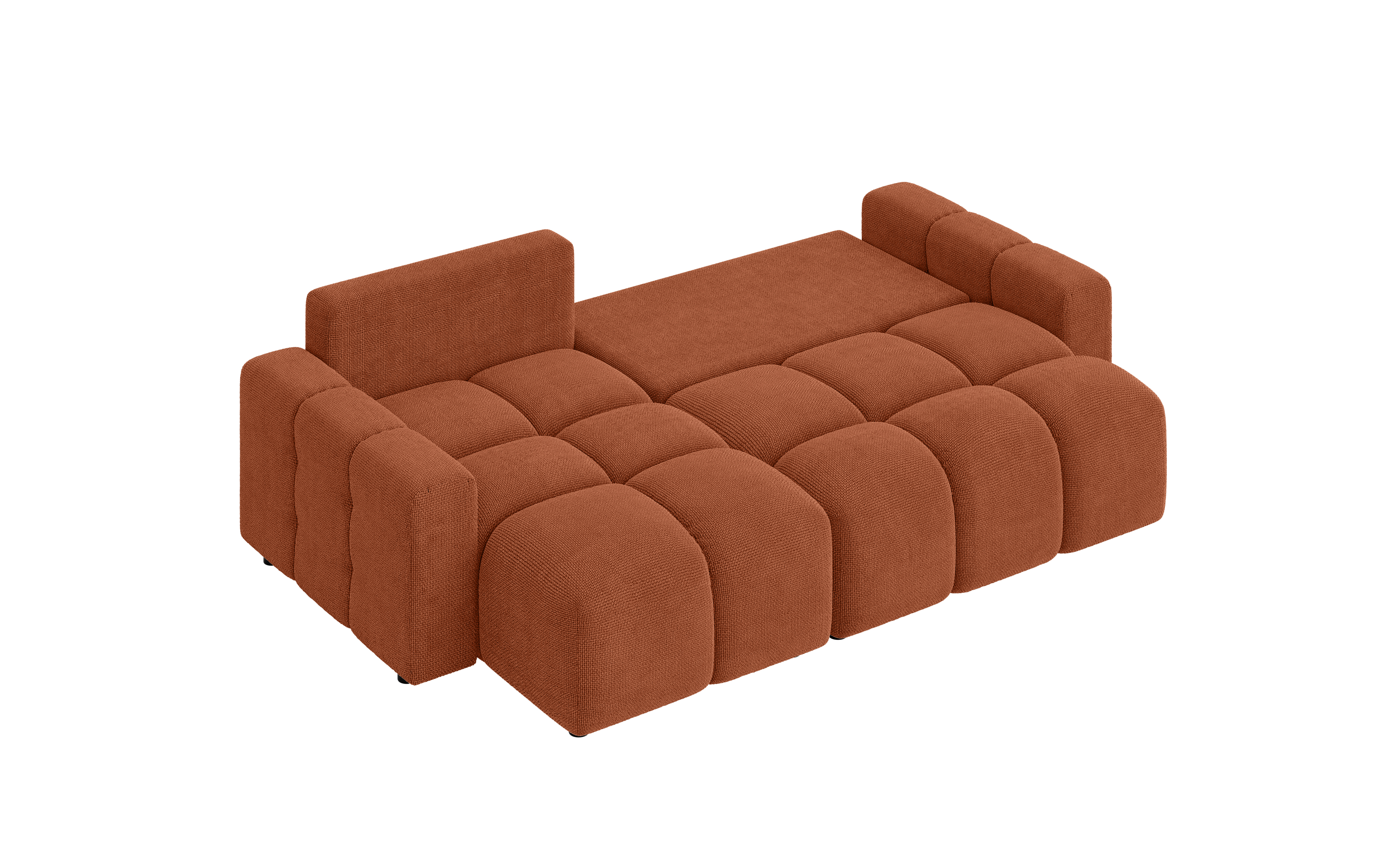 Nowoczesny narożnik Bubbly w odważnym, ceglanym odcieniu, który doskonale łączy w sobie wyjątkowy styl i funkcjonalność. Jego unikalny, puszysty design i zaokrąglone kształty stanowią mocny akcent we wnętrzu i są kwintesencją komfortowego wypoczynku.