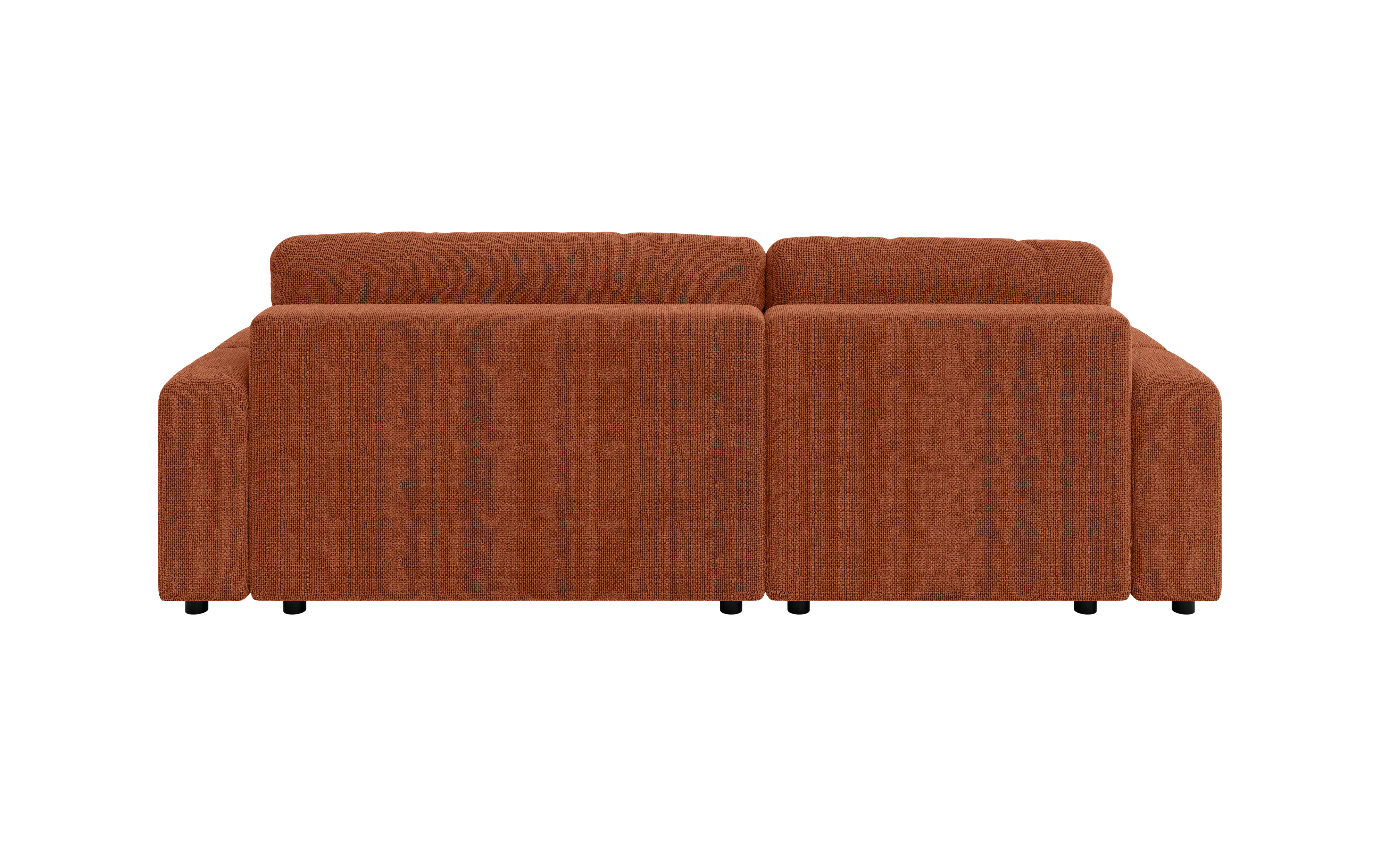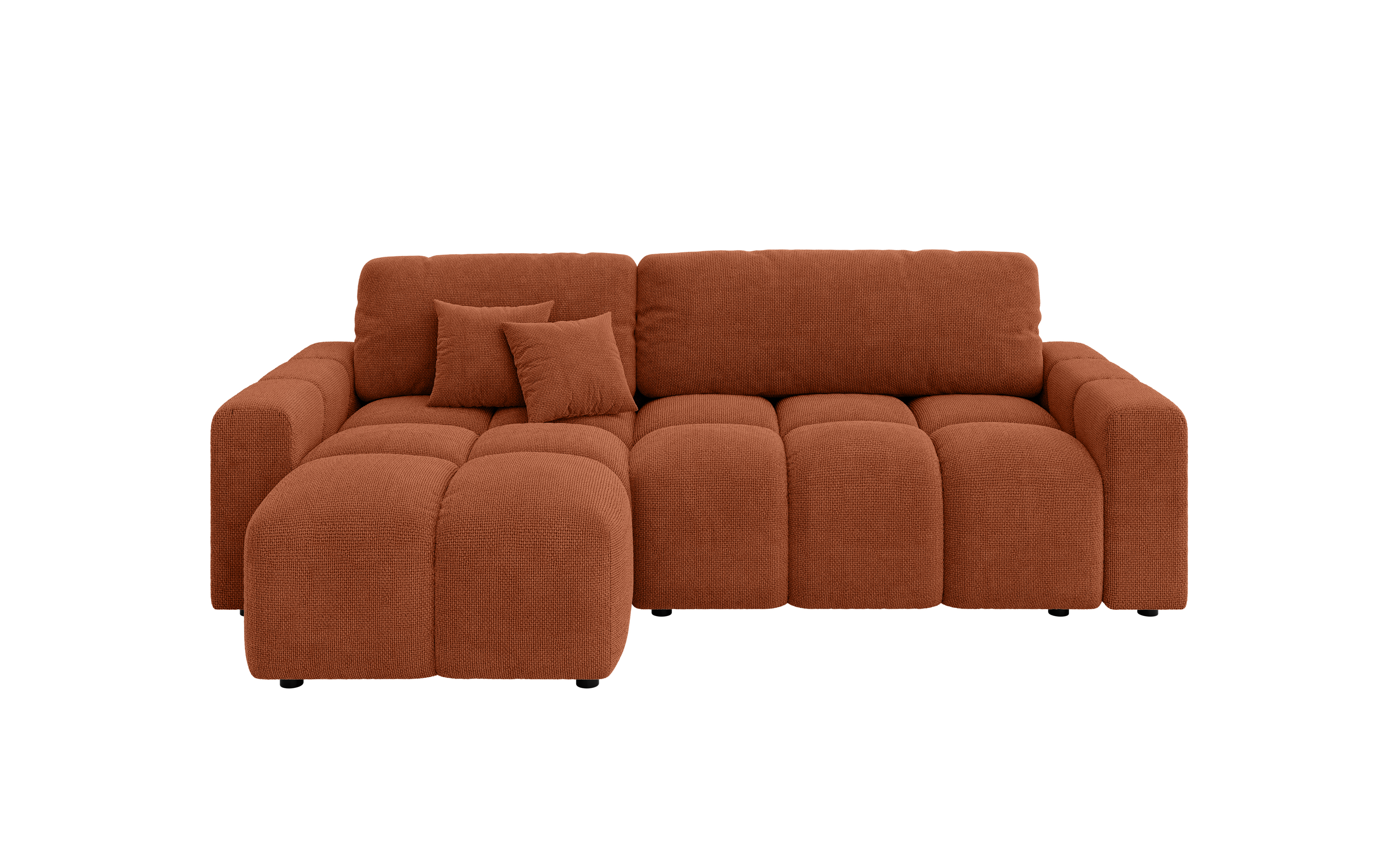 Mebel wyposażony jest w eleganckie, czarne nóżki, które doskonale komponują się z ceglaną tapicerką, podkreślając jego minimalistyczny i nowoczesny design. Dostępny jest w układzie: lewym lub prawym, aby idealnie dopasować się do układu Twojego wnętrza.