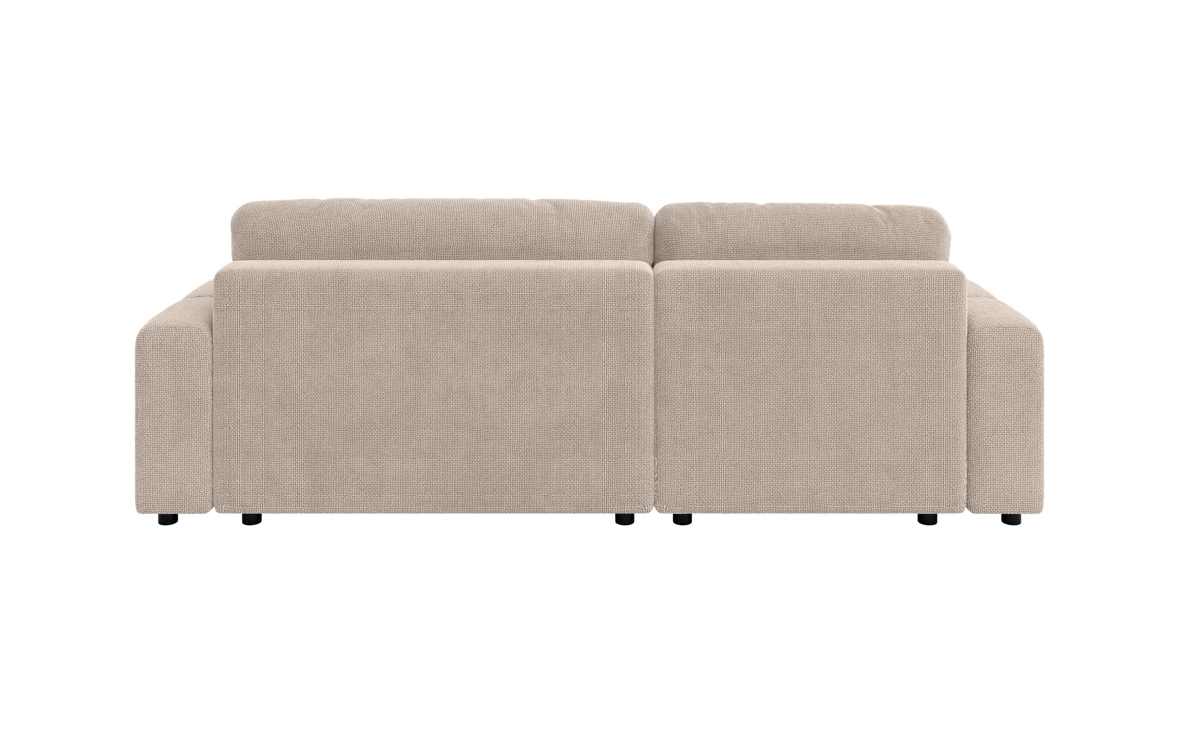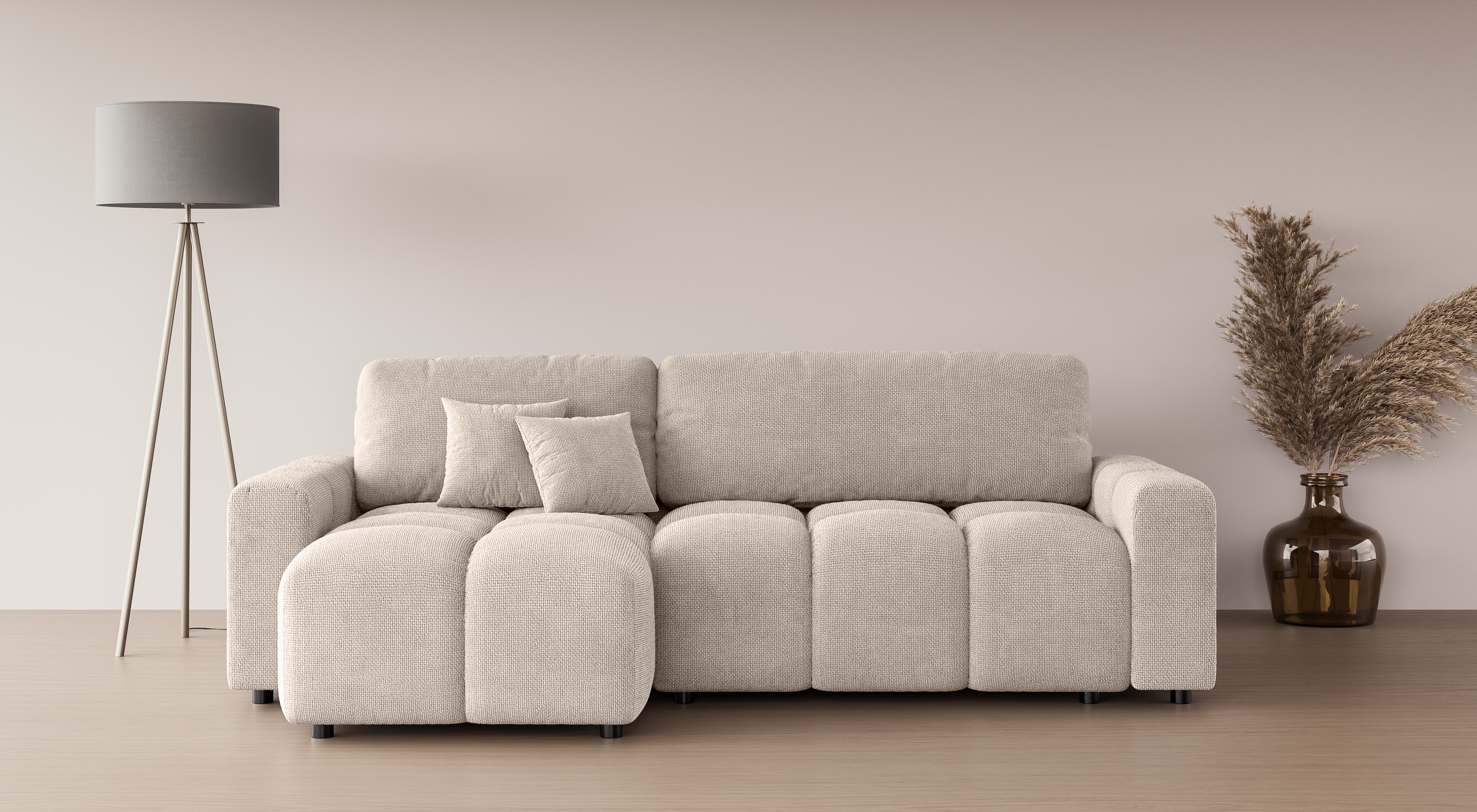 Mebel wyposażony jest w eleganckie, czarne nóżki, które doskonale komponują się z beżową tapicerką, podkreślając jego minimalistyczny i nowoczesny design. Dostępny jest w układzie: lewym lub prawym, aby idealnie dopasować się do układu Twojego wnętrza.