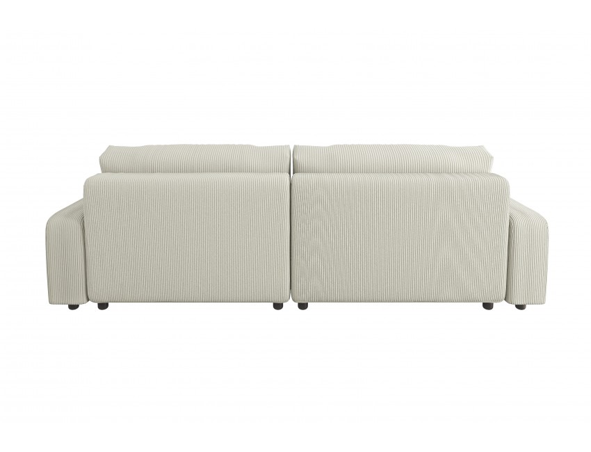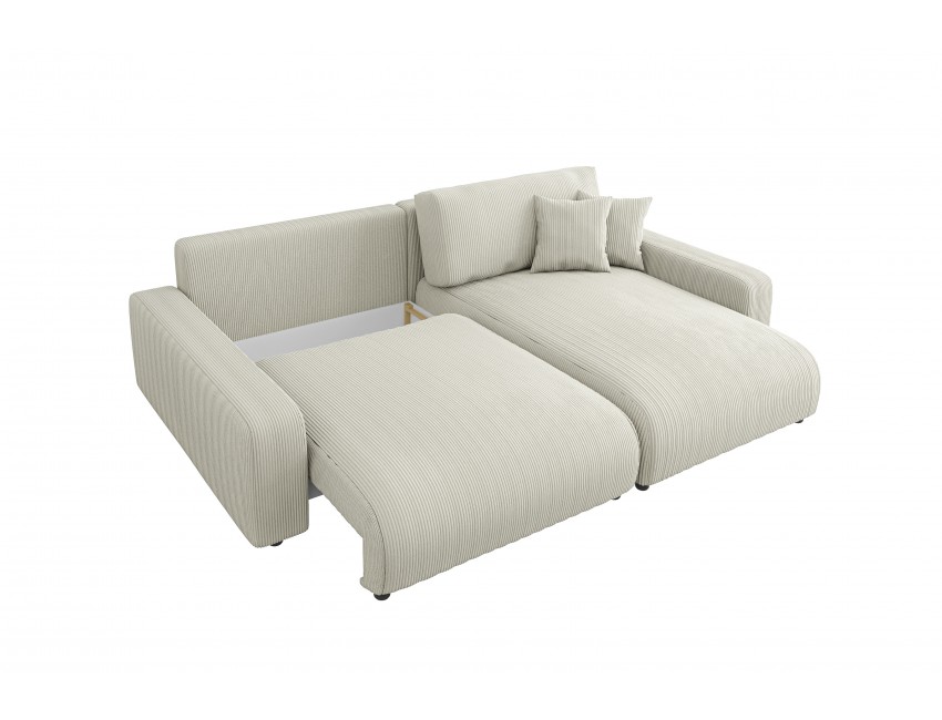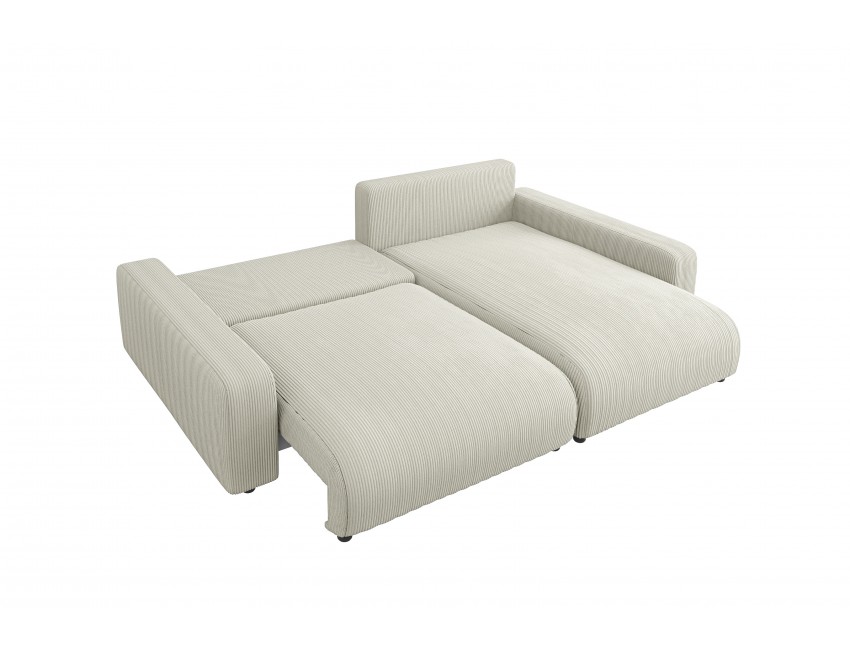 Narożnik zachwyca również funkcjonalnością. Wystarczy kilka prostych ruchów, aby rozłożyć go do pełnowymiarowej przestrzeni do spania, która tworzy równą, komfortową powierzchnię – idealną zarówno dla gości, jak i do codziennego użytkowania. Ogromnym atutem modelu Mary jest pojemny schowek ukryty w jednym z modułów. To praktyczne miejsce na pościel, koce czy dodatkowe poduszki, które pomaga utrzymać porządek i pozwala zaoszczędzić przestrzeń w salonie.