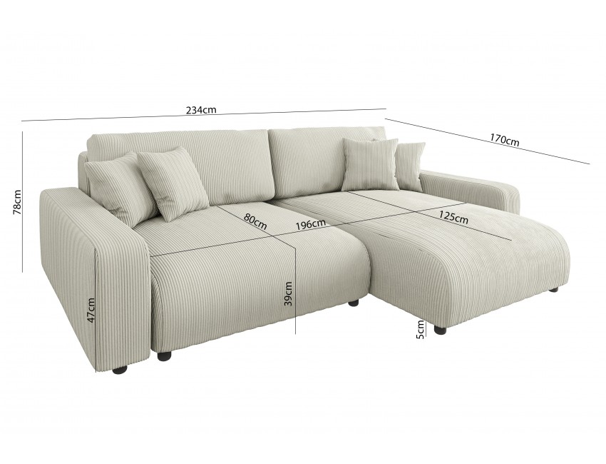 Nowoczesny narożnik Mary z funkcją spania to propozycja dla osób, które cenią współczesny design, harmonijną bryłę i maksymalny komfort użytkowania. Jego szerokie, miękko zaoblone podłokietniki oraz nisko osadzona konstrukcja tworzą elegancką, minimalistyczną formę, która pięknie prezentuje się w każdym wnętrzu – od jasnych, spokojnych aranżacji skandynawskich po nowoczesne przestrzenie o bardziej wyrazistym charakterze. Subtelnie zaokrąglona linia siedziska dodaje meblowi lekkości, mimo jego dużych, solidnych wymiarów, a dekoracyjne poduszki dopełniają całość, zapewniając wygodne podparcie w trakcie codziennego wypoczynku.