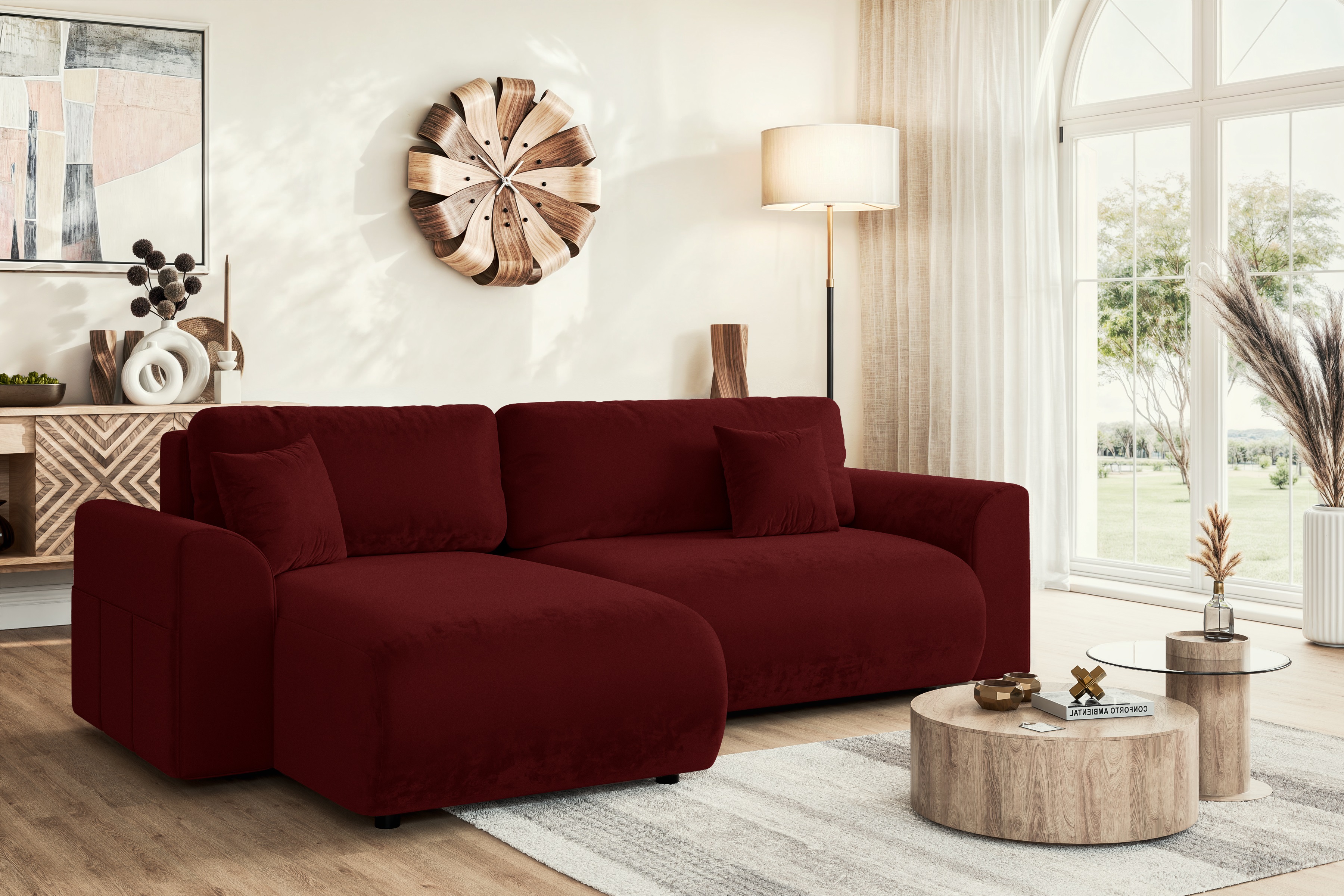 Nowoczesny narożnik z funkcją spania i kieszonką do przechowywania Pocket bordowy aksamit