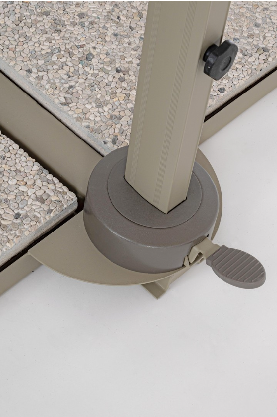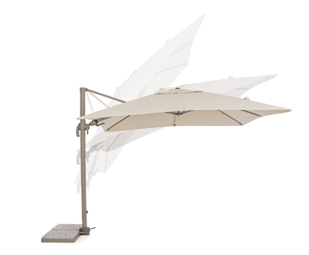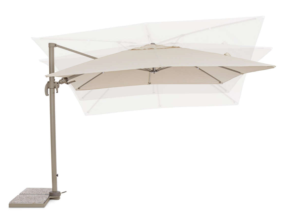 Model Saragozza wyróżnia się zaawansowaną mechaniką, która pozwala na precyzyjne sterowanie cieniem. Parasol wyposażono w system obrotu o 360° obsługiwany pedałem, dzięki czemu możesz obracać czaszę wokół własnej osi bez przesuwania bazy. Dodatkowo, za pomocą rączki, użytkownik może regulować nachylenie pionowe w 5 pozycjach oraz kontrolować nachylenie boczne (lewo-prawo). Pozwala to na skuteczną ochronę przed słońcem o każdej porze dnia.