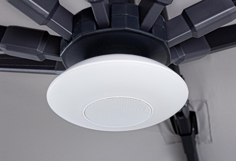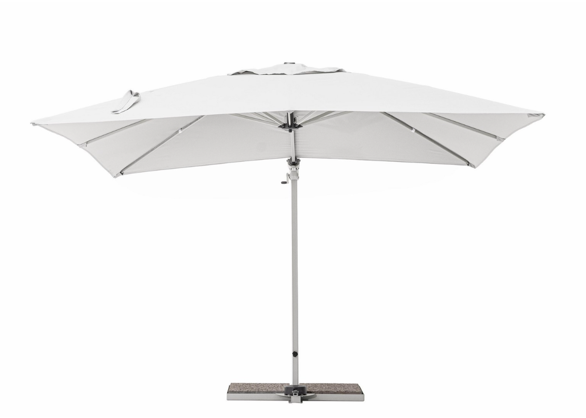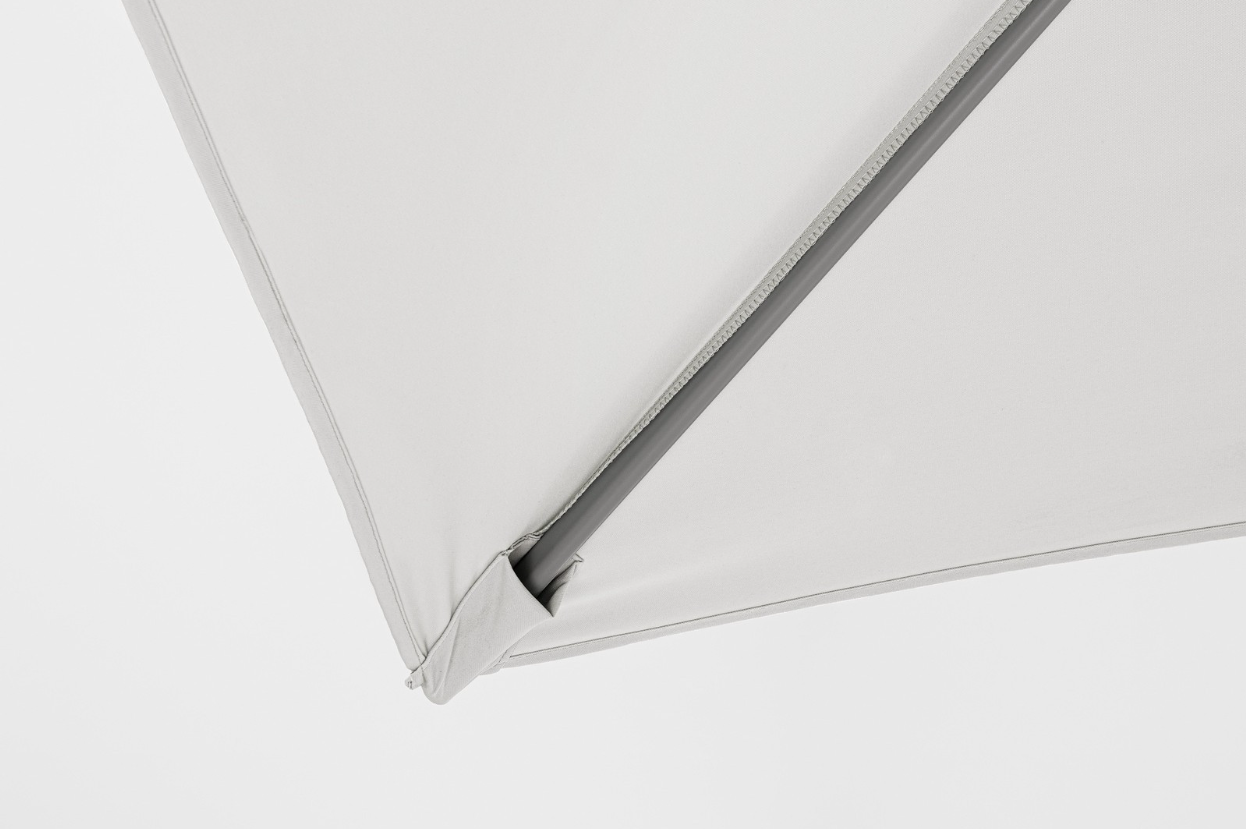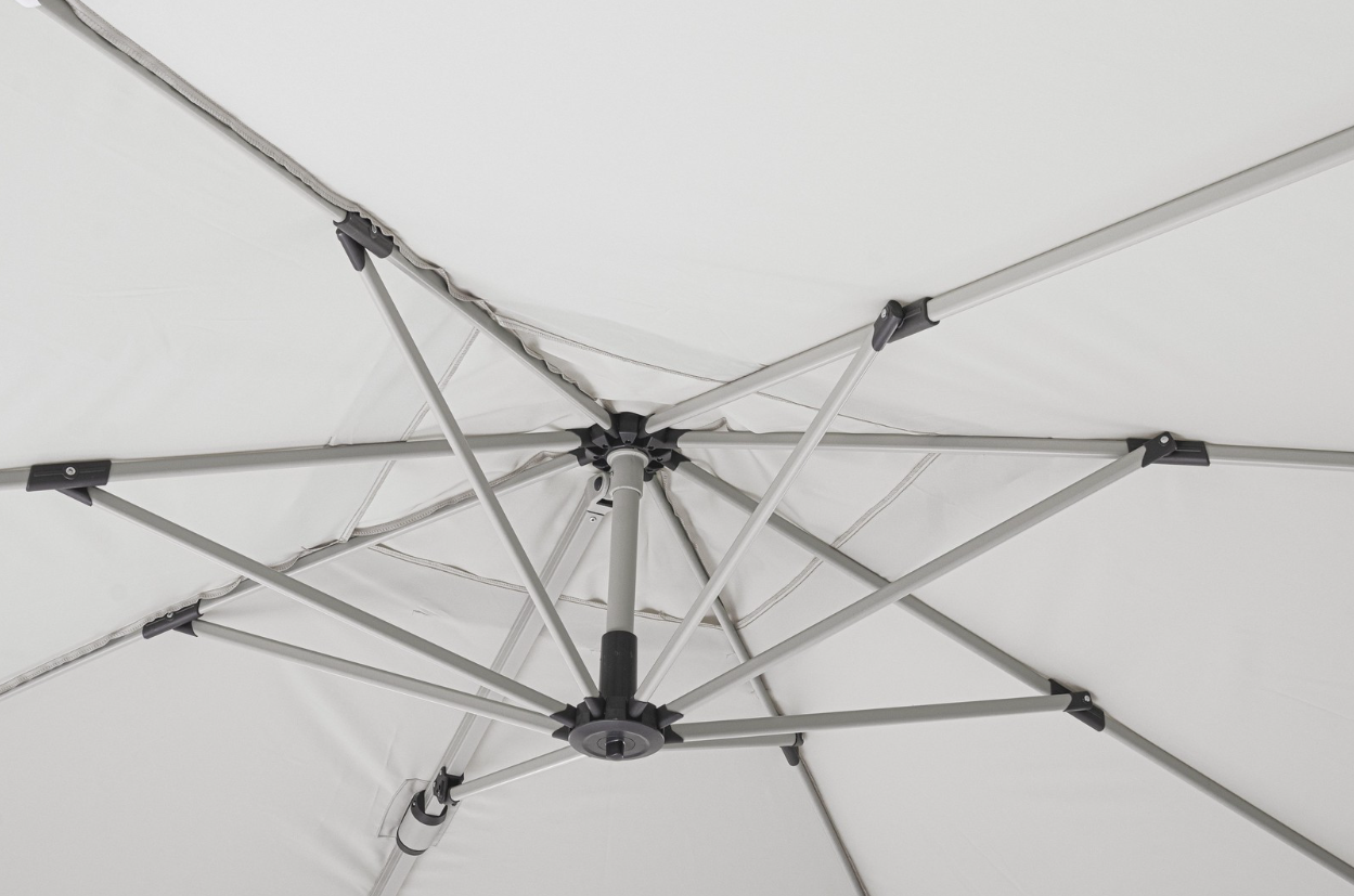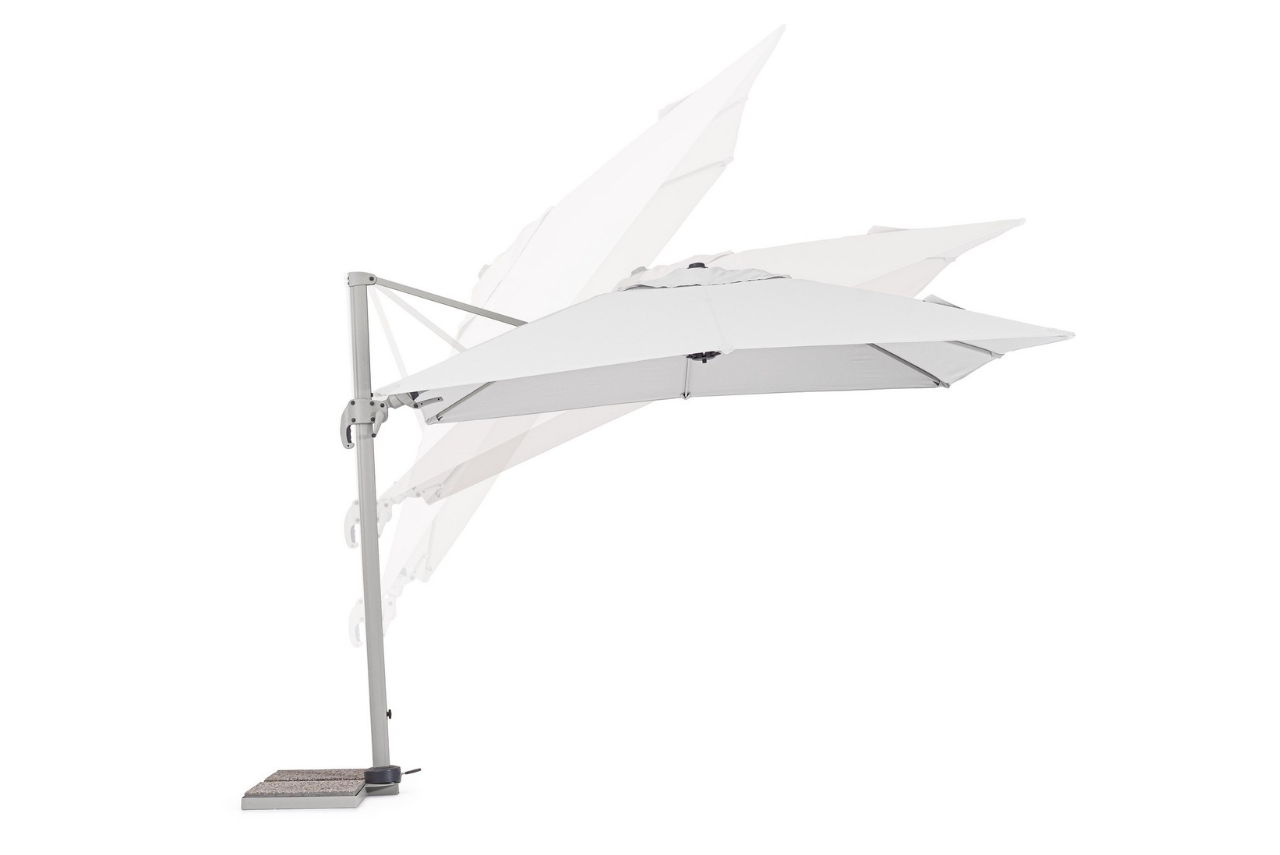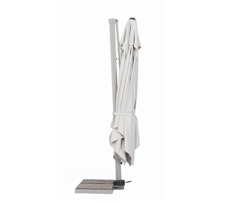 W zestawie z parasolem znajduje się stalowa podstawa krzyżowa oraz komplet betonowych obciążników, zapewniających bezpieczne użytkowanie. Istnieje również możliwość rozszerzenia funkcjonalności produktu poprzez dokupienie dedykowanego pokrowca ochronnego lub wielofunkcyjnej lampki LED z głośnikiem.