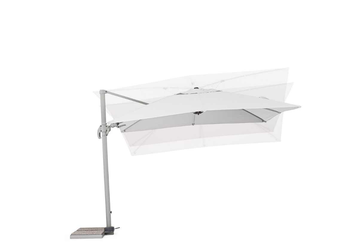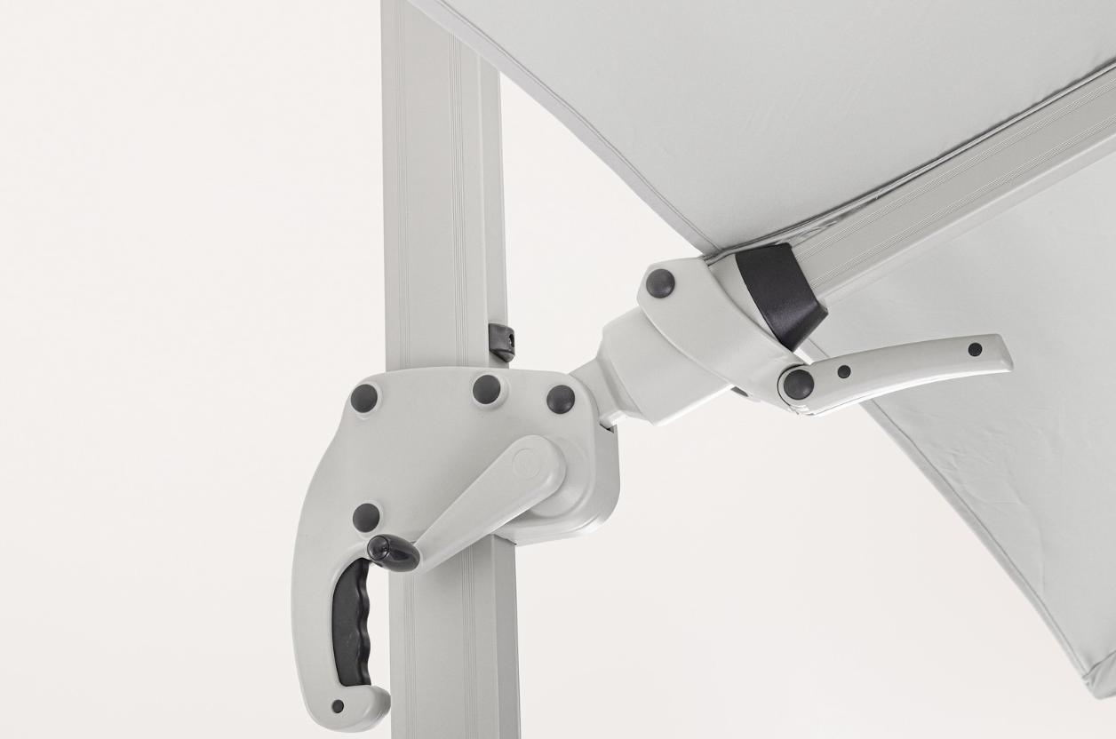 Model ten charakteryzuje się wyjątkową ergonomią obsługi. Wyposażono go w system obrotu o 360° sterowany pedałem, co pozwala na podążanie cieniem za słońcem bez konieczności przestawiania ciężkiej bazy. Dodatkowo, za pomocą wygodnego uchwytu, użytkownik może regulować nachylenie czaszy w pionie (5 pozycji) oraz zmieniać jej kąt nachylenia na boki. Solidny stelaż z aluminium malowanego proszkowo gwarantuje odporność na korozję i stabilność konstrukcji.