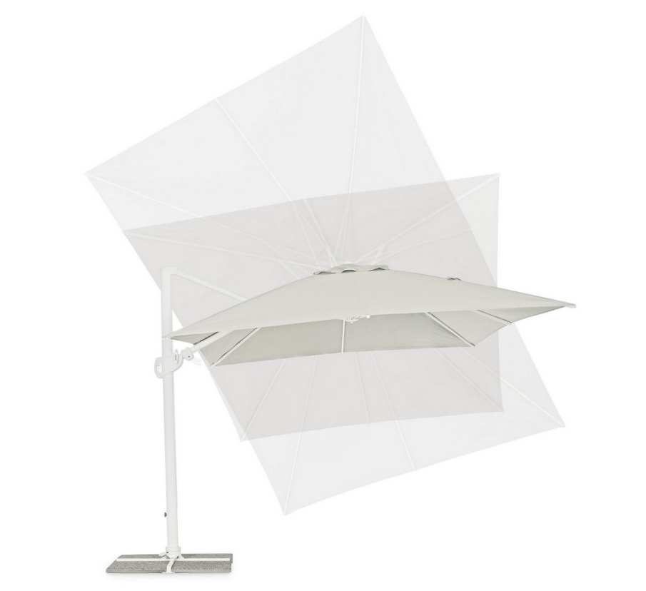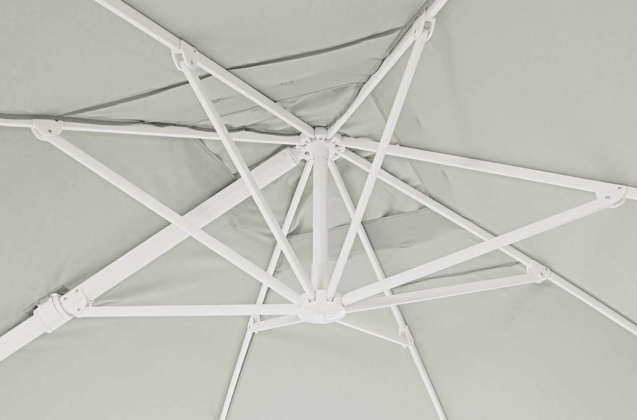 Kluczową zaletą wersji "T" jest wszechstronny system regulacji 3D. Użytkownik ma do dyspozycji nie tylko obrót o 360° i 5-stopniową zmianę nachylenia w pionie, ale także unikalną funkcję pochylania czaszy na boki (lewo-prawo). Pozwala to na precyzyjne osłonięcie się przed nisko operującym słońcem bez konieczności przestawiania mebli. Czasza o powierzchni 12 m² wykonana jest z trwałego poliestru (250 g/m²) z powłoką PA, co zapewnia skuteczną ochronę.