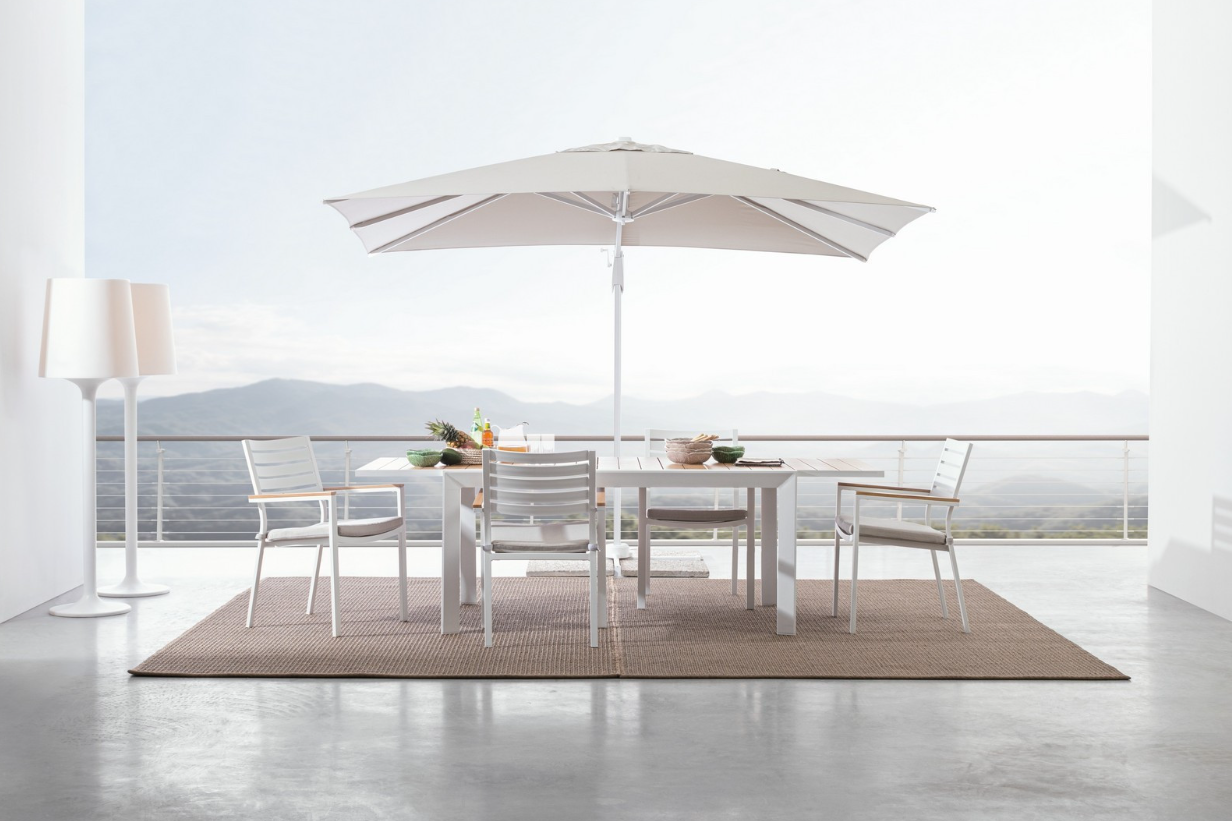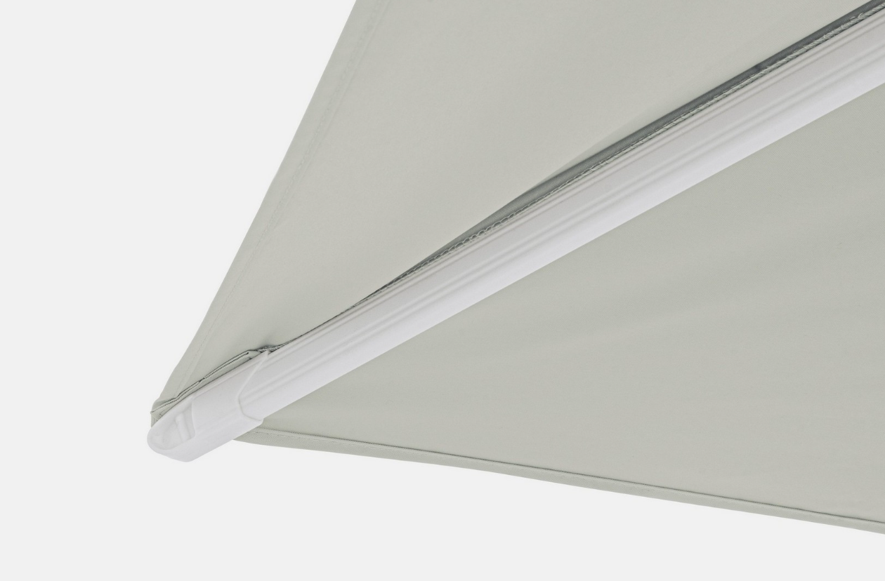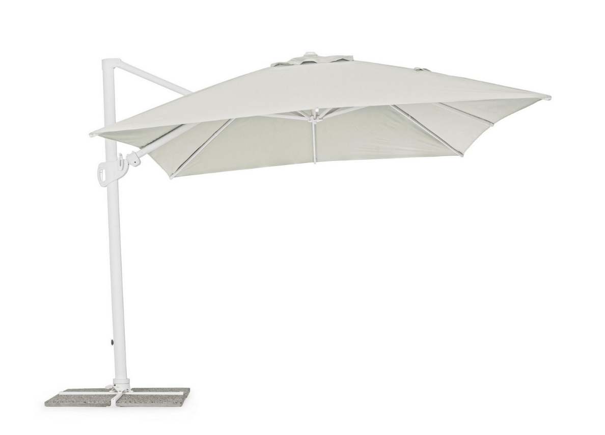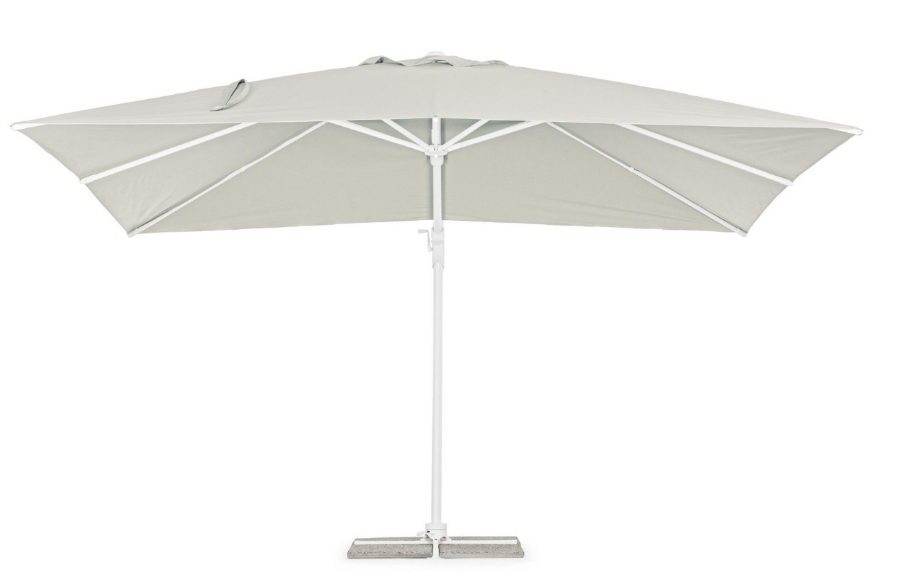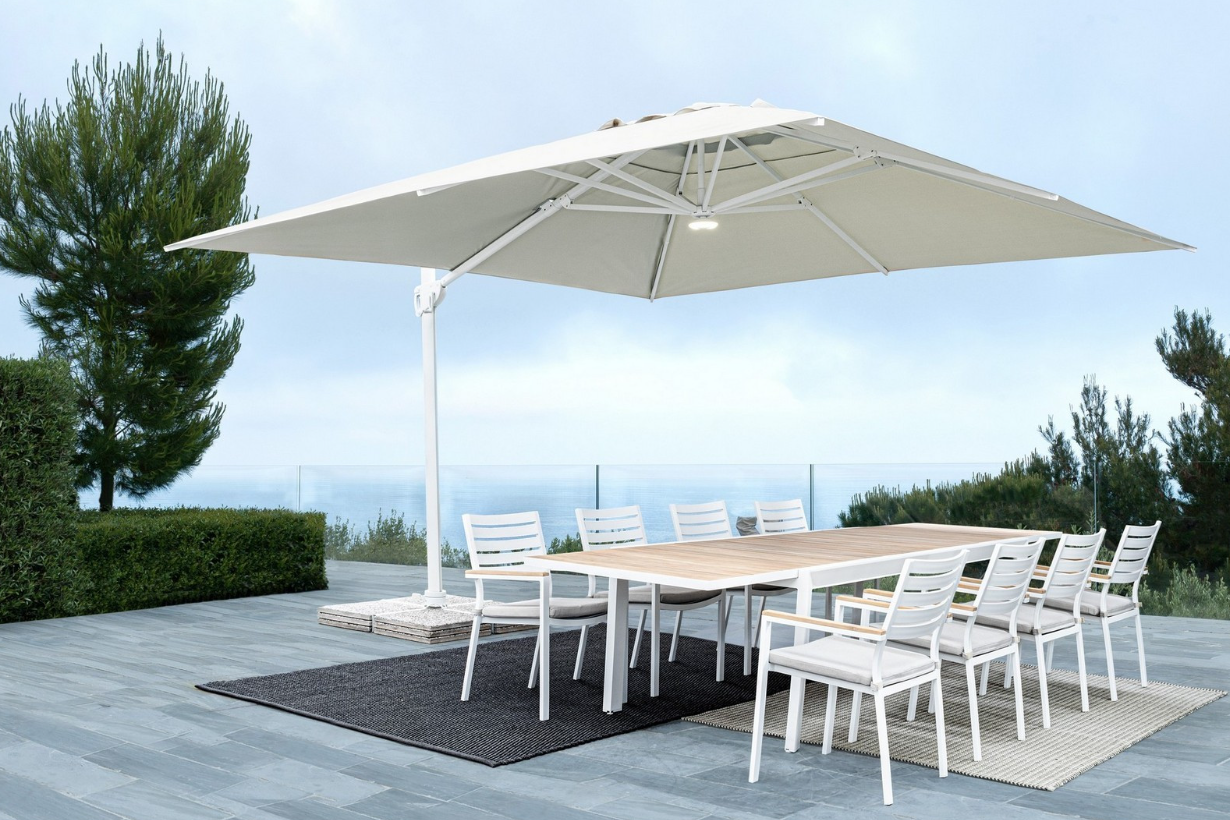 Parasol boczny Eden w wariancie T to połączenie wakacyjnej estetyki z najwyższą funkcjonalnością techniczną. Model ten zachwyca jasną, lekką kolorystyką: solidny stelaż aluminiowy w kolorze białym tworzy harmonijny duet z czaszą w odcieniu beżowym. Taki design idealnie sprawdza się w aranżacjach inspirowanych stylem hamptons czy śródziemnomorskim, wprowadzając na taras atmosferę relaksu.
