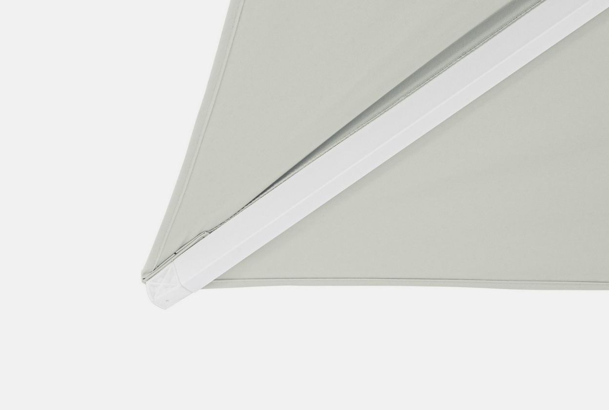 Konstrukcja opiera się na wzmocnionym maszcie aluminiowym (105x65 mm), co gwarantuje stabilność przy tak dużej powierzchni czaszy (16 m²). Poszycie wykonano z wytrzymałego poliestru (250 g/m²) z powłoką poliamidową. Eden oferuje szeroki zakres regulacji: pedał umożliwia obrót parasola o 360°, a ergonomiczny uchwyt pozwala na precyzyjną, 6-stopniową zmianę nachylenia czaszy w pionie. Dzięki temu z łatwością dopasujesz kąt padania cienia do aktualnej pozycji słońca.
