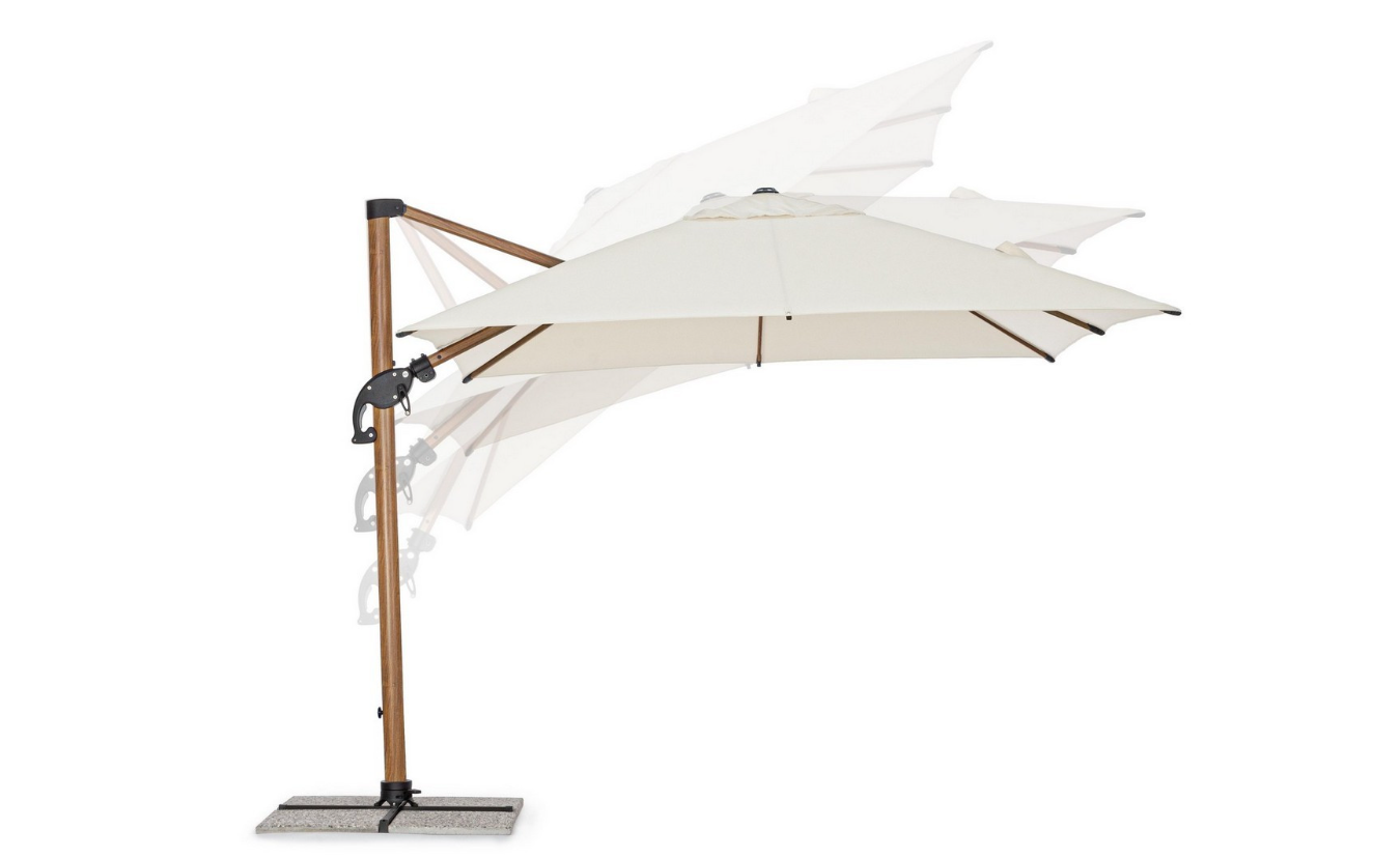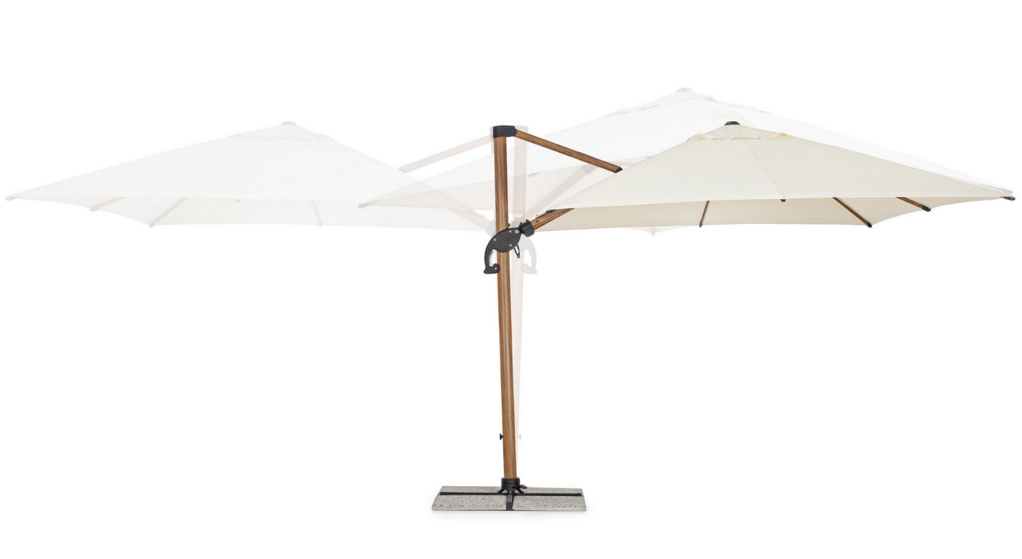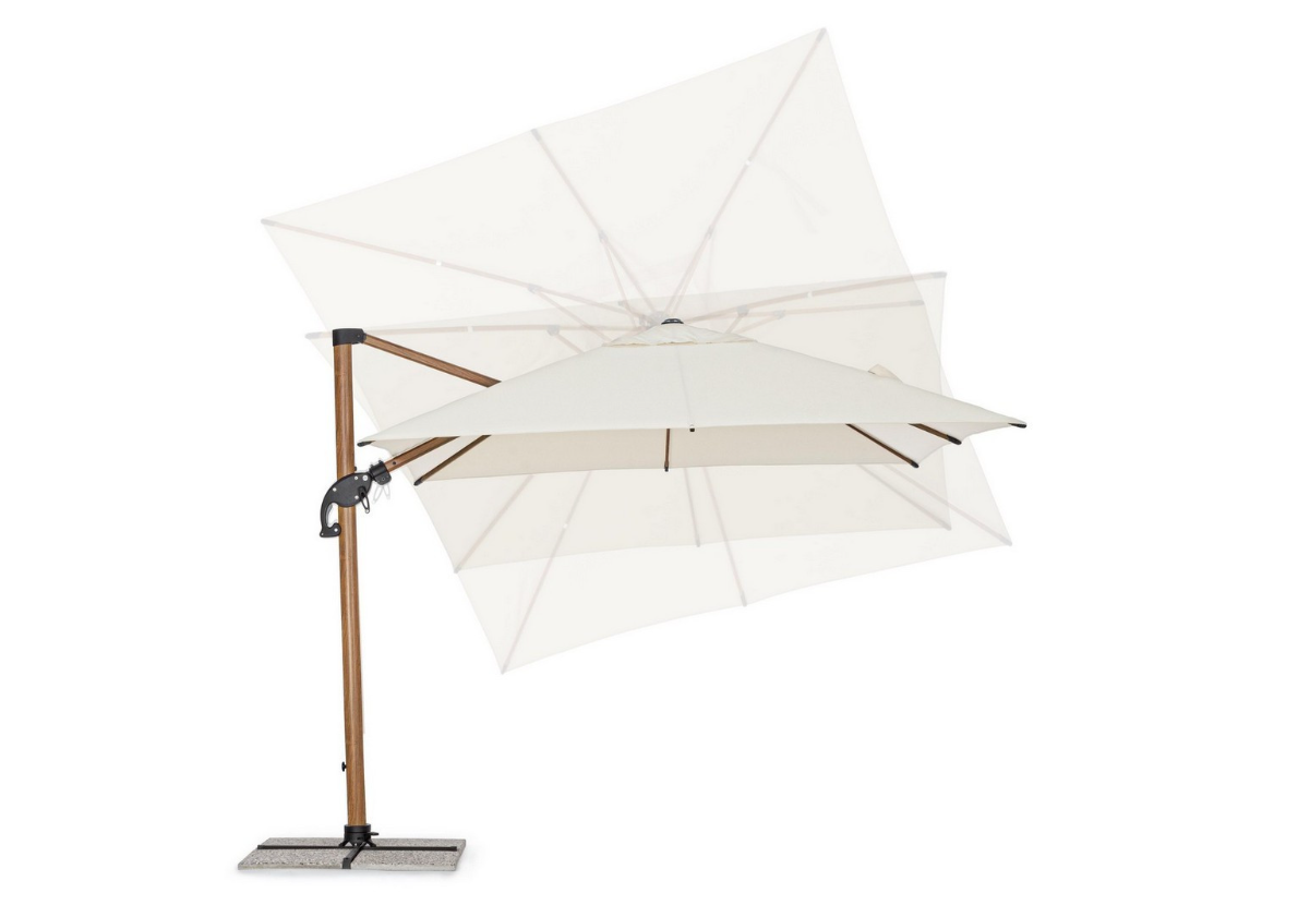 Model oznaczony symbolem "T" oferuje użytkownikowi zaawansowany system regulacji 3D. Poza standardowym obrotem o 360° wokół własnej osi, parasol umożliwia pochylanie czaszy na boki (lewo-prawo) oraz precyzyjną, 6-stopniową regulację nachylenia w pionie. Taka funkcjonalność pozwala na skuteczne zablokowanie promieni słonecznych o każdej porze dnia bez konieczności przesuwania całej konstrukcji. Czasza o powierzchni 9 m² uszyta jest z solidnego poliestru (250 g/m²) z powłoką poliamidową.