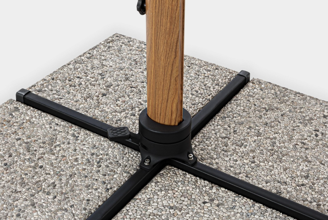 Dostarczamy produkt jako kompletny zestaw gotowy do użytku. W cenie zawarta jest stalowa baza, niezbędne betonowe obciążniki zapewniające stabilność oraz dedykowany pokrowiec ochronny. Parasol jest również przystosowany do instalacji opcjonalnego oświetlenia LED i głośnika.