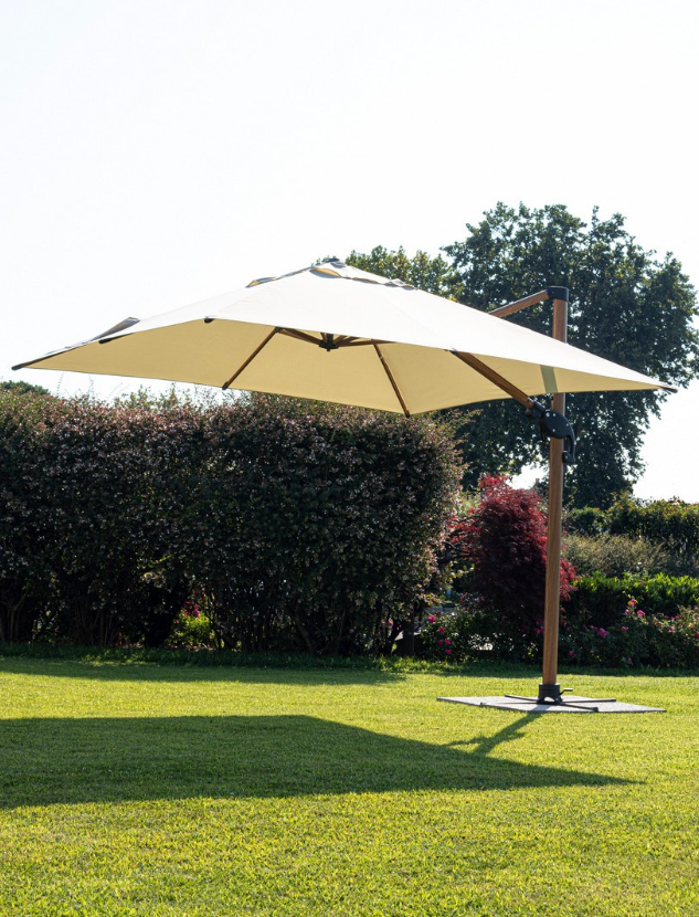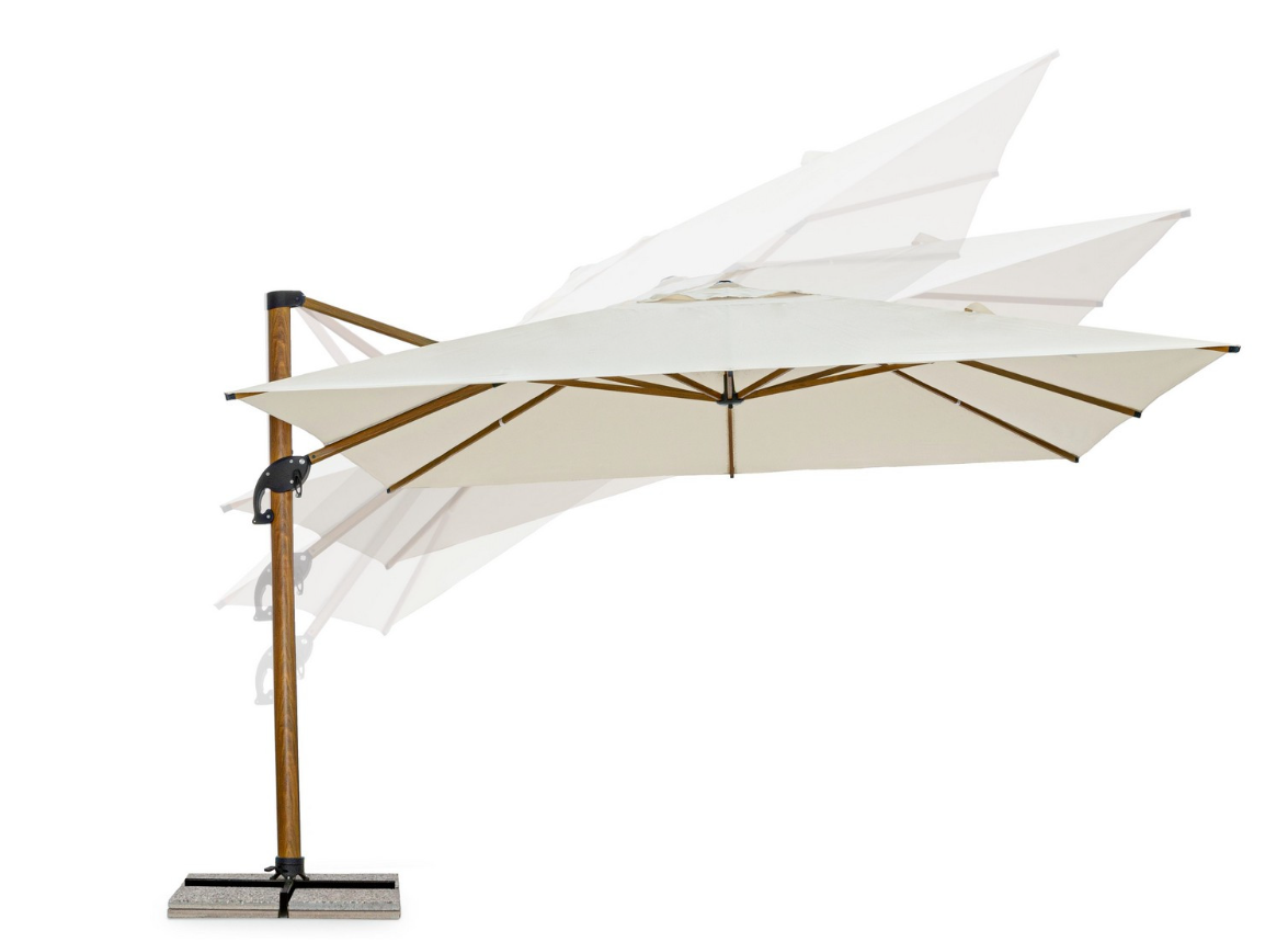 Parasol boczny Orion o imponujących wymiarach 4x4 m to mistrzowskie połączenie natury i technologii. Jego unikalną cechą jest stelaż wykonany z aluminium malowanego proszkowo w taki sposób, aby do złudzenia przypominał naturalne drewno. Dzięki temu rozwiązaniu zyskujesz przytulny, klasyczny wygląd drewnianej konstrukcji, przy jednoczesnym zachowaniu pełnej odporności na wilgoć i brak konieczności konserwacji, jaką oferuje metal.