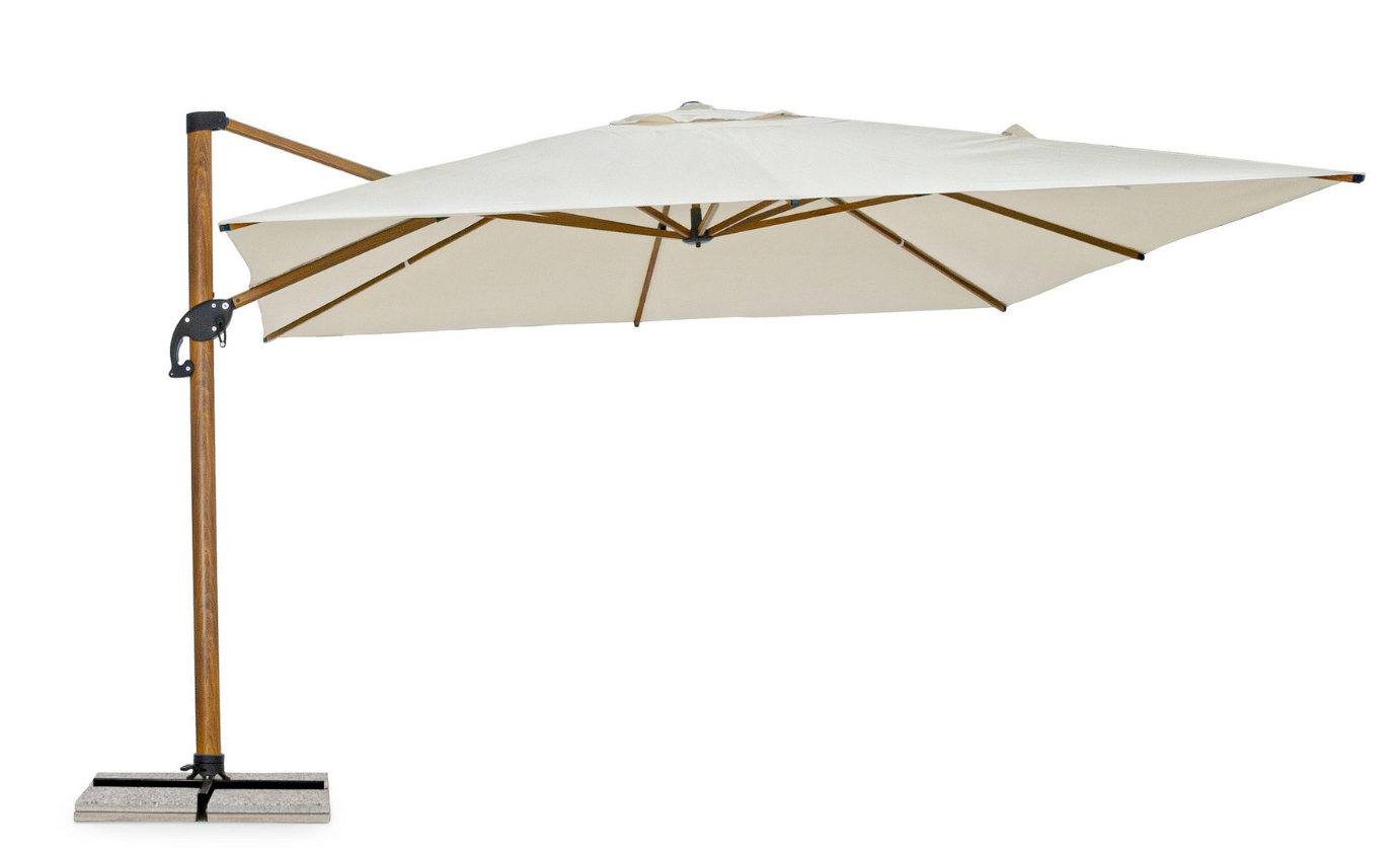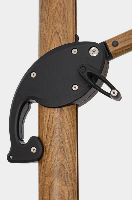 Solidny maszt o przekroju 105x65 mm stabilnie podtrzymuje olbrzymią czaszę (16 m²) w eleganckim, beżowym kolorze. Poszycie wykonano z grubego poliestru (250 g/m²) z powłoką poliamidową (PA), co zapewnia skuteczną barierę dla słońca. Orion oferuje wysoki komfort użytkowania: pedał w podstawie pozwala na obrót parasola o 360°, a specjalny uchwyt umożliwia aż 6-stopniową regulację nachylenia czaszy w pionie. Pozwala to na precyzyjne dopasowanie cienia do każdej pory dnia.
