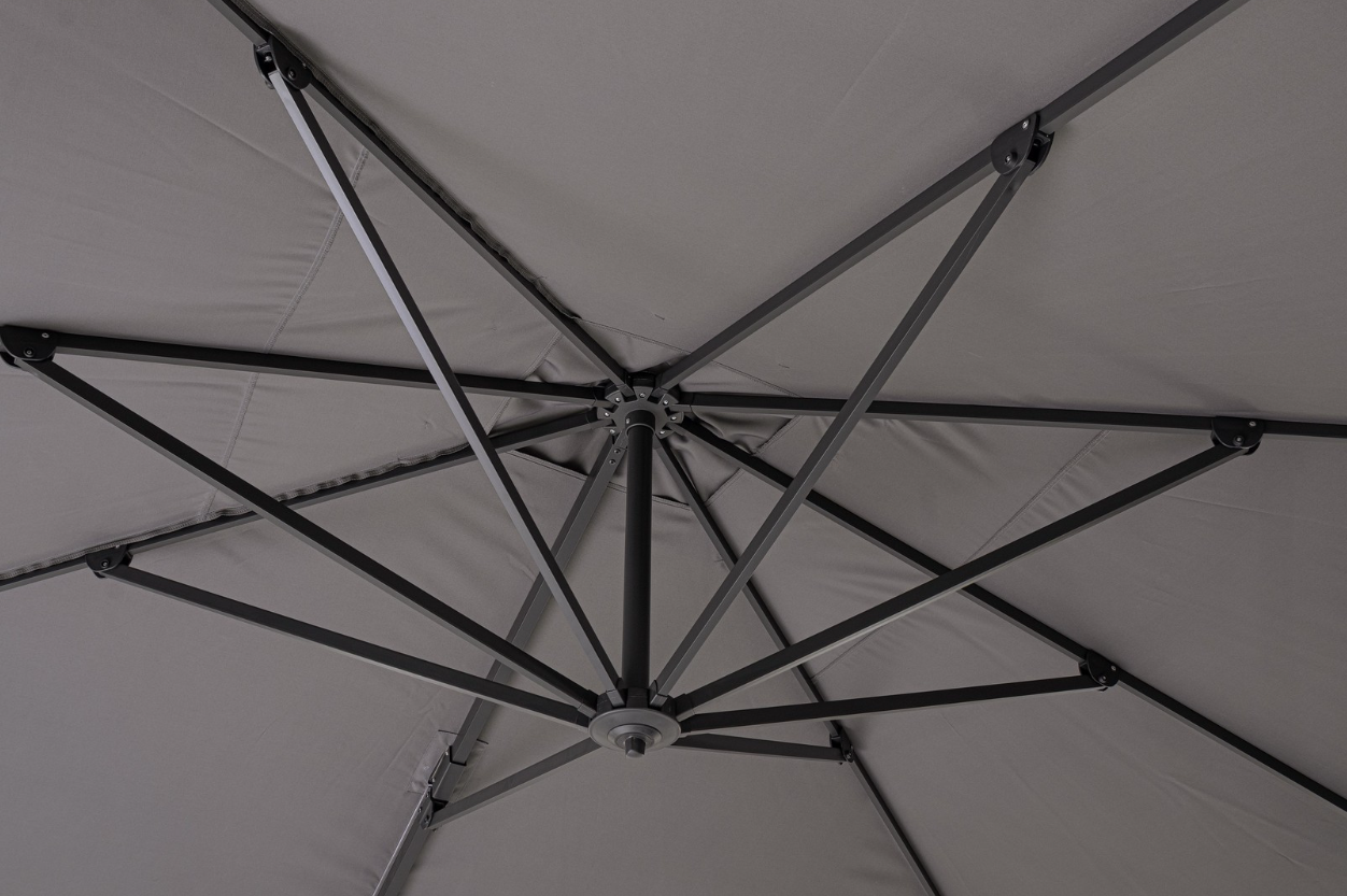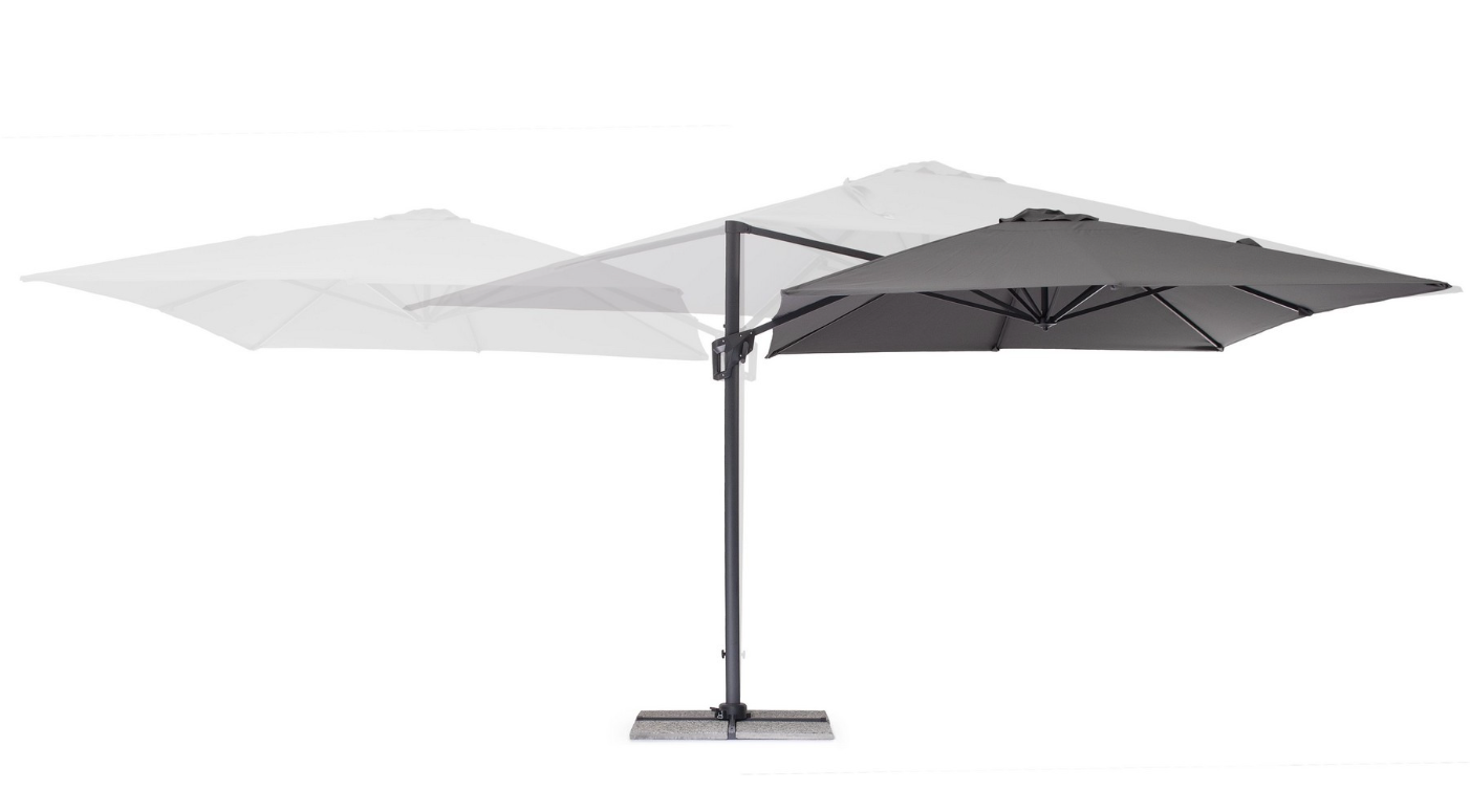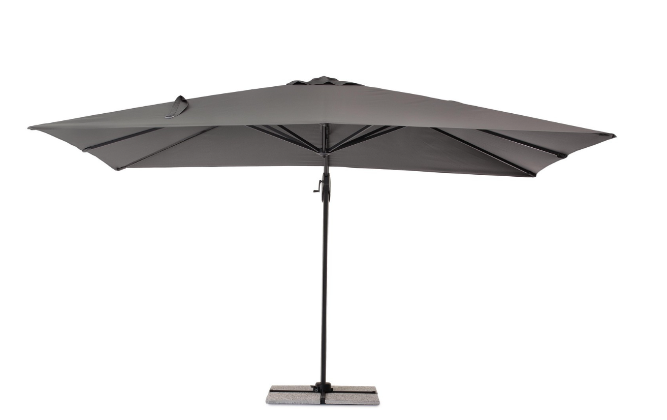 Prostokątna czasza o imponujących wymiarach 3x4 m wykonana jest z wysokiej jakości poliestru o gramaturze 250 g/m² z powłoką poliamidową (PA), co zapewnia trwałość i skuteczną ochronę. Dzięki umieszczeniu nogi z boku, przestrzeń pod parasolem pozostaje w całości do dyspozycji użytkownika. Komfort użytkowania podnosi system obrotu o 360°, pozwalający na zmianę położenia cienia bez konieczności przesuwania całej konstrukcji. W górnej części czaszy zastosowano otwór wentylacyjny, który wspomaga cyrkulację powietrza w upalne dni.