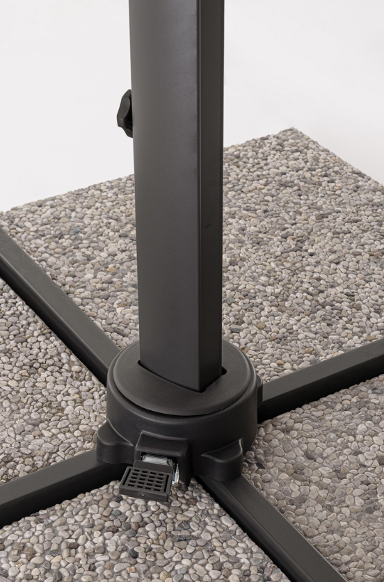 Stabilność parasola gwarantuje solidna, stalowa podstawa krzyżowa, którą dostarczamy w komplecie wraz z betonowymi obciążnikami.