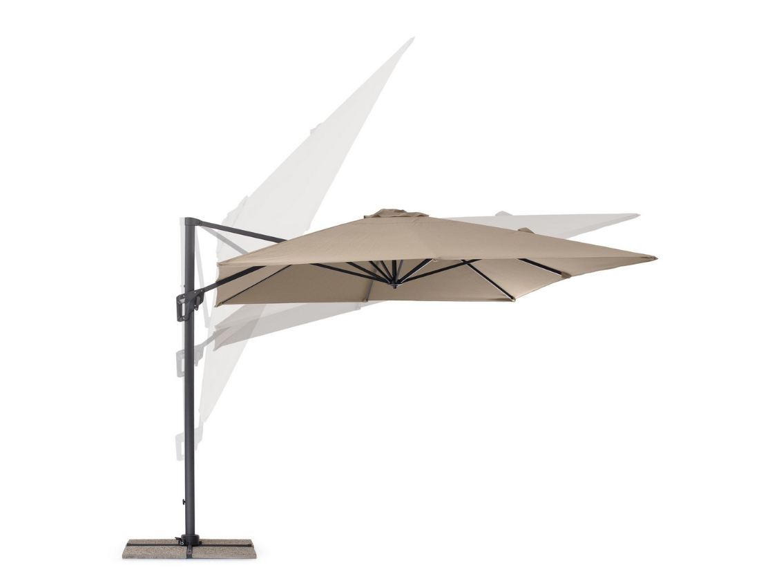 Prostokątna czasza o wymiarach 3x4 m została uszyta z wytrzymałego poliestru o gramaturze 250 g/m², dodatkowo zabezpieczonego warstwą poliamidu (PA), co zwiększa jej odporność na warunki zewnętrzne. Dzięki bocznej konstrukcji nogi, przestrzeń pod parasolem pozostaje w pełni otwarta, co ułatwia ustawienie mebli wypoczynkowych. Funkcjonalność modelu podnosi system obrotu o 360°, który umożliwia łatwe manewrowanie cieniem bez konieczności przestawiania bazy. W szczycie czaszy znajduje się otwór wentylacyjny (airvent), zapewniający cyrkulację powietrza.