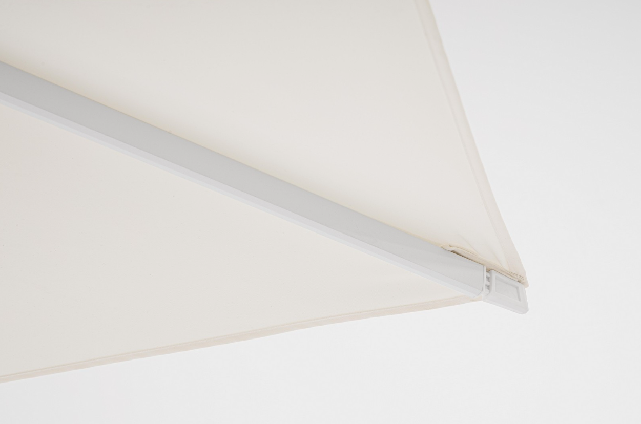 Parasol boczny Vega o wymiarach 3x3 m to propozycja, która wnosi do ogrodu powiew luksusu i nowoczesnej świeżości. Kwadratowy kształt czaszy idealnie koresponduje z symetrycznymi układami tarasowymi, a wykończenie typu „total white” – obejmujące zarówno aluminiowy stelaż, jak i poszycie – sprawia, że konstrukcja prezentuje się niezwykle lekko i elegancko. Biała powierzchnia doskonale odbija światło słoneczne, zapewniając jasną i przyjemną strefę cienia.