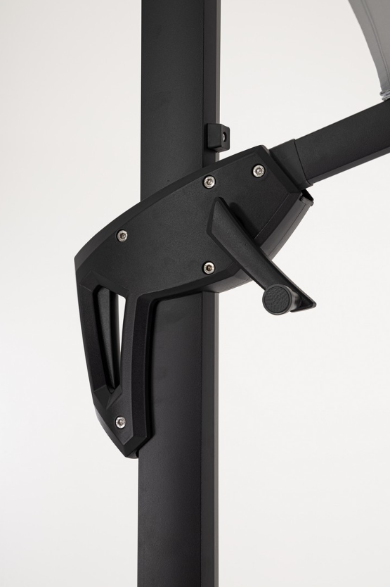 Konstrukcja oparta jest na solidnym maszcie z aluminium malowanego proszkowo, co zapewnia odporność na korozję. Czasza wykonana z poliestru o gramaturze 250 g/m² z powłoką poliamidową (PA) gwarantuje trwałość i skuteczną ochronę przeciwsłoneczną. Dzięki bocznej nodze, cała powierzchnia 9 m² pod parasolem jest dostępna do zagospodarowania. Model Vega oferuje funkcjonalną regulację: mechanizm obrotu o 360° sterowany pedałem oraz uchwyt do 5-stopniowej zmiany nachylenia czaszy w pionie pozwalają precyzyjnie sterować cieniem.