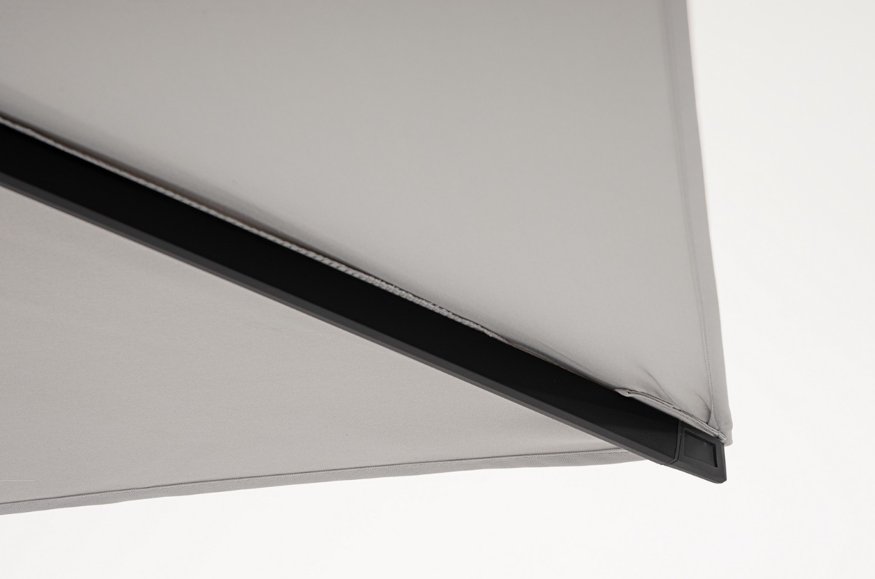 Parasol boczny Vega w rozmiarze 3x3 m to idealne rozwiązanie dla osób ceniących geometryczny ład i nowoczesną stylistykę. Kwadratowa czasza doskonale wpisuje się w symetryczne układy tarasowe, a zastosowana kolorystyka przyciąga wzrok elegancją: antracytowy stelaż tworzy wyrazistą, nowoczesną ramę dla jasnoszarego poszycia. To połączenie, które dodaje przestrzeni lekkości i klasy.