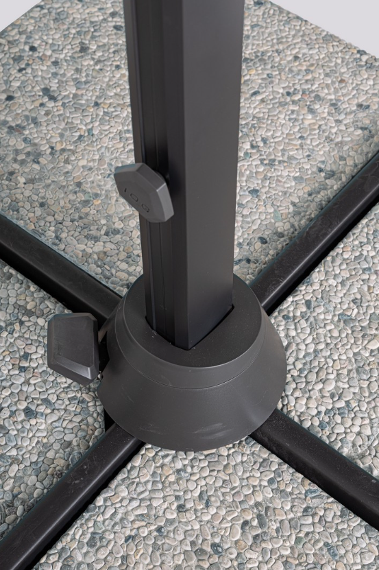 Zestaw zawiera: Parasol, bazę, obciążniki betonowe oraz pokrowiec