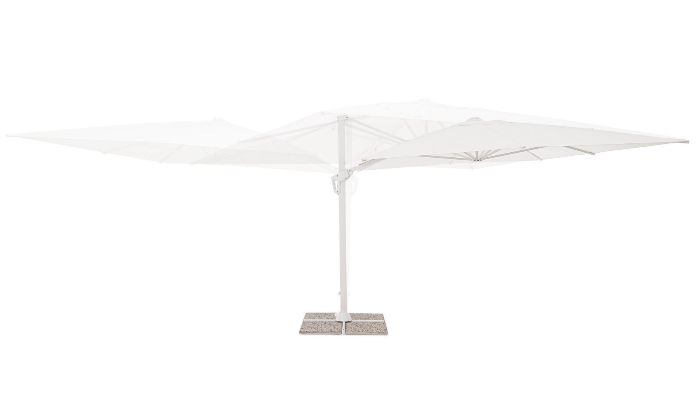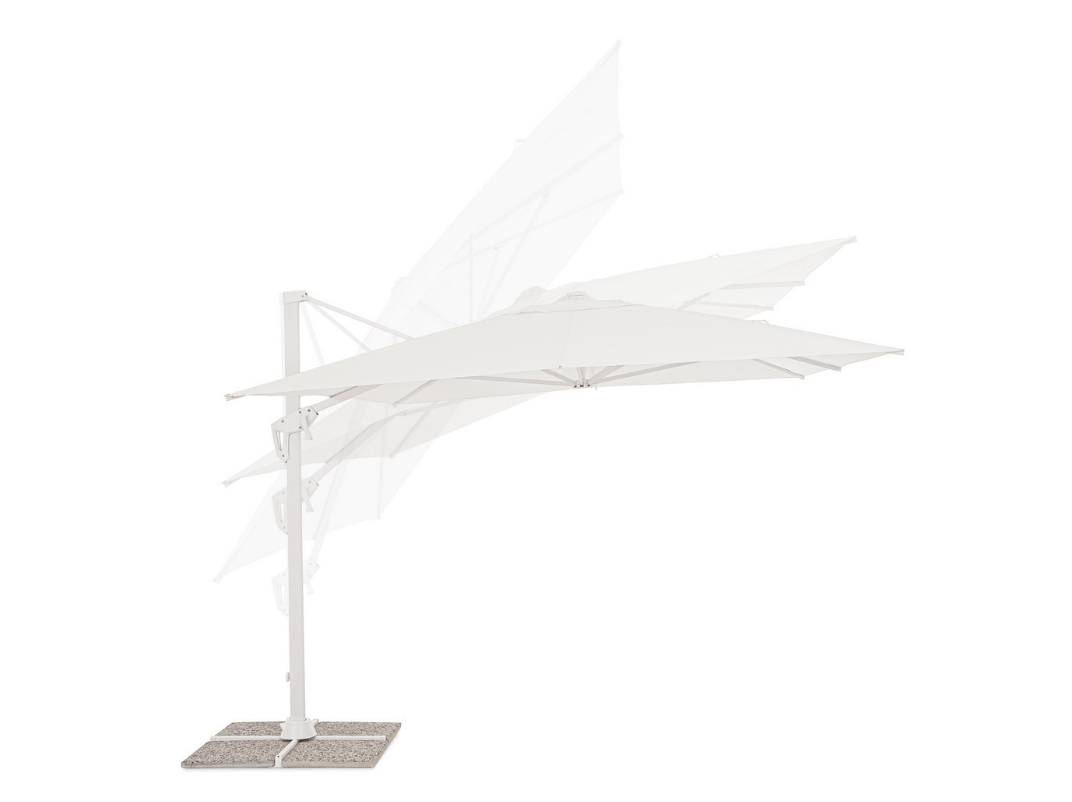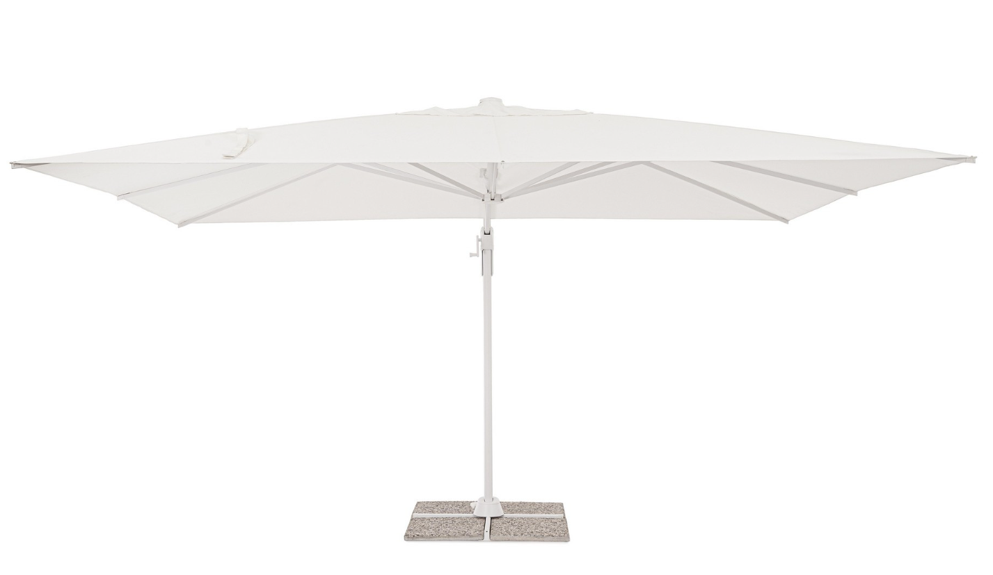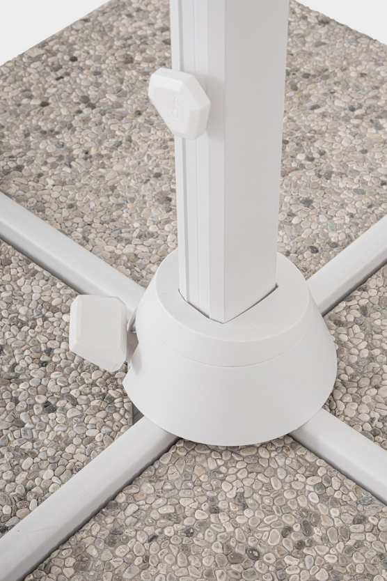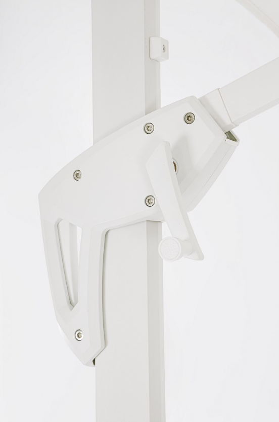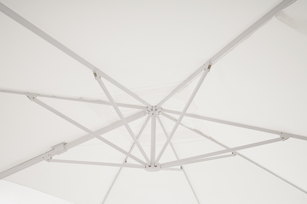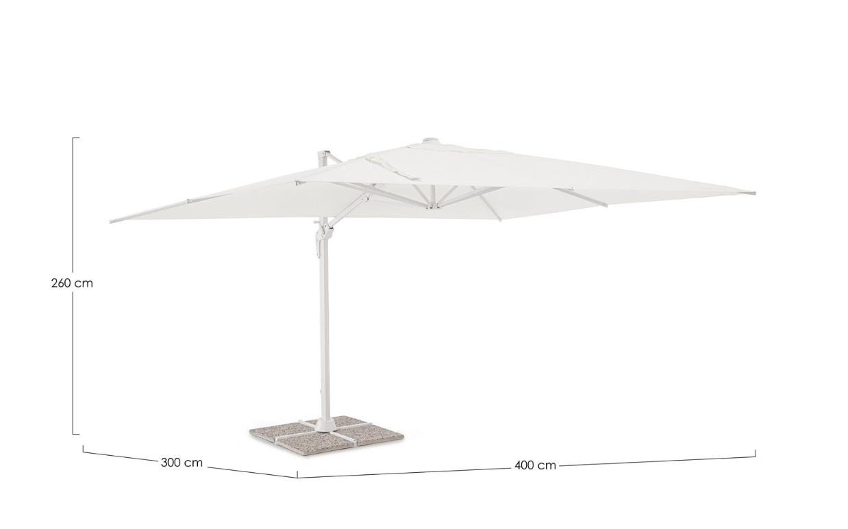 Prostokątna czasza o wymiarach 3x4 m wykonana jest z wysokogatunkowego poliestru o gramaturze 250 g/m², wzmocnionego powłoką poliamidową (PA). Boczna noga sprawia, że przestrzeń pod parasolem jest w pełni funkcjonalna i łatwa do aranżacji. Vega White oferuje pełen komfort obsługi: system obrotu o 360° uruchamiany pedałem oraz wygodny uchwyt do 5-stopniowej regulacji nachylenia czaszy w pionie pozwalają na idealne dopasowanie cienia do pory dnia. Wiatrołap w szczycie parasola dba o cyrkulację powietrza.