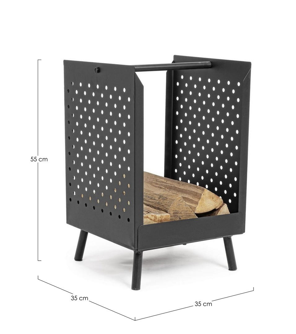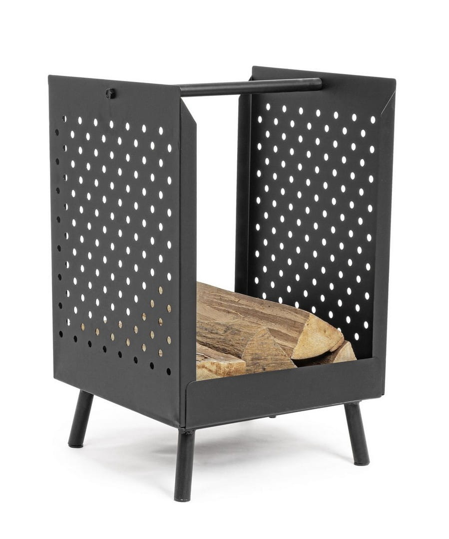 Nowoczesny stojak Efesto w całości został wykonany ze stali malowanej proszkowo, odpornej na działanie wysokich temperatur. Składa się z prostokątnej bryły wspartej na czterech, skośnych nóżkach, zapewniających dobrą stabilizację. Posiada otwartą konstrukcję, z dwoma zabudowanymi bokami o perforowanej powierzchni. Ułożone w nim kawałki drewna będą pięknie wyeksponowane, tworząc wyjątkowy element dekoracyjny. Dzięki wbudowanej rączce bez przeszkód przeniesiesz go w inne miejsce, dostosowując do swoich aktualnych potrzeb.