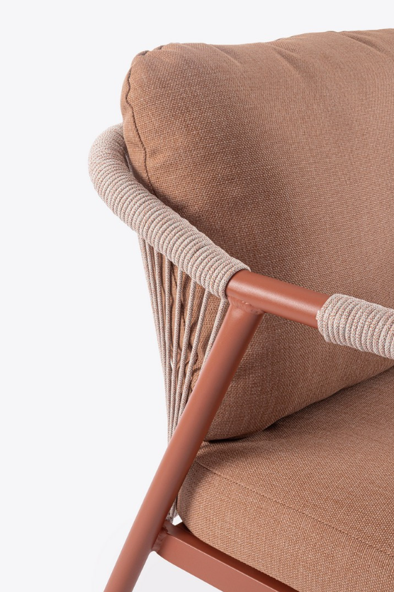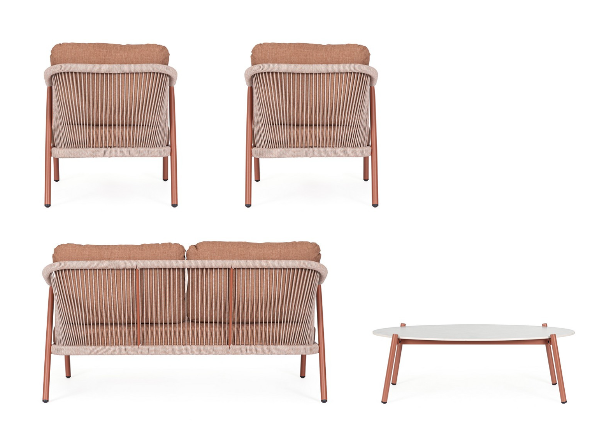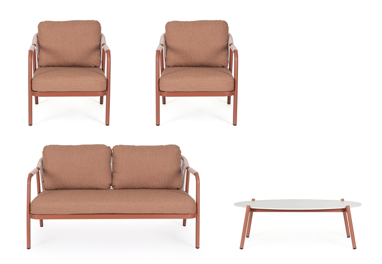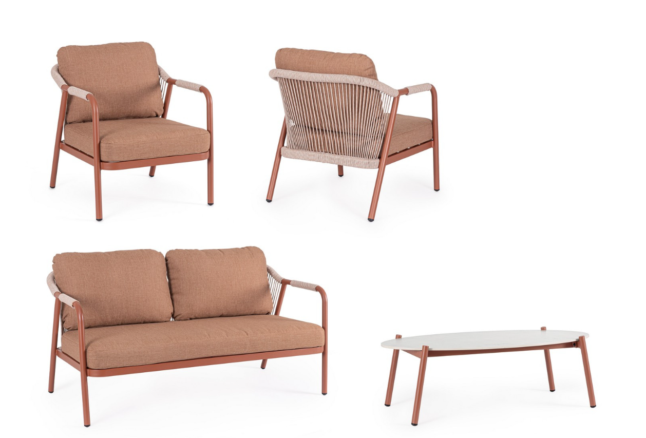 Zestaw wypoczynkowy Miravet w unikalnym, rdzawym wydaniu to luksusowa propozycja od włoskiej marki Bizzotto, która wprowadza na taras ciepły, śródziemnomorski klimat. Cała konstrukcja mebli została wykonana z aluminium malowanego proszkowo w odcieniu miedziano-rdzawym, co zapewnia bryłom wyjątkowy wygląd oraz całkowitą odporność na korozję i zmienne warunki atmosferyczne.