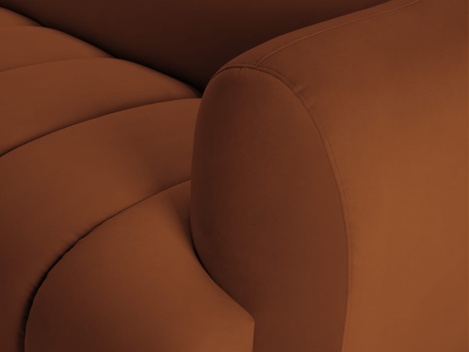 Sofa Harry jest tapicerowana tkaniną welurową - Casino terakota. Materiał obiciowy Casino jest grubym, wyjątkowo miękkim welurem o bardzo subtelnym połysku i jednolitej, gładkiej powierzchni. Delikatna, pluszowa struktura jest przyjemna w dotyku i ma szykowny wygląd. Ta wysokiej jakości tkanina prezentuje się na meblach elegancko i szlachetnie. Jednocześnie nadaje im przytulnego charakteru. Materiał Casino jest odporny na ścieranie oraz zadrapania, co czyni go doskonałym wyborem dla właścicieli zwierząt. Dodatkowo, tkanina wykazuje odporność na plamy i wolno wchłania płyny, co znacznie ułatwia jej czyszczenie, gwarantując długotrwałą trwałość i nienaganny wygląd.