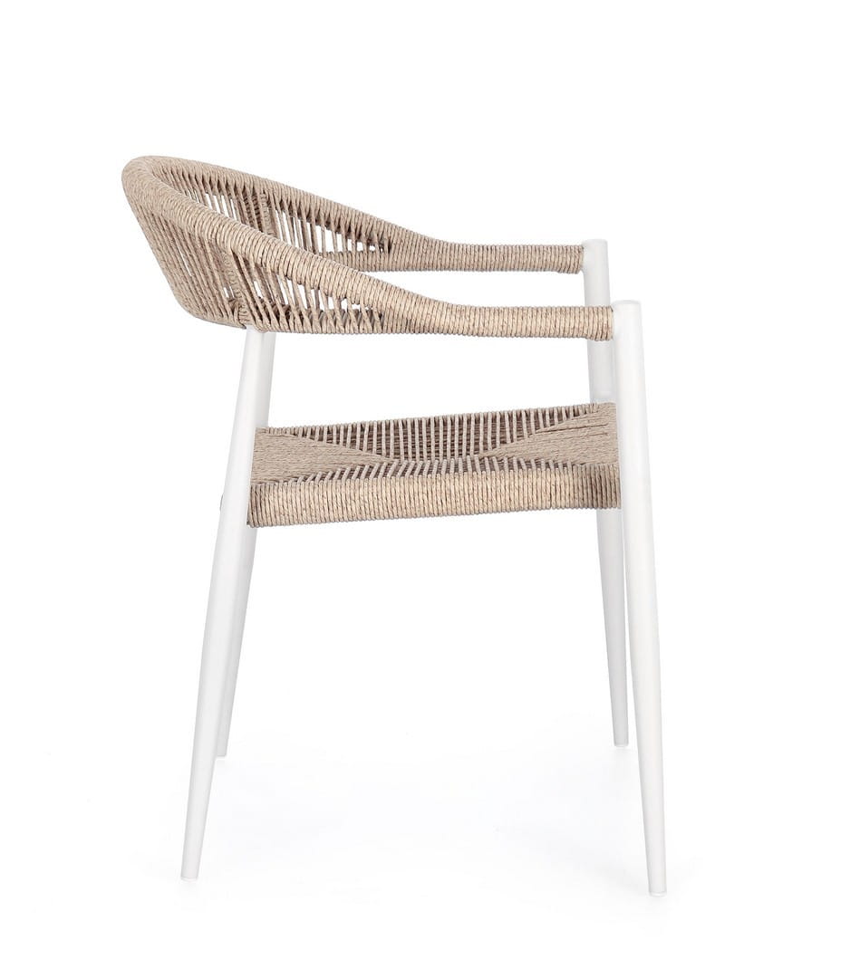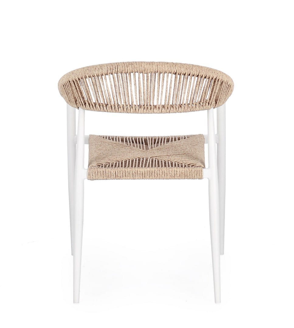Krzesło ogrodowe Jandia to połączenie stylu boho z nowoczesnym designem. Lekką, a jednocześnie solidną konstrukcję wykonano z malowanego proszkowo aluminium w białym kolorze, które zapewnia odporność na warunki atmosferyczne. Oparcie oraz siedzisko oplata syntetyczne włókno typu „twisted”, wiernie imitujące naturalne materiały i nadające całości wyjątkowego charakteru.
