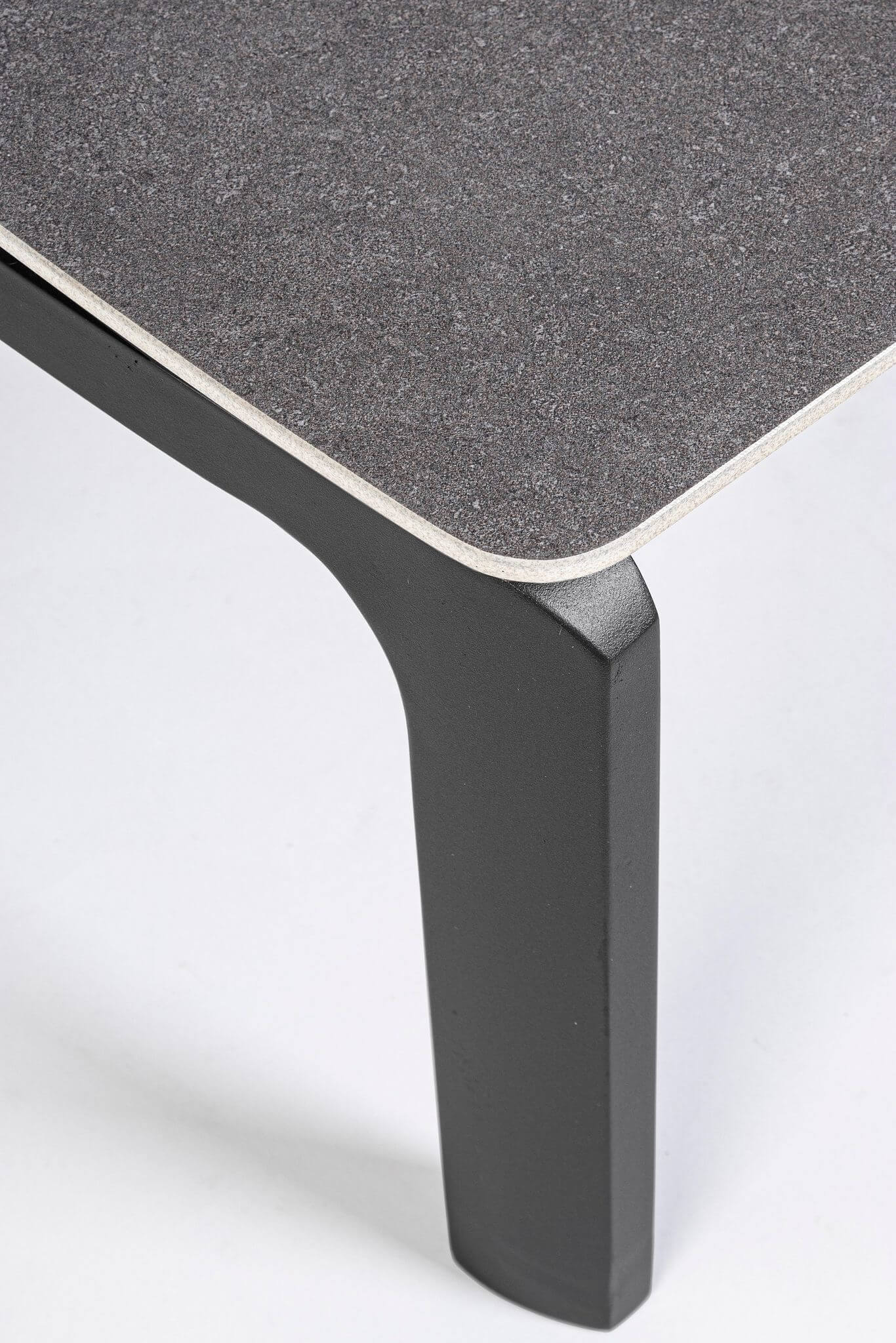 Rama ciemnego ogrodowego stolika wykonana jest z aluminium pokrytego poliestrową powłoką, co zapewnia trwałość i odporność na warunki atmosferyczne.