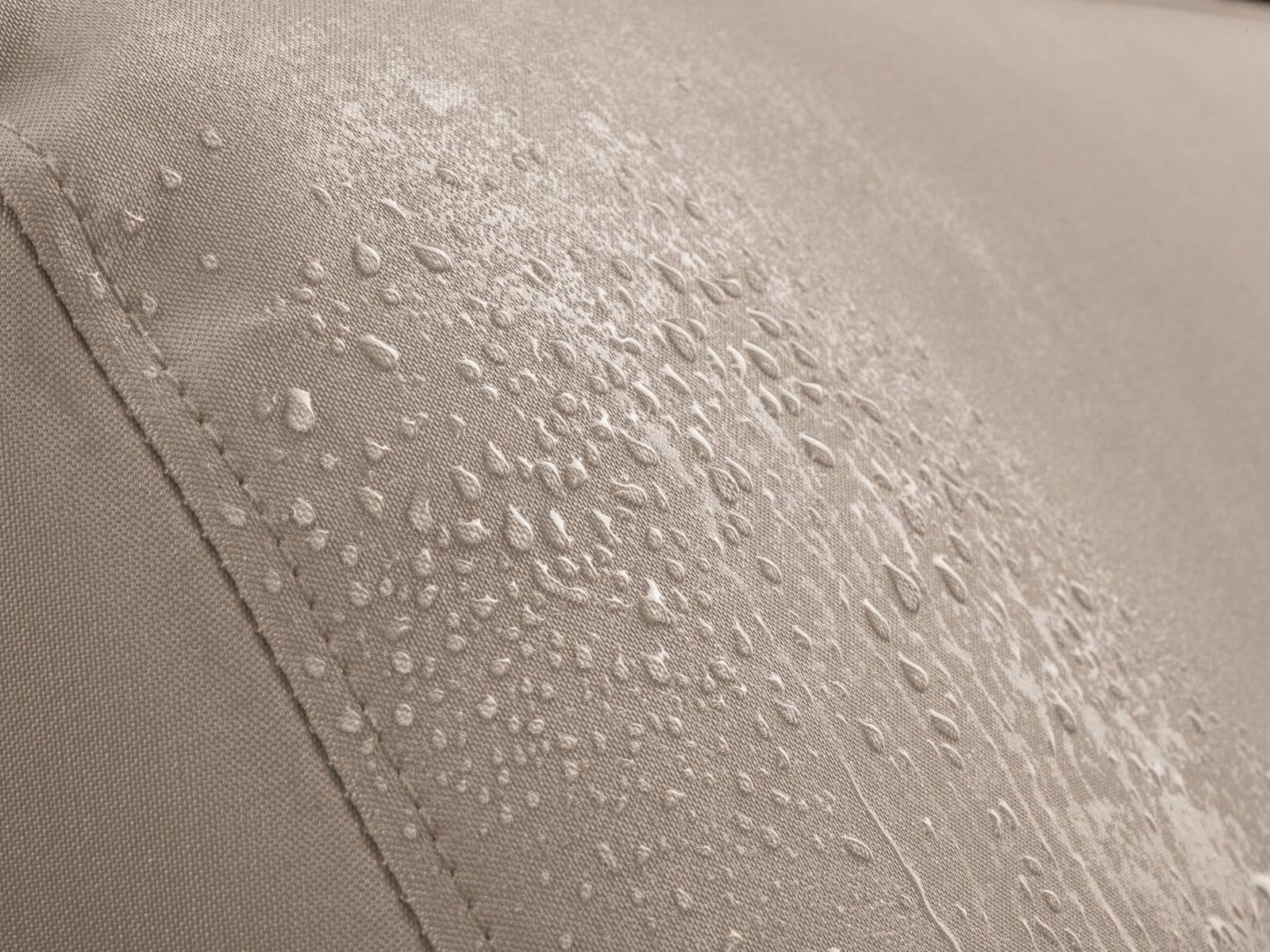 Ogrodowy stolik kawowy pokryty jest beżową tkaniną Vinylpex (kolor W08), która posiada powłokę hydrofobową, zapobiegającą wchłanianiu płynów. Ponadto materiał jest niezwykle odporny na ścieranie (test Martindale 102500, 695 g/m², skład powłoki: 95% PVC, 5% PU). Tkanina posiada powłokę antybakteryjną.