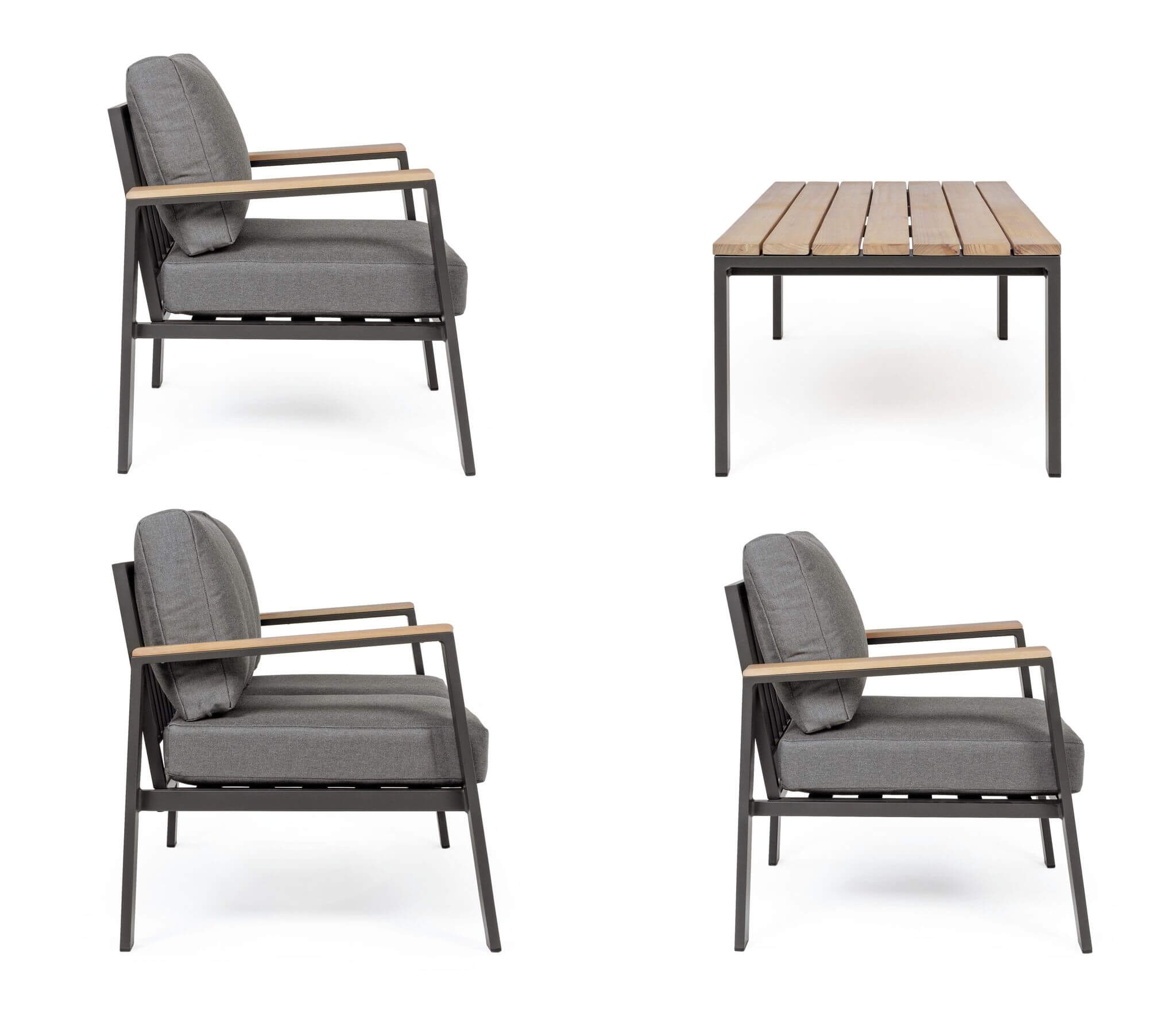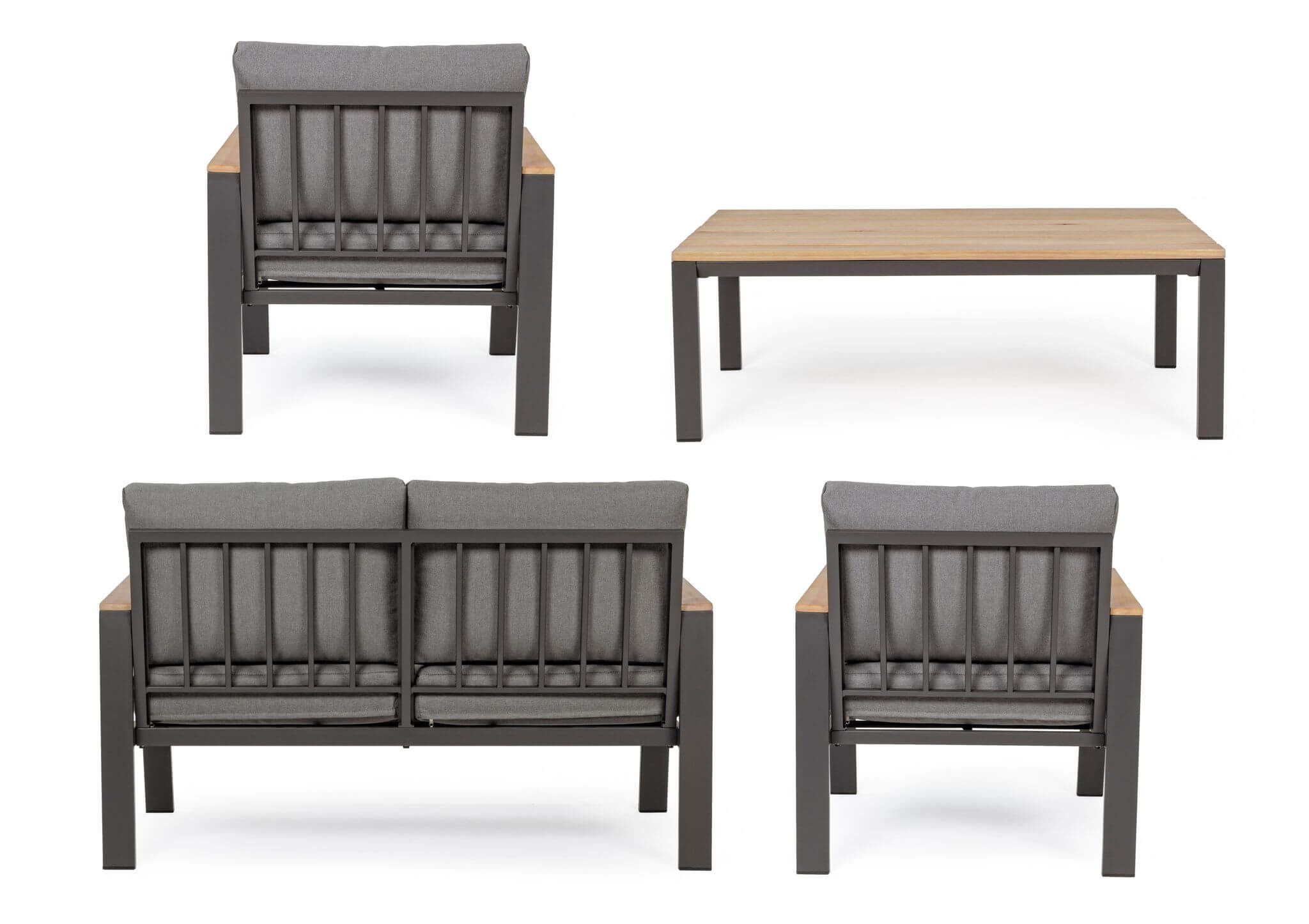 Na zestaw antracytowych mebli do ogrodu Belmar składają się cztery elementy: 2-osobowa sofa, dwa fotele oraz ogrodowy stolik kawowy.