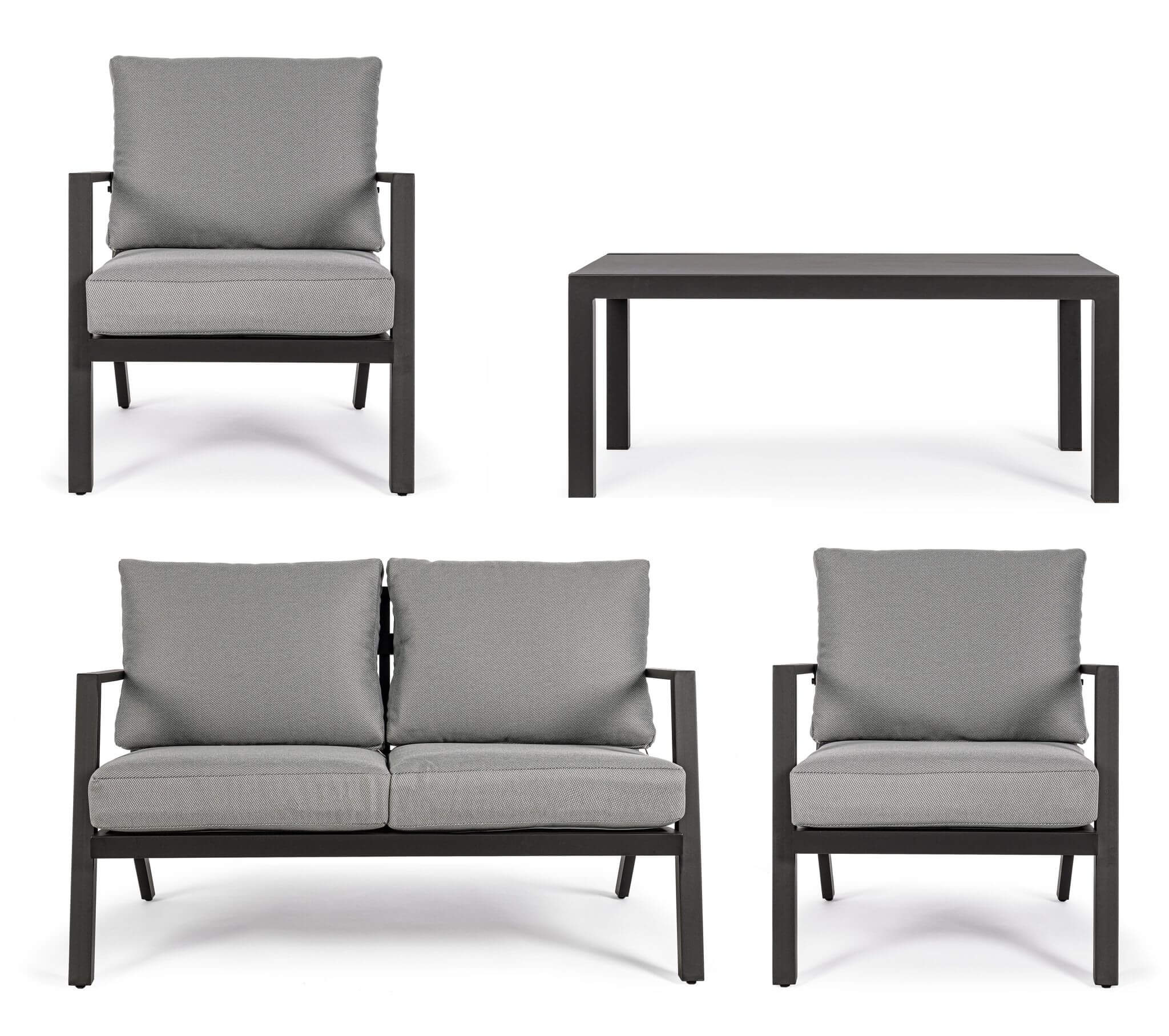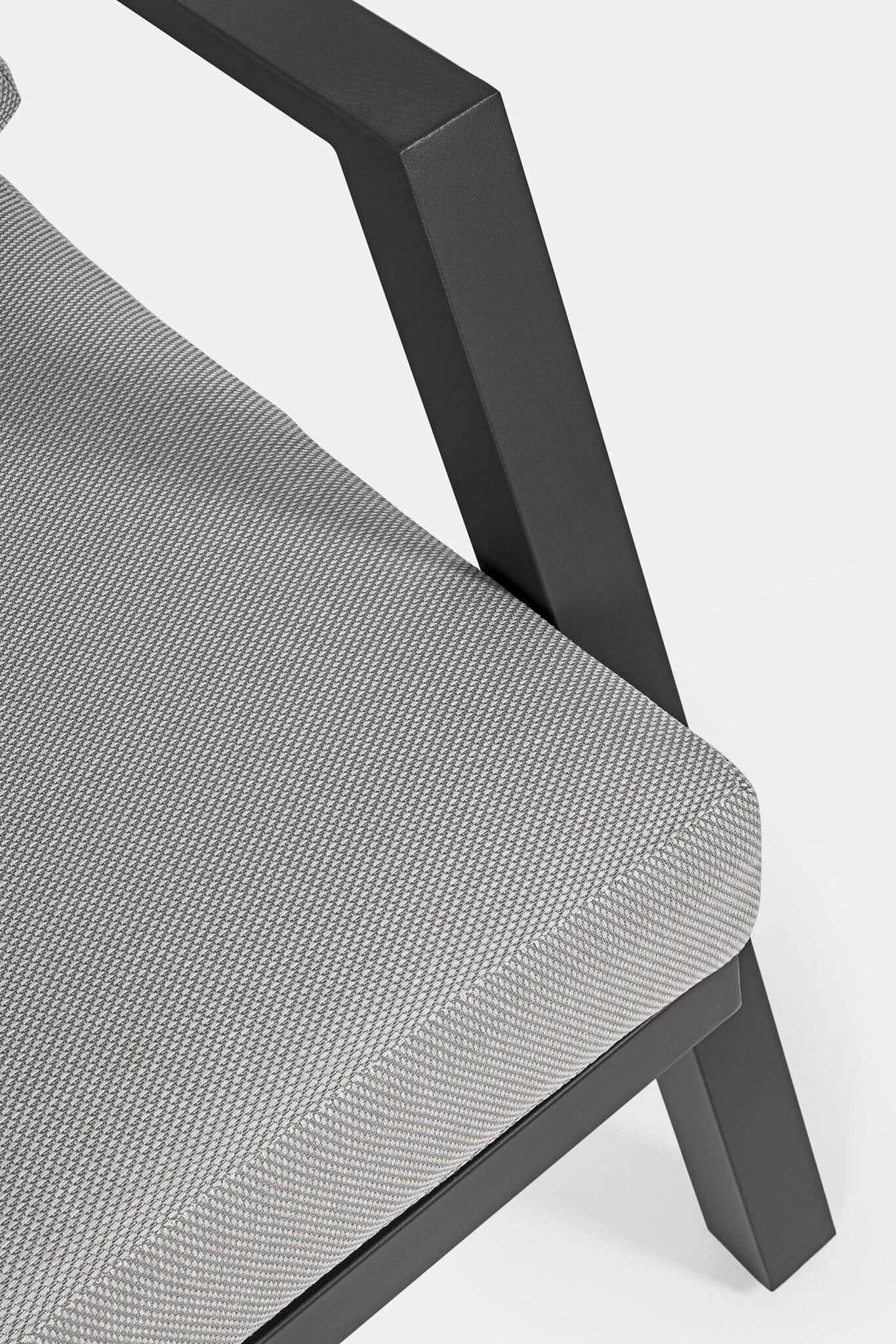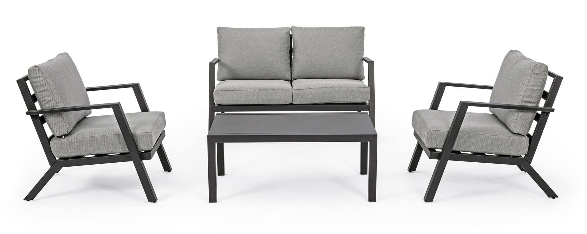 Zestaw nowoczesnych, wypoczynkowych mebli ogrodowych Harley z antracytowymi konstrukcjami i szarymi poduszkami. Projektu włoskiej marki Bizzotto.