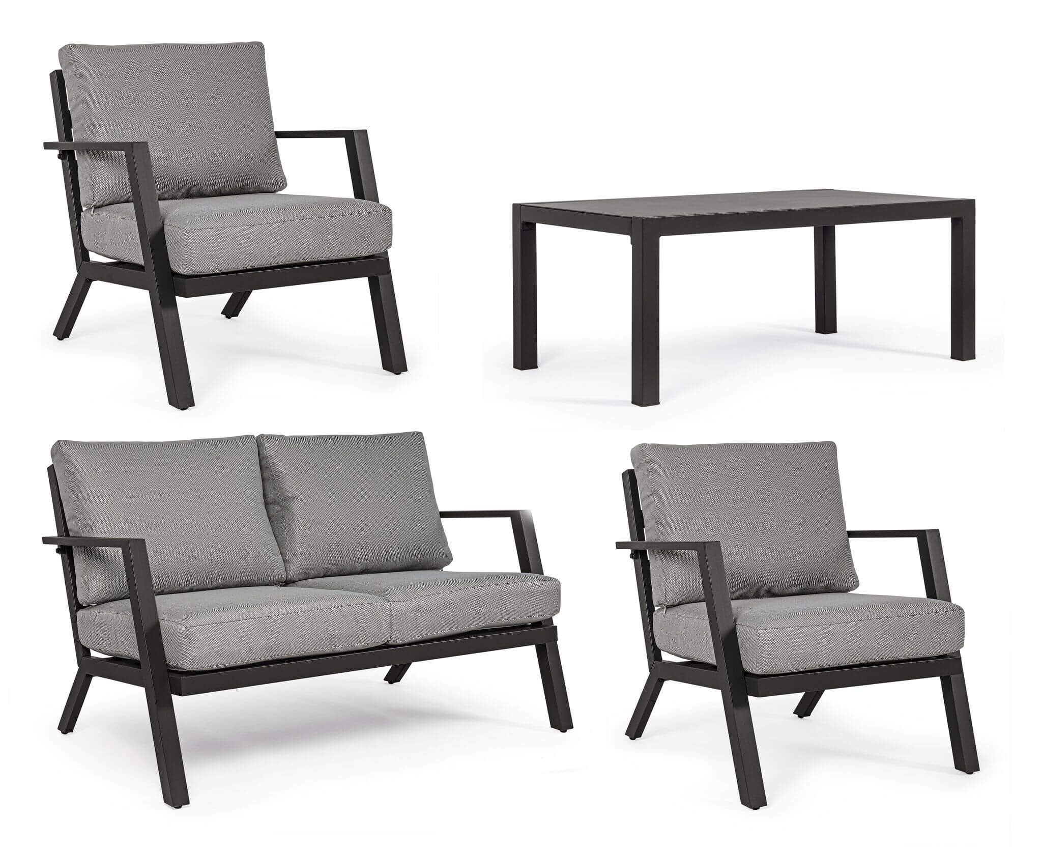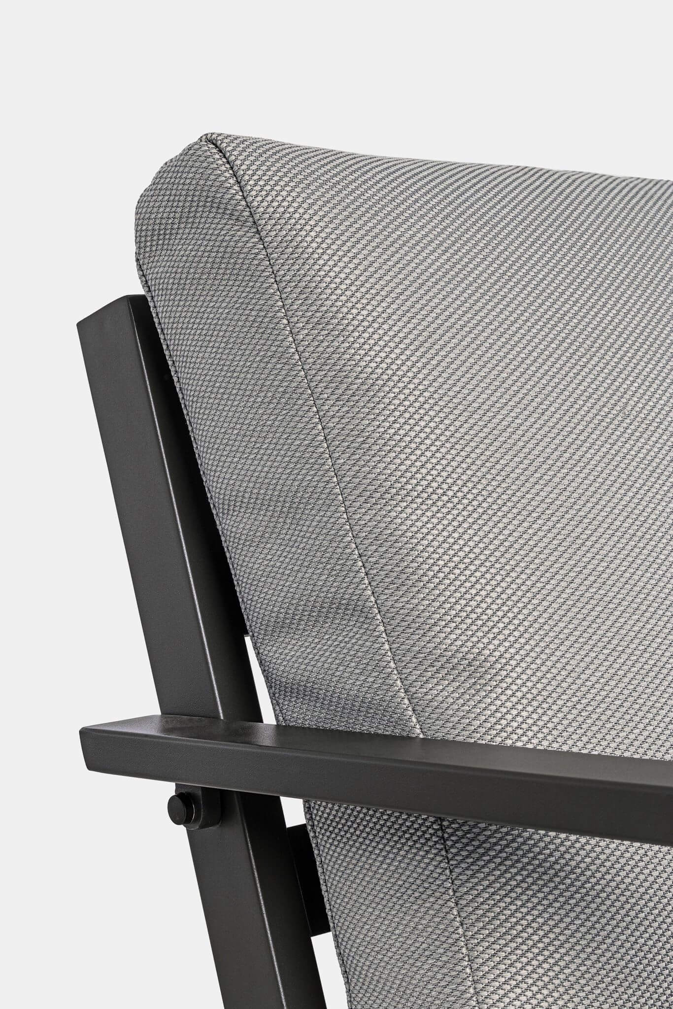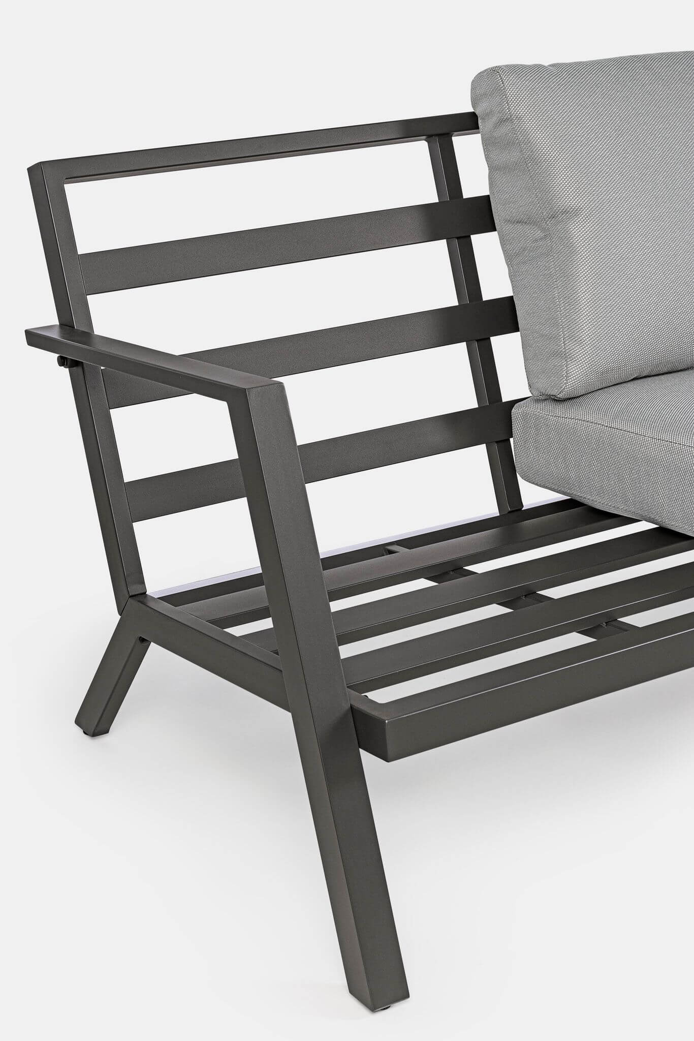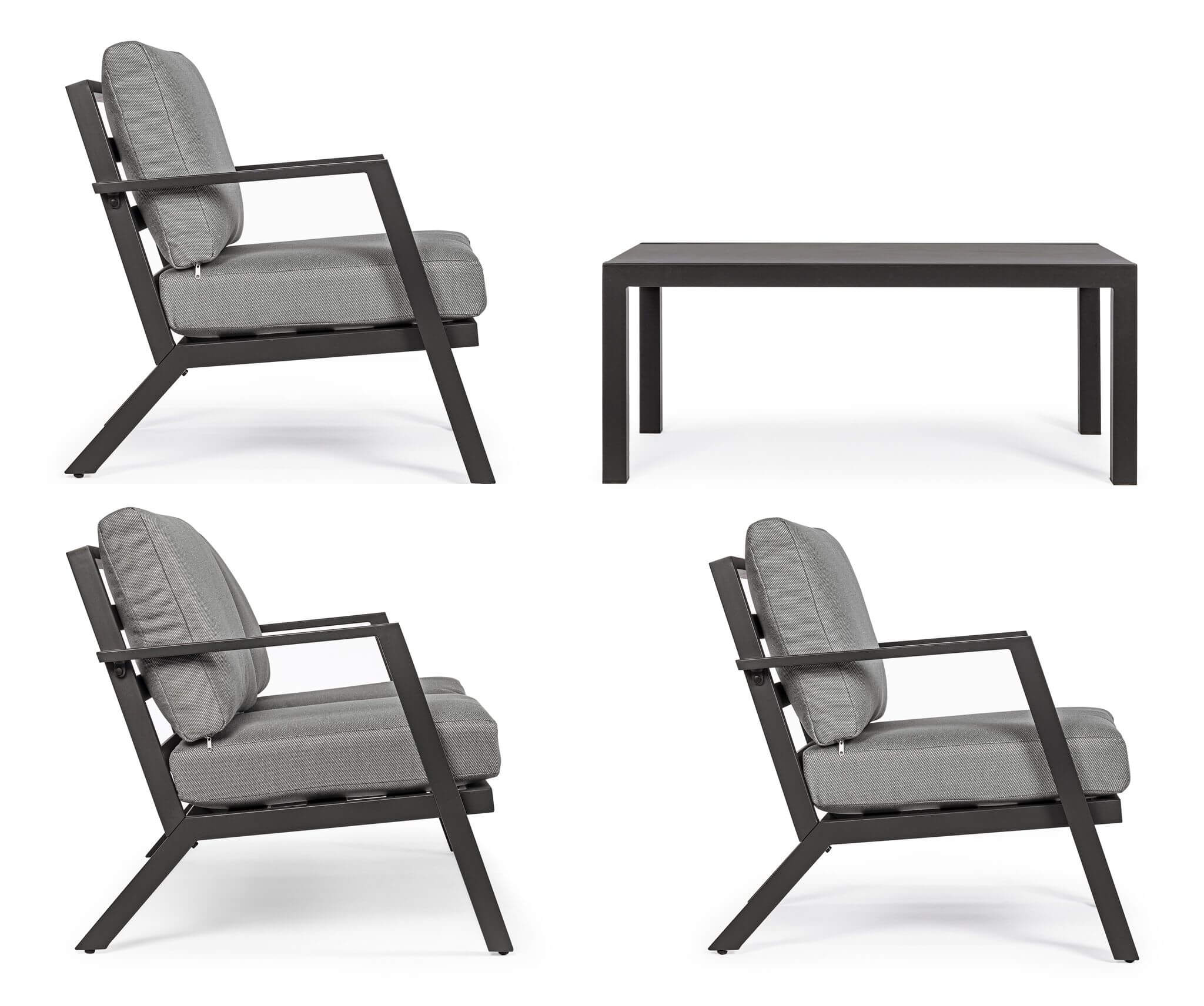Zestaw nowoczesnych, wypoczynkowych mebli ogrodowych Harley z antracytowymi konstrukcjami i szarymi poduszkami. Projektu włoskiej marki Bizzotto.
