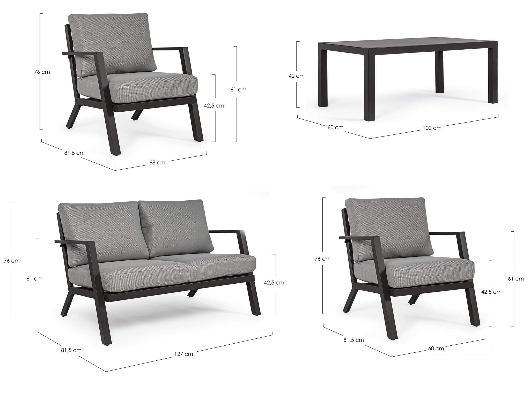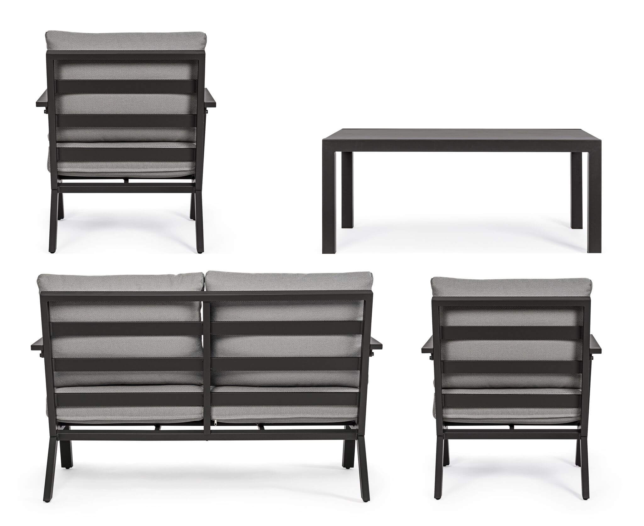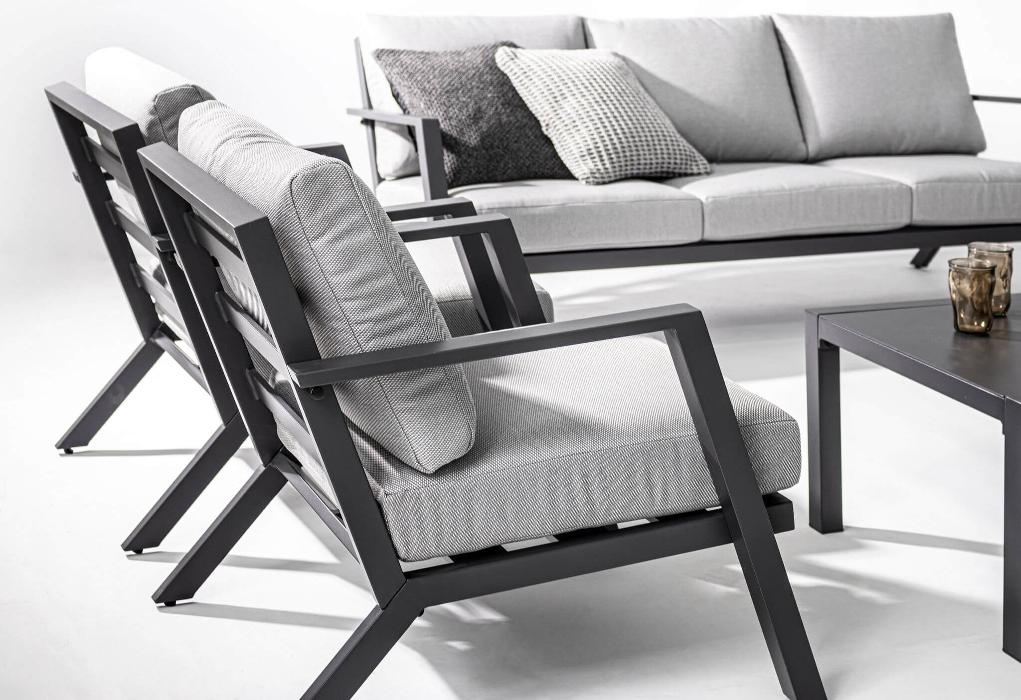 Na komplet antracytowych mebli tarasowych składają się cztery elementy: 2-osobowa sofa, dwa fotele oraz ogrodowy stolik kawowy.
