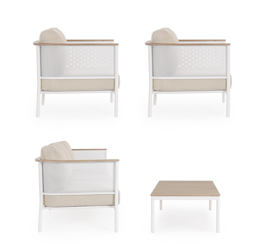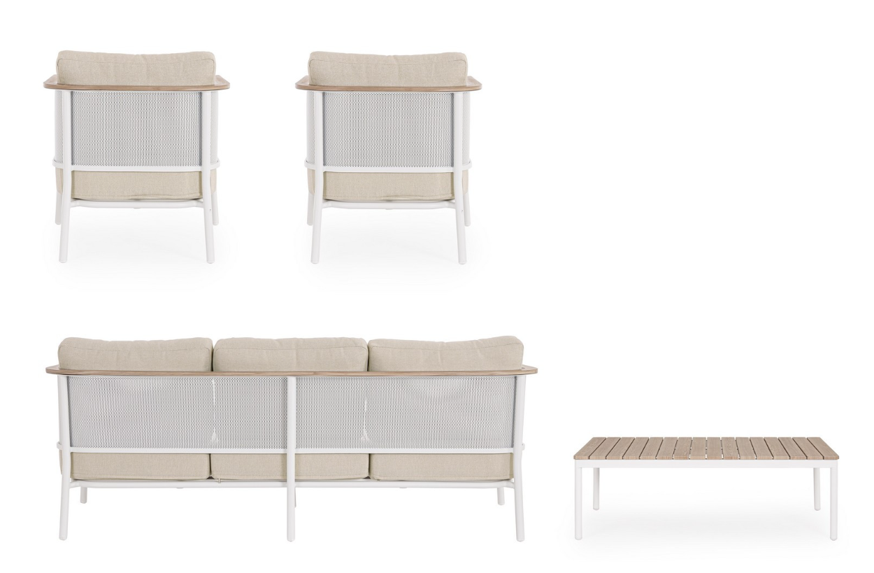 Zestaw Ulises to propozycja dla osób, które chcą przenieść wygodę domowego salonu na świeże powietrze. W skład kompletu wchodzi przestronna sofa trzyosobowa, dwa obszerne fotele oraz stolik kawowy. Całość utrzymana jest w jasnej, piaskowej kolorystyce, która nadaje aranżacji lekkości i nowoczesnego sznytu.