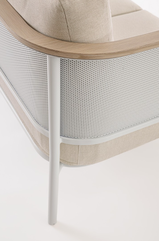 Konstrukcja mebli opiera się na aluminium malowanym proszkowo, co zapewnia całkowitą odporność na korozję. Projektanci zadbali o unikalne detale: podłokietniki oraz blat stolika pokryto powłoką, która perfekcyjnie imituje naturalne drewno. Dzięki temu zestaw zyskuje ciepły, przytulny charakter, pozostając jednocześnie w pełni bezobsługowym. Uwagę zwracają również tyły mebli, wykończone efektowną, aluminiową siatką, co sprawia, że zestaw prezentuje się atrakcyjnie z każdej strony.