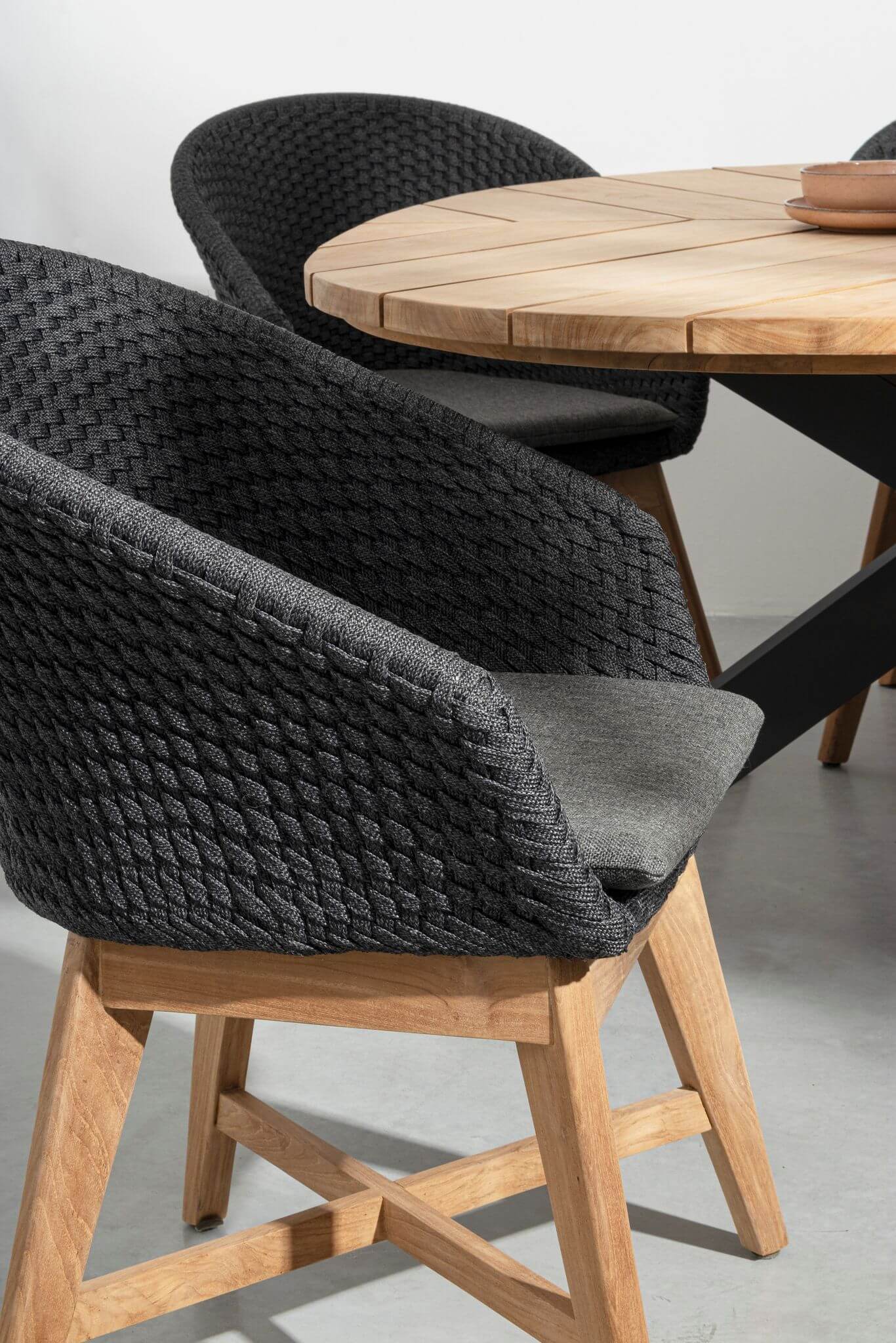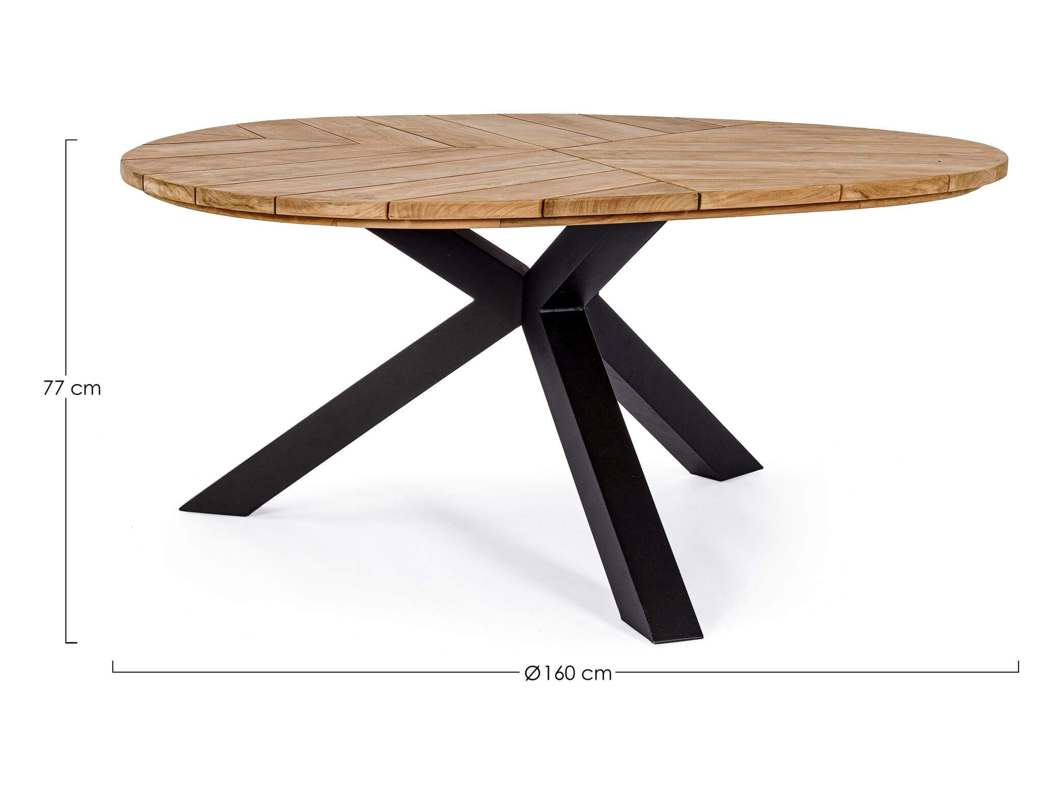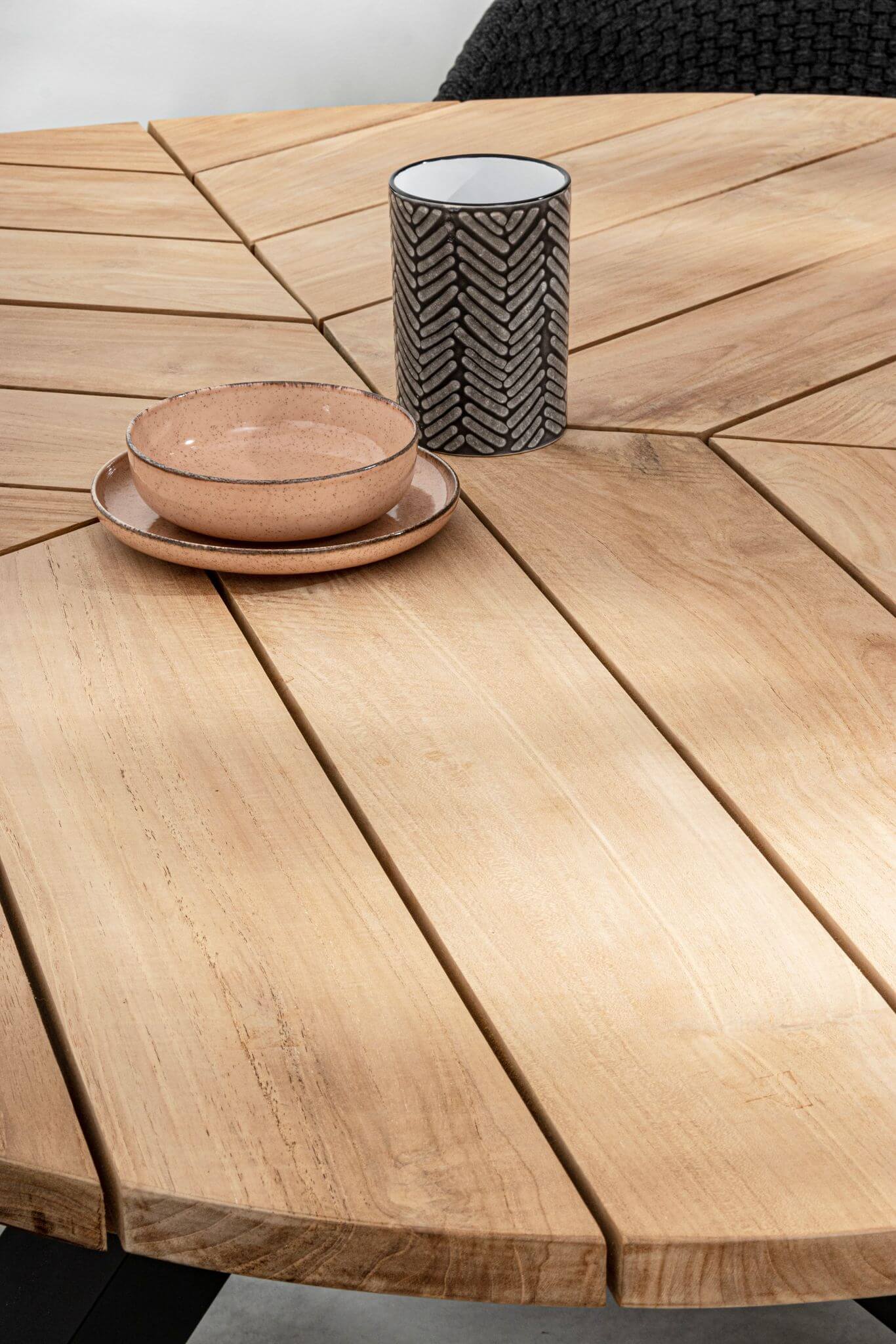 Blat ogrodowego stołu zrobiony jest z drewna tekowego (klasa A) z certyfikatem SVLK, świadczącym o legalności pozyskania materiału. Aluminiowe, czarne nogi malowane są proszkowo poliestrem. Śruby ze stali ocynkowanej.