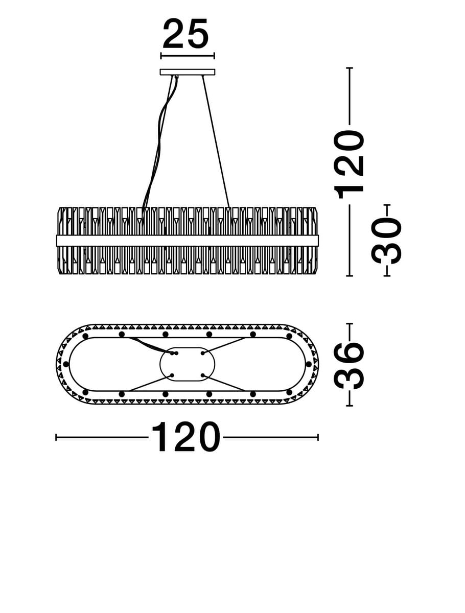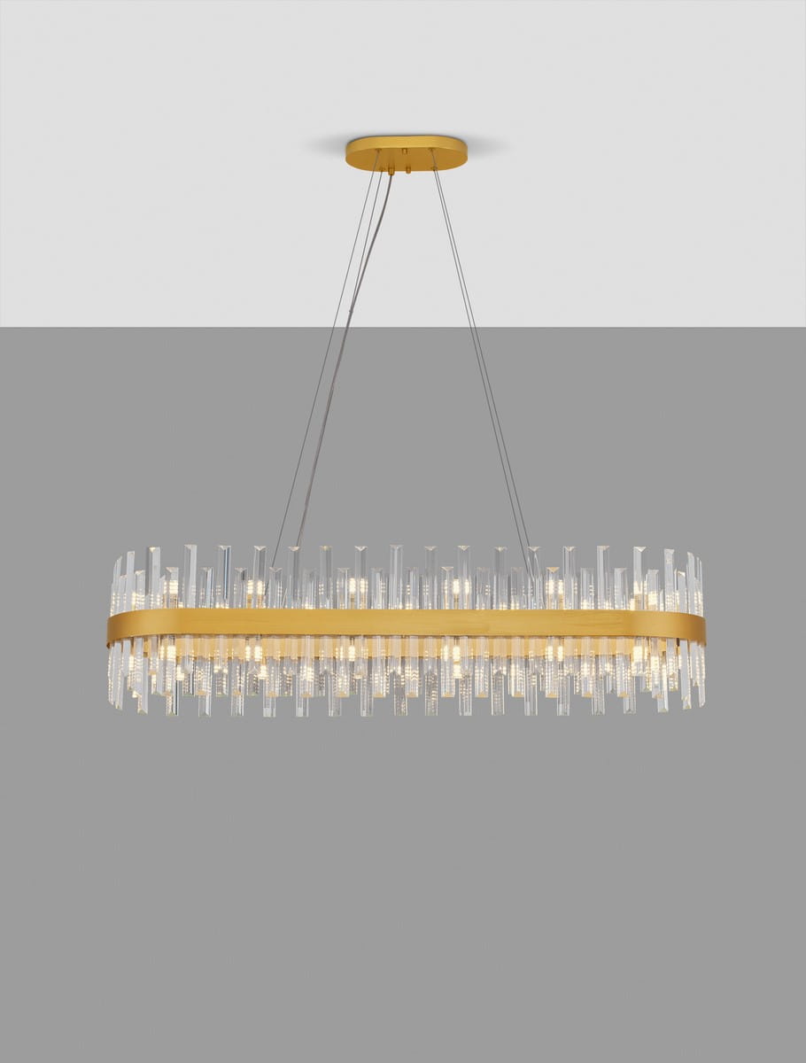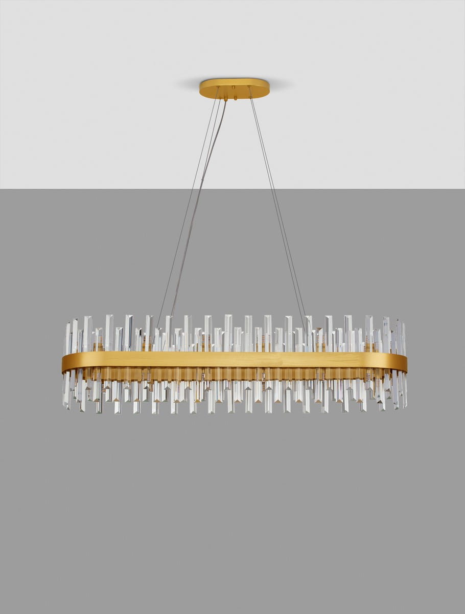 Klosz lampy ma owalną formę i składa się z metalowej obręczy w kolorze złota, na której osadzone są transparentne kryształowe elementy. Powierzchnia metalowych elementów jest gładka i lekko połyskująca, co doskonale współgra z kryształowymi detalami.